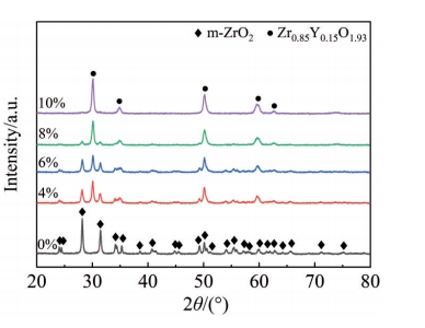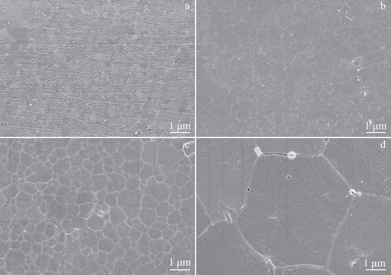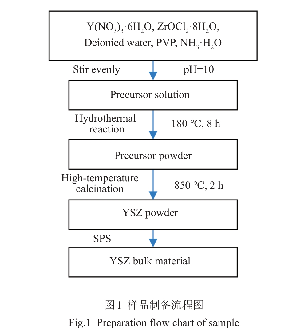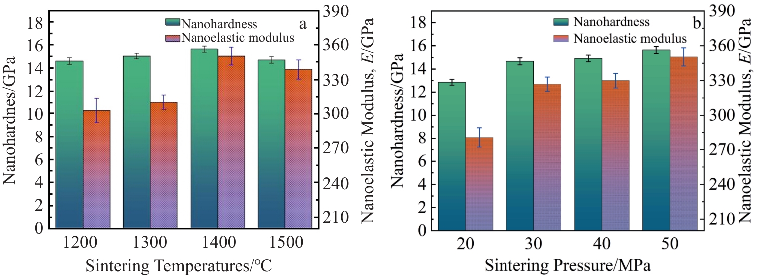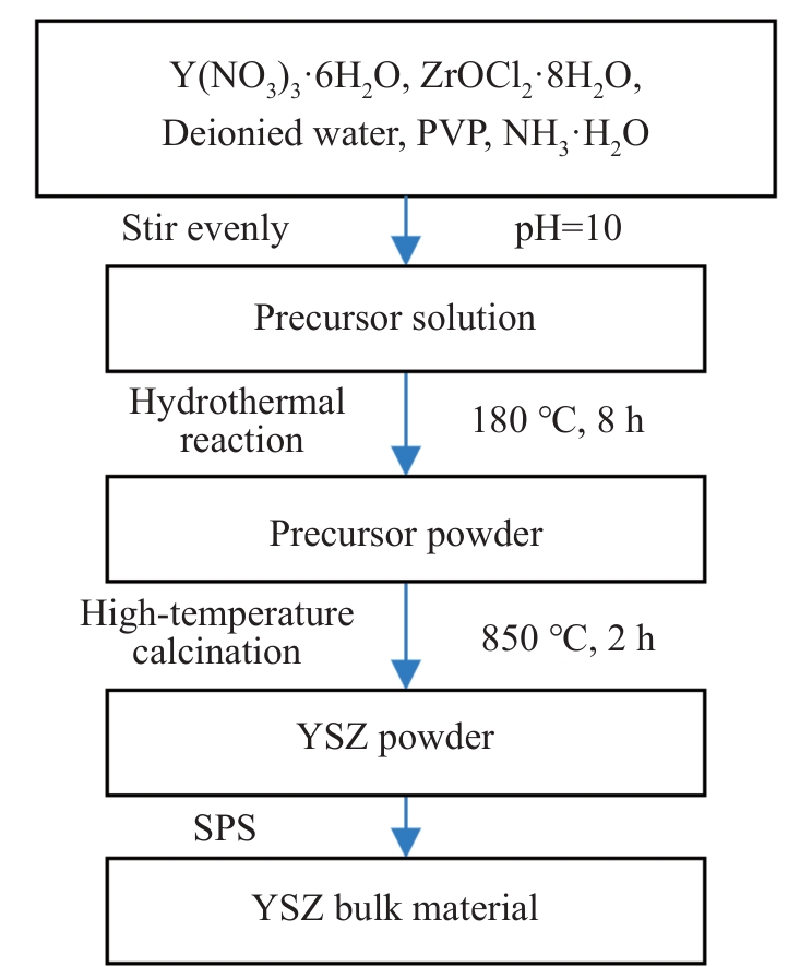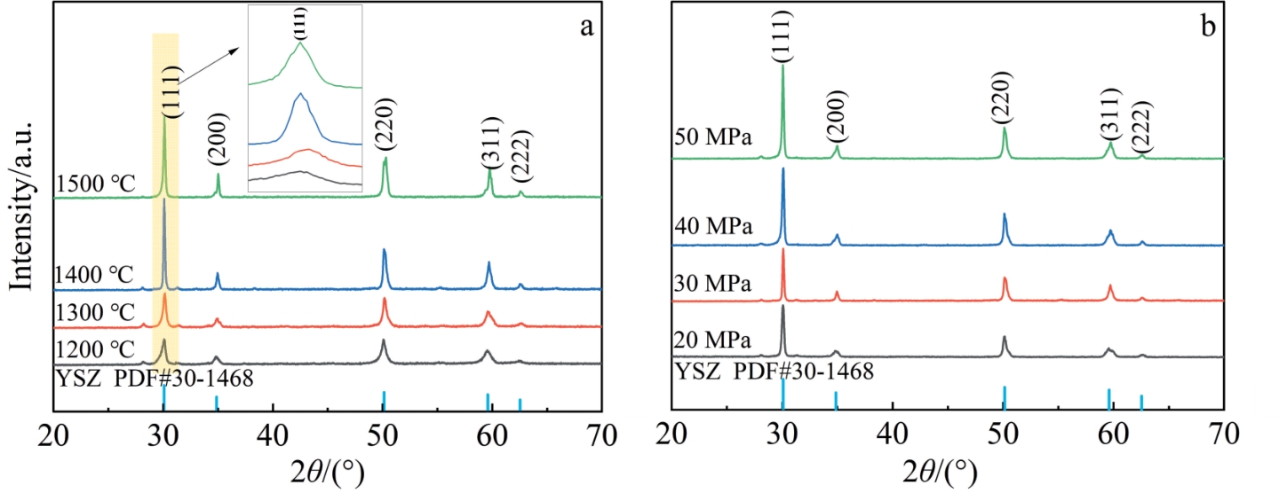 Abstract:Yttria-stabilized zirconia (YSZ) powder was synthesized by hydrothermal method using yttrium nitrate hexahydrate and zirconium oxychloride as yttrium and zirconium sources, respectively. Then, YSZ bulk material was prepared by spark plasma sintering (SPS) method using the obtained YSZ powder as raw material. The effects of sintering temperature and sintering pressure on the microstructure, Vickers hardness, fracture toughness and other mechanical properties of the bulk materials were studied. The results show that pure YSZ powder can be obtained by hydrothermal method when the content of yttrium is 10%. With the increase in SPS temperature and pressure, the density of YSZ bulk material is gradually increased, and YSZ bulk with a porosity of only 2.6% is prepared at 1400 ℃/50 MPa. With the increase in sintering temperature, the Vickers hardness, nano-hardness and elastic modulus of the bulk material are first increased and then decreased. The increased sintering pressure is conducive to the improvement of the mechanical properties of the bulk material, and the maximum values will be reached at 1400 ℃/50 MPa, when the Vickers hardness, nano-hardness and elastic modulus are 13.11±0.2 GPa, 15.67±0.21 GPa and 350.43±6.19 GPa, respectively. The fracture toughness is decreased first and then increased with the increase in sintering temperature, while decreased with the increase in sintering pressure, which reaches the maximum of 5.4±0.27 MPa·m1/2 at 1400 ℃/20 MPa.