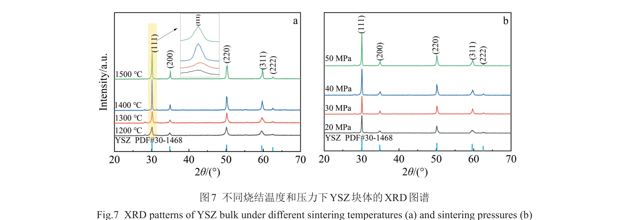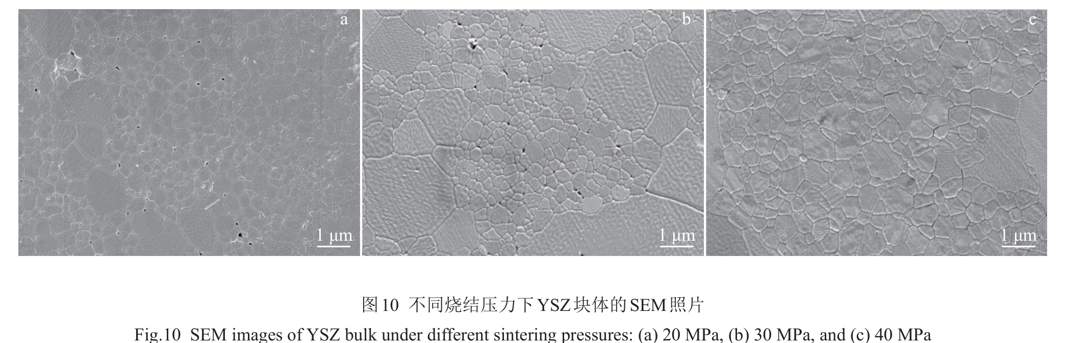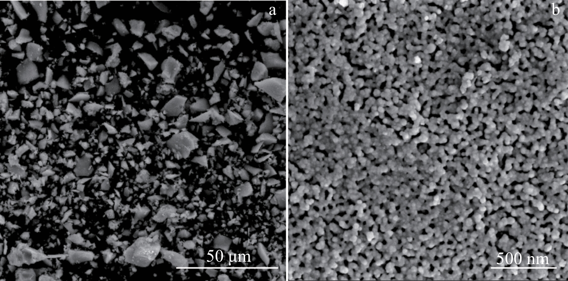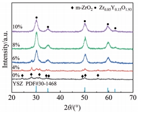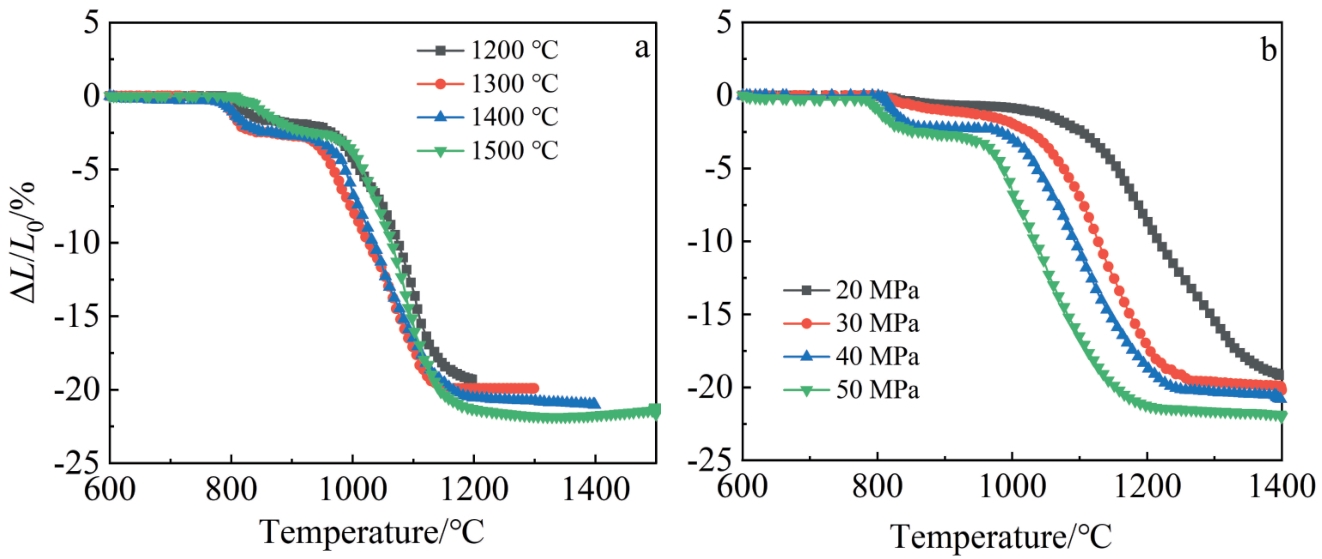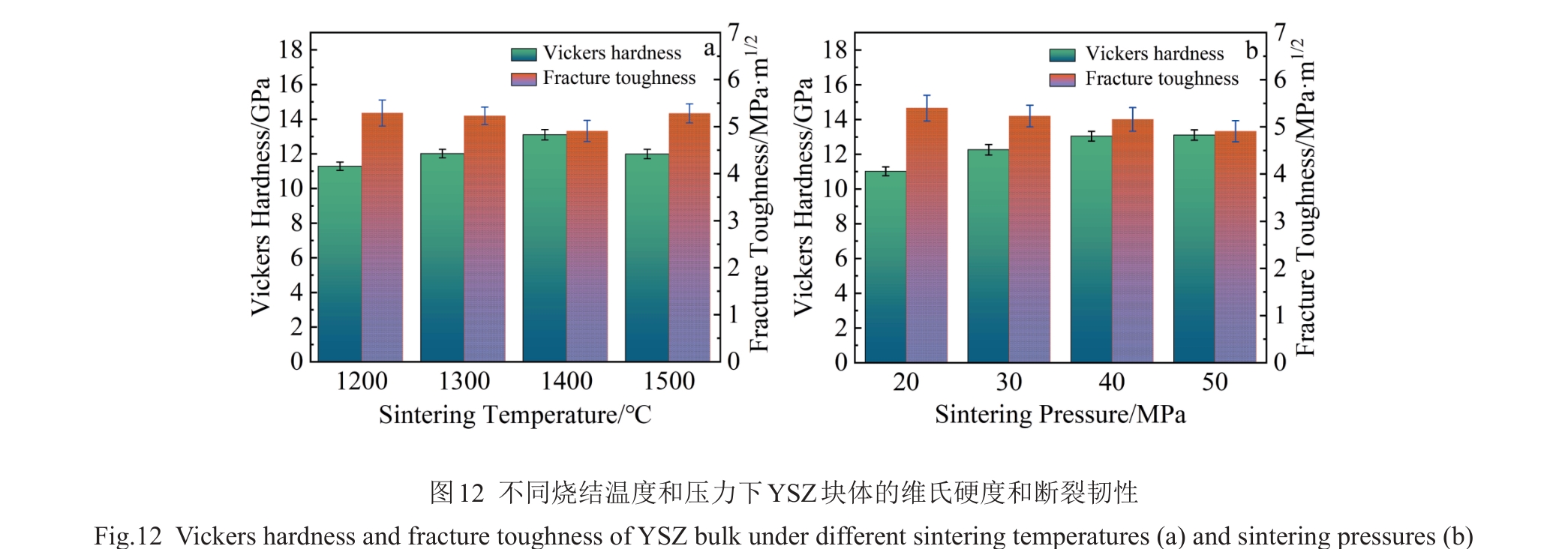 Abstract:Yttria-stabilized zirconia (YSZ) powder was synthesized by hydrothermal method using yttrium nitrate hexahydrate and zirconium oxychloride as yttrium and zirconium sources, respectively. Then, YSZ bulk material was prepared by spark plasma sintering (SPS) method using the obtained YSZ powder as raw material. The effects of sintering temperature and sintering pressure on the microstructure, Vickers hardness, fracture toughness and other mechanical properties of the bulk materials were studied. The results show that pure YSZ powder can be obtained by hydrothermal method when the content of yttrium is 10%. With the increase in SPS temperature and pressure, the density of YSZ bulk material is gradually increased, and YSZ bulk with a porosity of only 2.6% is prepared at 1400 ℃/50 MPa. With the increase in sintering temperature, the Vickers hardness, nano-hardness and elastic modulus of the bulk material are first increased and then decreased. The increased sintering pressure is conducive to the improvement of the mechanical properties of the bulk material, and the maximum values will be reached at 1400 ℃/50 MPa, when the Vickers hardness, nano-hardness and elastic modulus are 13.11±0.2 GPa, 15.67±0.21 GPa and 350.43±6.19 GPa, respectively. The fracture toughness is decreased first and then increased with the increase in sintering temperature, while decreased with the increase in sintering pressure, which reaches the maximum of 5.4±0.27 MPa·m1/2 at 1400 ℃/20 MPa.