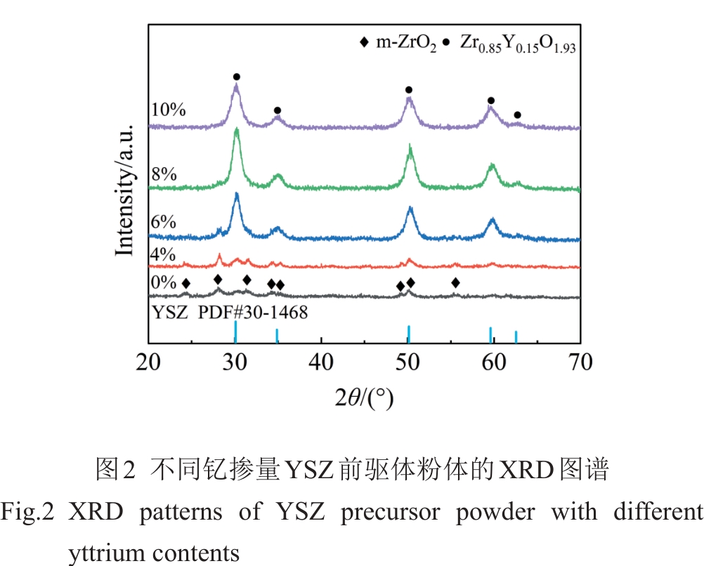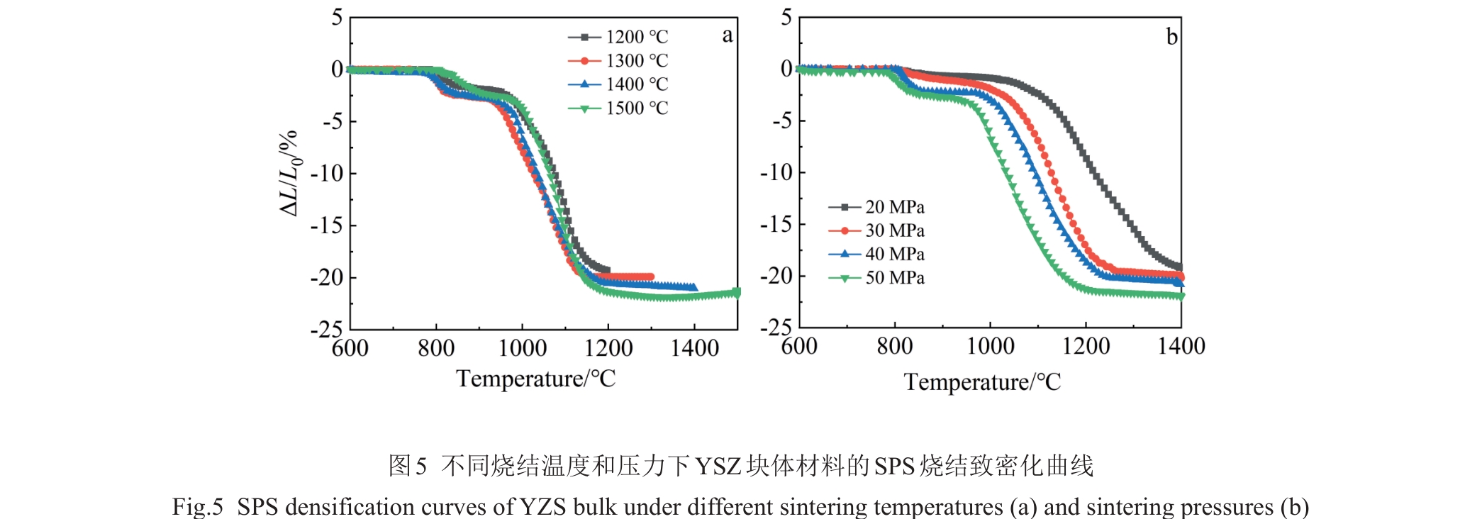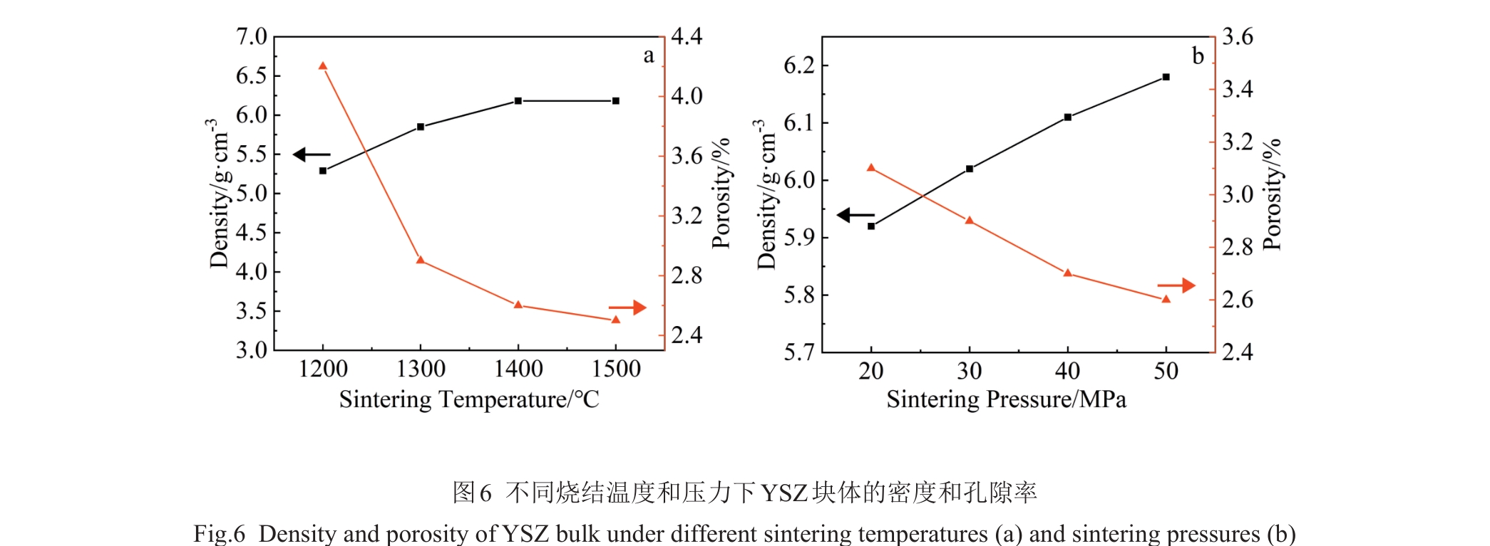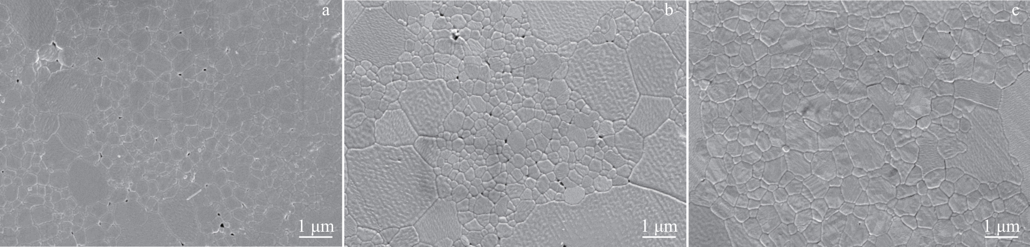 Abstract:Yttria-stabilized zirconia (YSZ) powder was synthesized by hydrothermal method using yttrium nitrate hexahydrate and zirconium oxychloride as yttrium and zirconium sources, respectively. Then, YSZ bulk material was prepared by spark plasma sintering (SPS) method using the obtained YSZ powder as raw material. The effects of sintering temperature and sintering pressure on the microstructure, Vickers hardness, fracture toughness and other mechanical properties of the bulk materials were studied. The results show that pure YSZ powder can be obtained by hydrothermal method when the content of yttrium is 10%. With the increase in SPS temperature and pressure, the density of YSZ bulk material is gradually increased, and YSZ bulk with a porosity of only 2.6% is prepared at 1400 ℃/50 MPa. With the increase in sintering temperature, the Vickers hardness, nano-hardness and elastic modulus of the bulk material are first increased and then decreased. The increased sintering pressure is conducive to the improvement of the mechanical properties of the bulk material, and the maximum values will be reached at 1400 ℃/50 MPa, when the Vickers hardness, nano-hardness and elastic modulus are 13.11±0.2 GPa, 15.67±0.21 GPa and 350.43±6.19 GPa, respectively. The fracture toughness is decreased first and then increased with the increase in sintering temperature, while decreased with the increase in sintering pressure, which reaches the maximum of 5.4±0.27 MPa·m1/2 at 1400 ℃/20 MPa.
