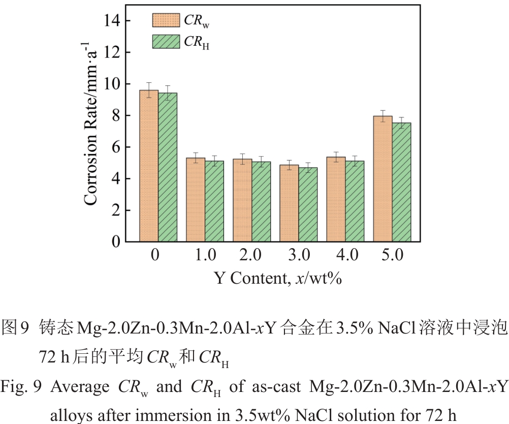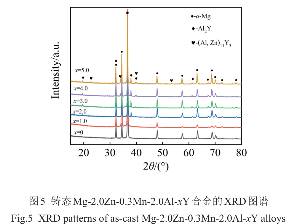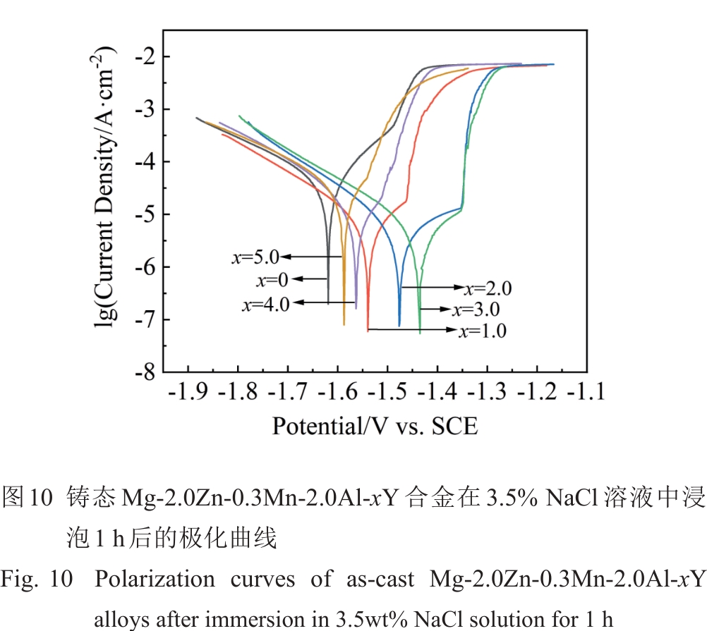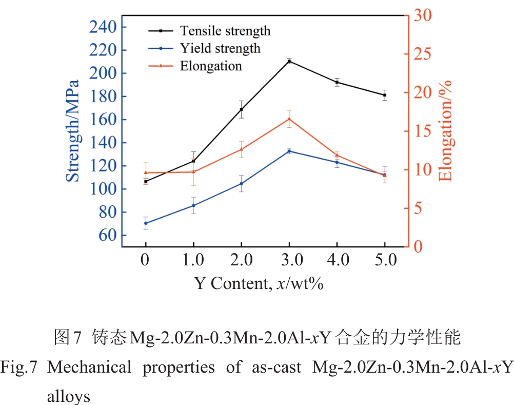 Abstract:The influence of Y content on the microstructure, mechanical properties, and corrosion resistance of as-cast Mg-2.0Zn-0.3Mn-2.0Al-xY (0≤x≤5.0wt%) alloys melted in a ZGJL0.01-40-4 medium-frequency induction furnace at 800±5 ℃ was investigated. The results indicate that the second phases in the Y-containing alloys are mainly composed of Al2Y and (Al, Zn)11Y3 phases. With the increase in Y content, the grain size of alloy is gradually decreased, while the content and size of the second phases are gradually increased. The mechanical properties and corrosion resistance show a trend of firstly increasing and then decreasing. When the Y content is 3.0wt%, the alloy exhibits good mechanical properties and corrosion resistance due to the coupled effects of grain size and type, size, and distribution of the second phase. Its ultimate tensile strength, yield strength, and elongation are 210.47±2.26 MPa, 132.71±2.28 MPa, and (16.56±1.11)%, respectively. The average mass loss corrosion rate and hydrogen evolution corrosion rate are 4.87±0.30 and 4.69±0.31 mm/a, respectively.