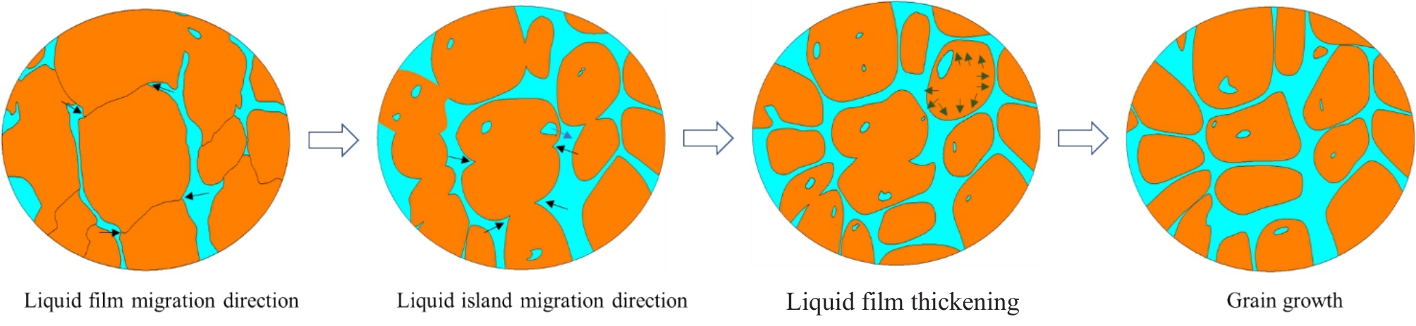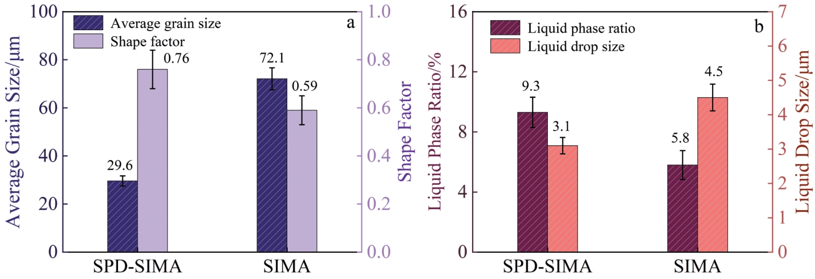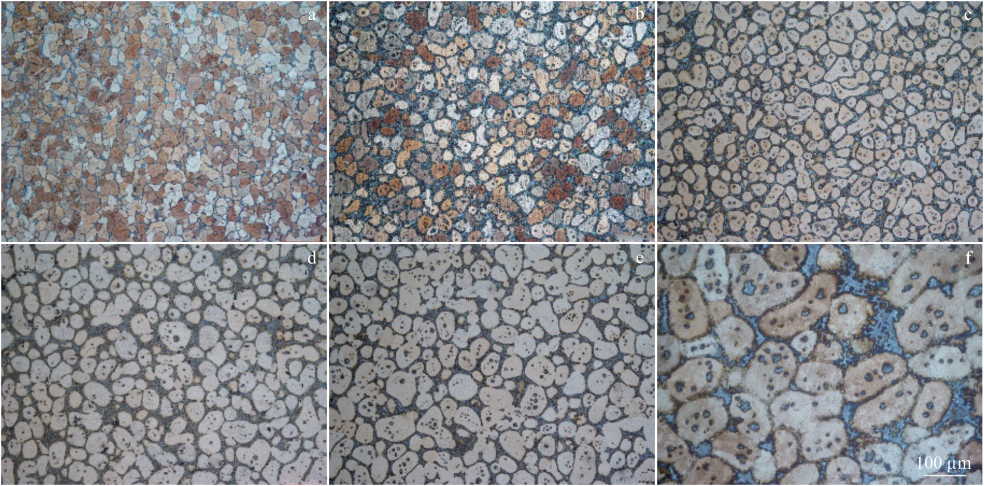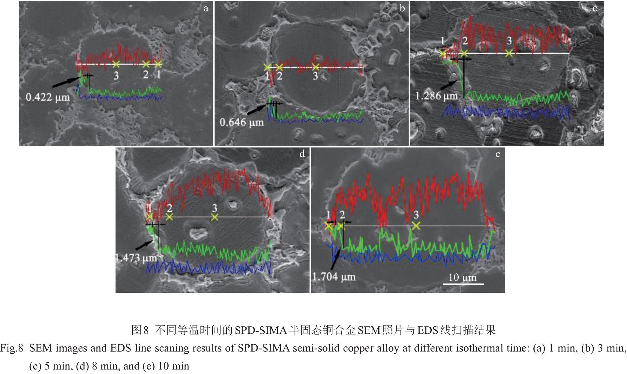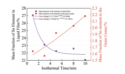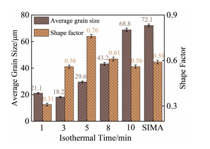 Abstract:The microstructure evolution and element segregation of semi-solid ZCuSn10P1 copper alloy slurry prepared by large plastic deformation strain-induced melting activation method were studied, and the influence of isothermal treatment time on slurry characteristics was analyzed. The results show that the average grain size increases from 21.1 μm at 1 min to 68.8 μm at 10 min with the increase in isothermal treatment time at 900 ℃. The shape factor firstly increases and then decreases, from 0.31 at 1 min to 0.76 at 5 min, and then decreases to 0.56 at 10 min. The liquid phase ratio increases from 3.1% at 1 min to 9.3% at 5 min and remains stable. The diffusion layer thickness of Tin increases from 0.422 μm at 1 min to 1.704 μm at 10 min, and the content of Tin in liquid film and grain core is exponentially related to the isothermal time. The optimum isothermal treatment condition is 900 ℃ for 5 min. At this time, the average grain size, shape factor and liquid island size of the semi-solid copper alloy are 29.6 μm, 0.76 and 3.1 μm respectively. The average grain size and shape factor of the semi-solid copper alloy prepared by conventional strain-induced melting activation method are reduced by 58.9% and increased by 28.8%, respectively. The liquid island size is reduced by 31.1%, and the segregation of tin element is weakened.