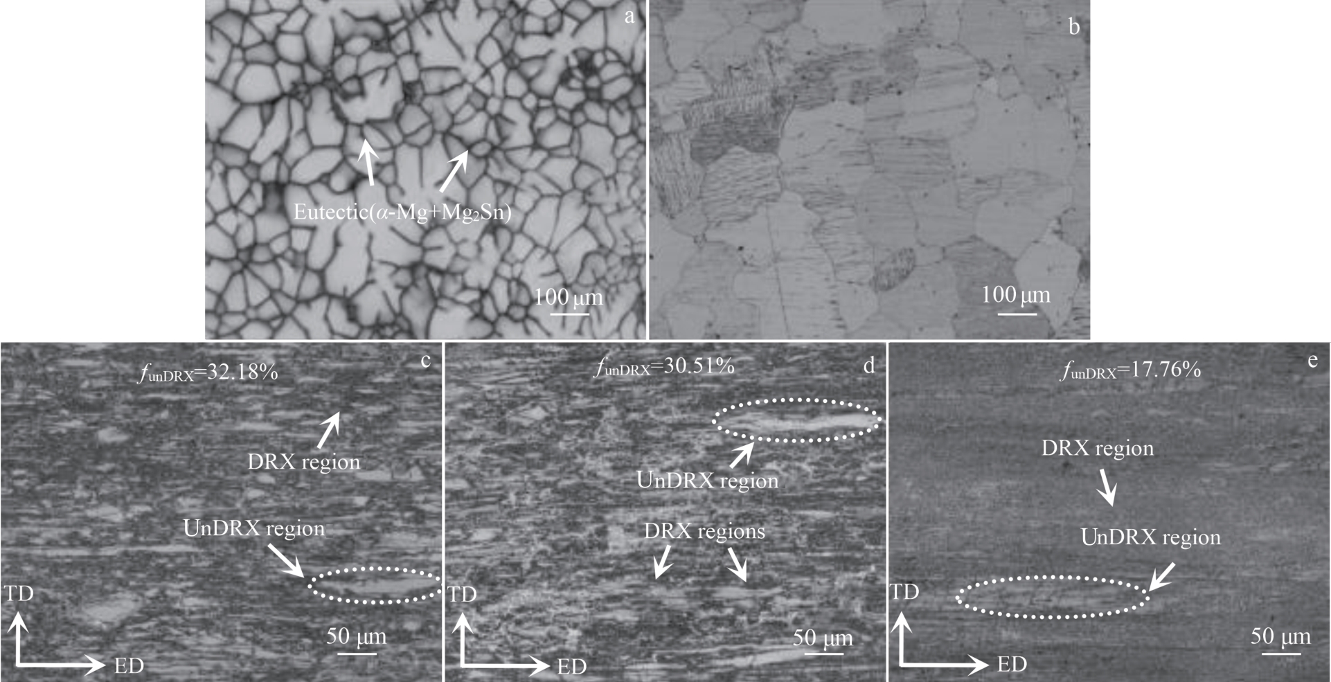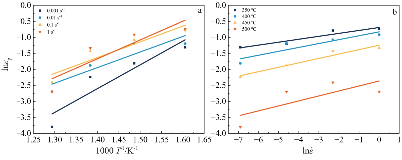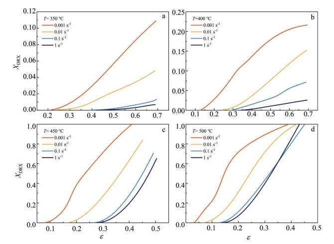 Abstract:To study the hot deformation behavior and related dynamic recrystallization models of Mg-6Gd-3Y-1.5Zn-0.6Zr alloy, single-pass hot compression experiments were conducted on the alloy using a Gleeble-3500 thermal simulation testing machine under deformation conditions of 350–500 °C and 0.001–1 s-1. The dynamic recrystallization behavior was investigated by OM and TEM. Based on the true stress-strain curve, a critical strain model and a kinetics model for dynamic recrystallization were established. The results show that the dynamic recrystallization behavior of Mg-6Gd-3Y-1.5Zn-0.6Zr alloy is influenced by both deformation temperature and strain rate. With the increase in deformation temperature and the decrease in strain rate, the dynamic recrystallization of the alloy becomes more complete. After deformation, the microstructure of the alloy exhibits a typical bimodal structure. The blocky LPSO phase can promote nucleation of recrystallization through the particle stimulation nucleation (PSN) mechanism, while the lamellar LPSO phase undergoes a kink phenomenon. The analysis results of the microstructure after deformation prove that the established dynamic recrystallization model is highly consistent with the experimental results, indicating that this model can effectively predict the dynamic recrystallization behavior of the alloy.