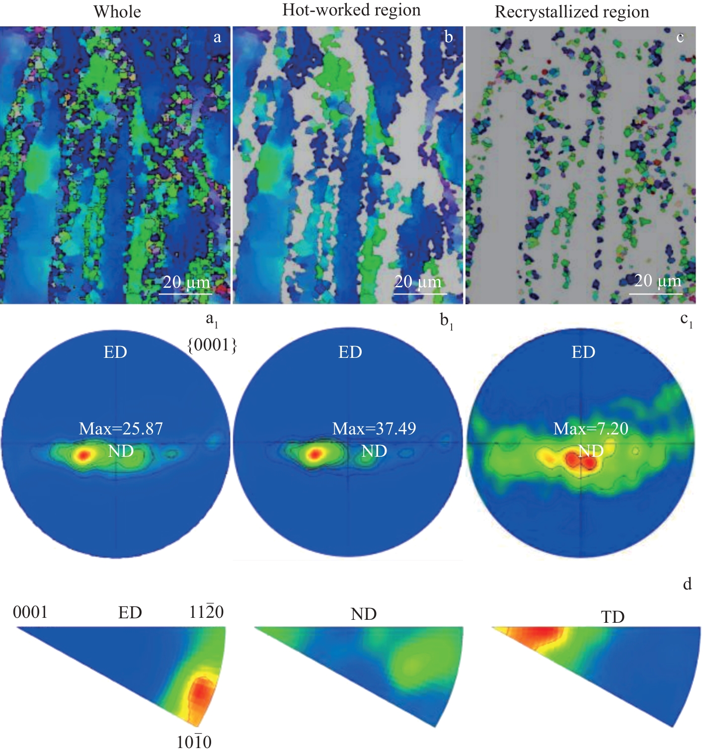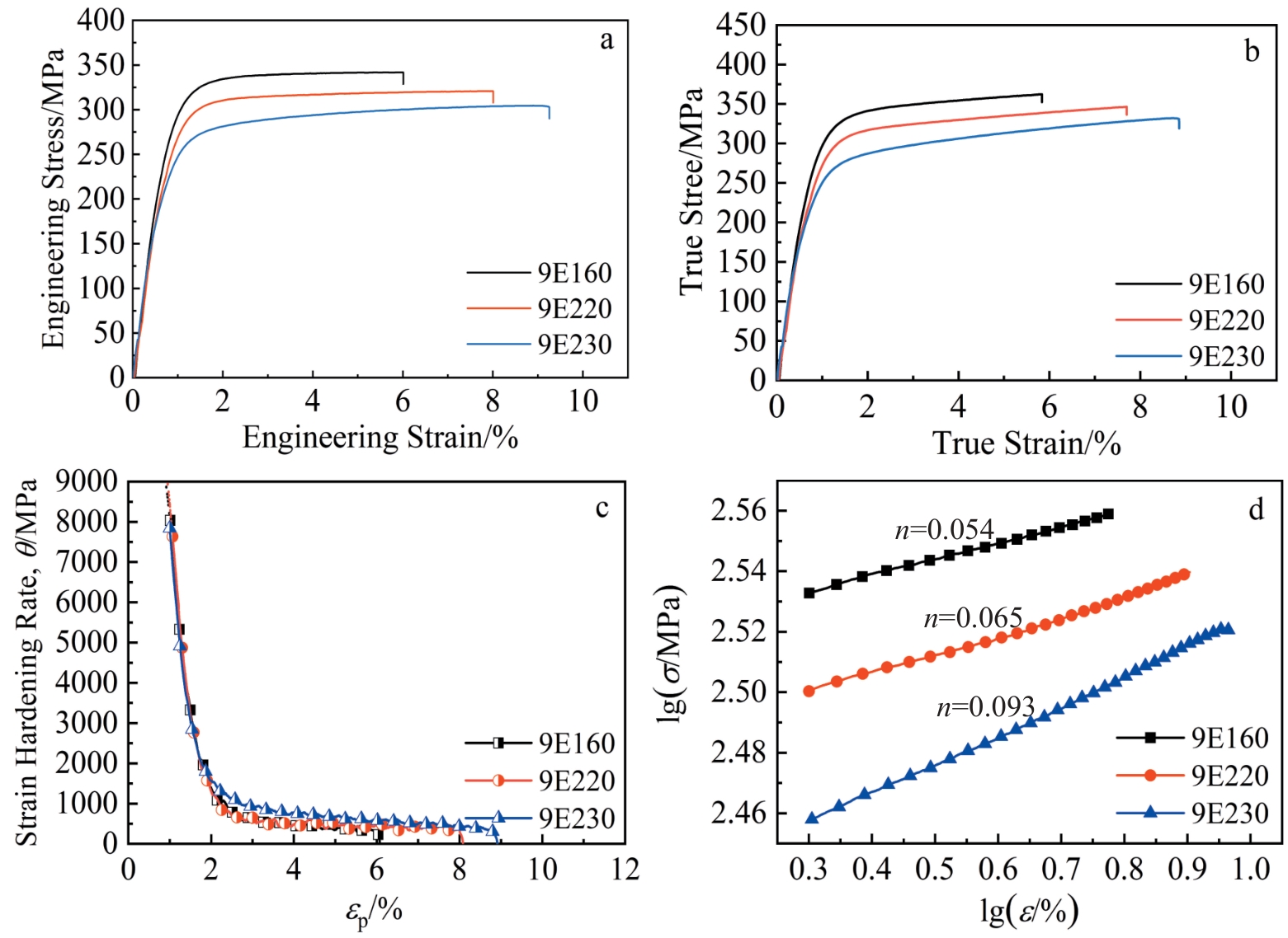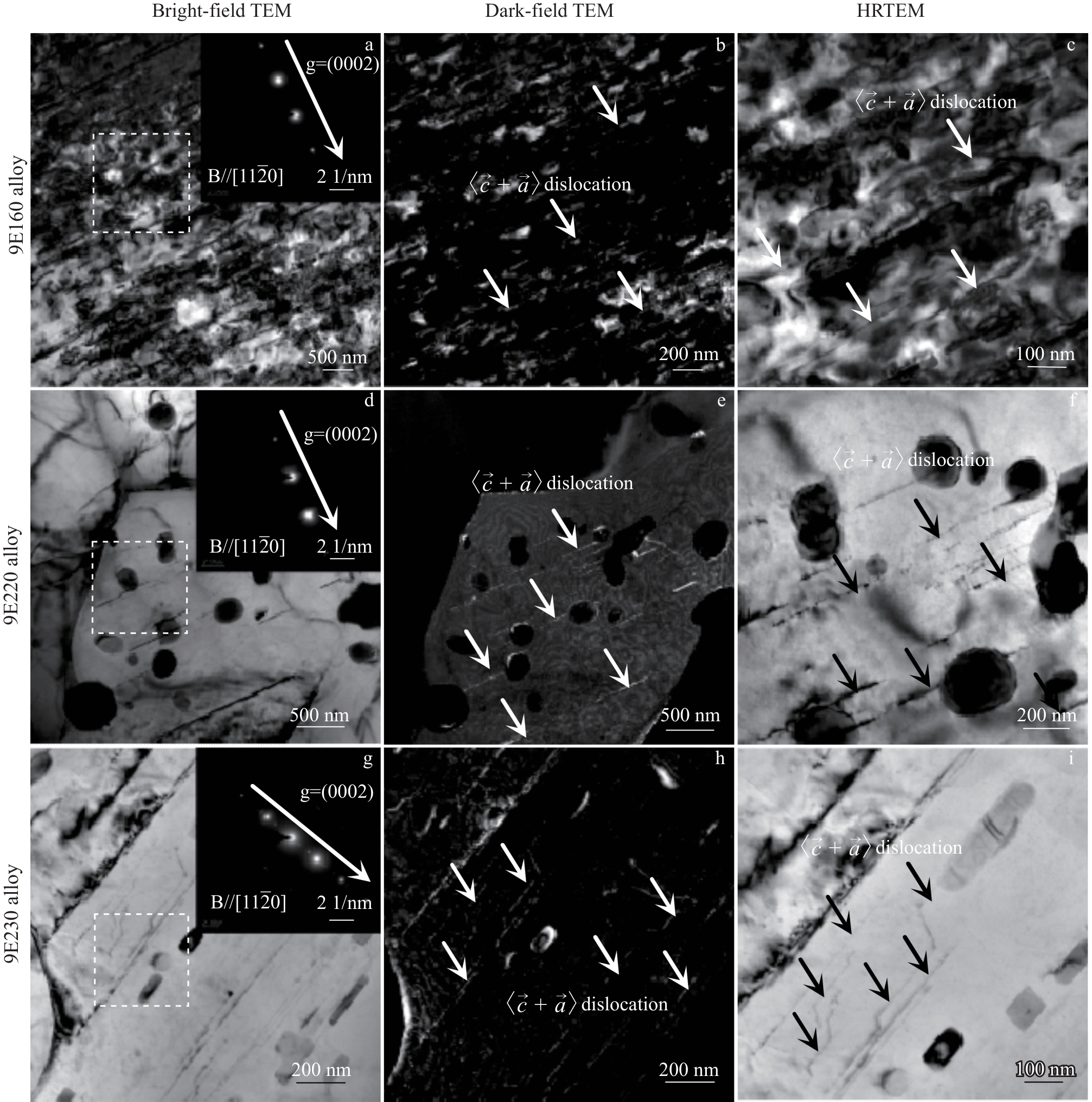 Abstract:The effects of different extrusion temperatures (160, 220 and 230 ℃) on the microstructure and mechanical properties of Mg-7Sn alloy with heterogeneous grain structure were investigated using optical microscope, X-ray diffractometer, electron backscatter diffractometer, transmission electron microscope, and a universal experimental tensile machine. All three extruded alloys contain fine dynamic recrystallized grains and coarse hot-worked grains. The difference in deformability between coarse and fine grains leads to the formation of hetero-deformation induced stress (HDI). The extruded alloys form a typical basal texture, and the texture strength of the basal texture is weakened with increasing extrusion temperature, which is mainly attributed to the fact that the increase in extrusion temperature promotes the dynamic recrystallization and the activation of non-basal slip. The extruded 9E160 alloy exhibits high tensile strength at room temperature (σb=341.83 MPa) due to HDI strengthening, fine grain strengthening and high volume fraction of nanoscale Mg2Sn phase precipitation strength. The increase in extrusion temperature facilitates dynamic recrystallization, resulting in grain refinement and further enhancement of the alloy's plasticity. The improved plasticity of the alloy can be attributed to both grain refinement and activation of non-basal slip systems.