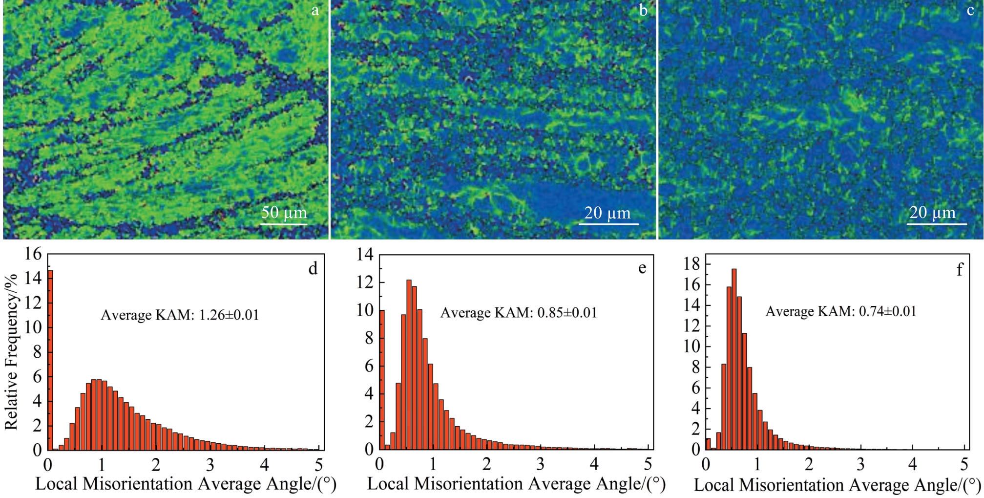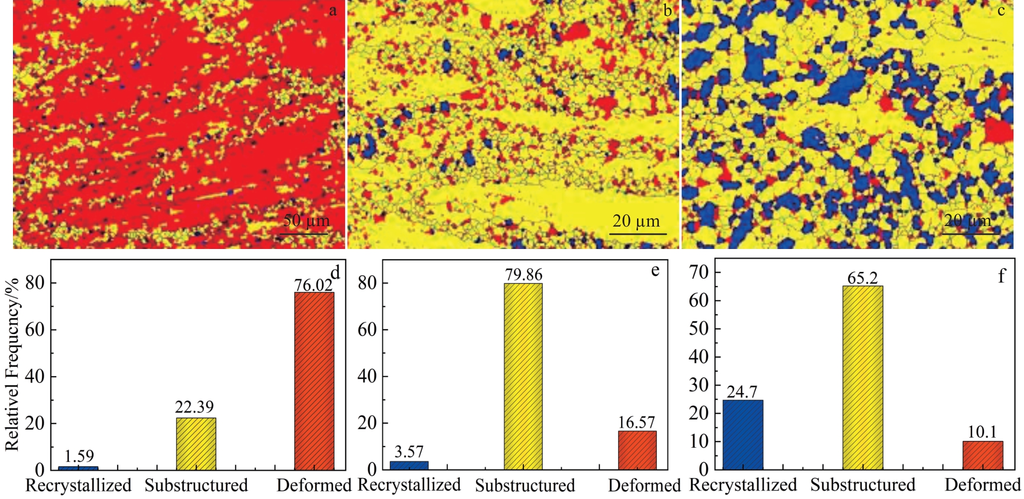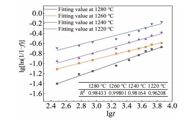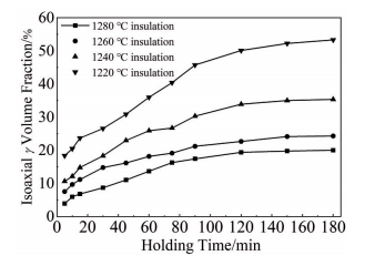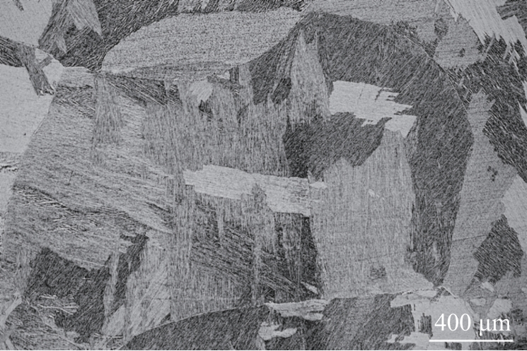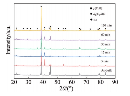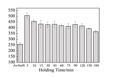 Abstract:The Ti48Al2Cr2Nb(Ti4822) alloy specimens were processed by electron beam melting (EBM) technique and heat-treated. The microstructure and mechanical properties of the alloy were investigated by ultra-depth microscope, scanning electron microscope, X-ray diffractometer and microhardness tester. The kinetics of microstructure transformation was also analyzed. The EBM-formed Ti4822 alloy undergoes an α→γ transition after heating to 1360 ℃ and holding at 1220–1280 ℃. With the decrease in holding temperature, the transformation rate gradually increases, and the transformation of equiaxed γ phase increases from 20.01% to 53.32%. As the holding time increases from 5 min to 180 min, the transition rate first increases and then decreases. The kinetic relationship of the α→γ transition could be predicted using the Avrami equation: