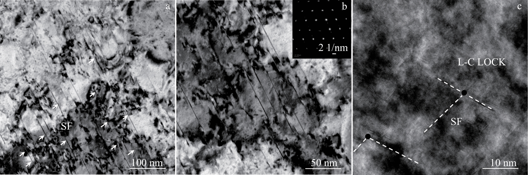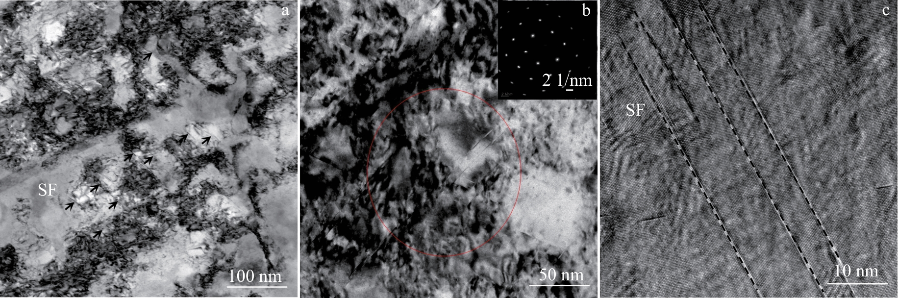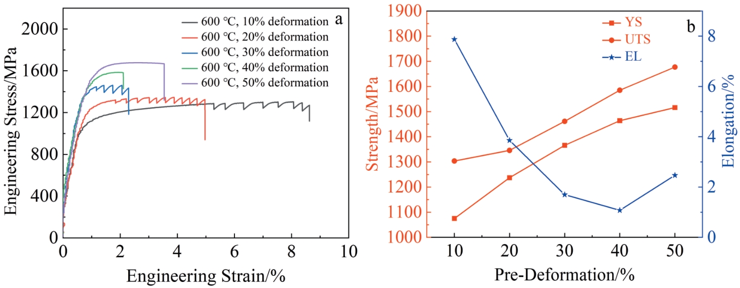 Abstract:The effects of pre-strain treatment (10%–50%) on microstructure and tensile properties of a novel Ni-based superalloy at high temperature (600 ℃) were studied by EBSD, SEM and TEM. The results show that a large number of dislocation and stratification substructures are prefabricated in the alloy, and the strength of the alloy at 600 ℃ increases monotonically with the increase in the pre-deformation amount, while the elongation of the alloy decreases first and then increases. At the same time, when the pre-deformation amount is 50%, the yield strength of the alloy sample increases to 1516 MPa, the ultimate tensile strength is 1677 MPa, and the elongation after fracture is 2.47%. In addition, the strength improvement is mainly attributed to the L-C lock interaction formed by the intersection of the dislocation with the γ′ phase, the stacking fault, and the lamination fault on different (111) planes, which provides a new strengthening method for the regulation of high performance Ni-based superalloys.