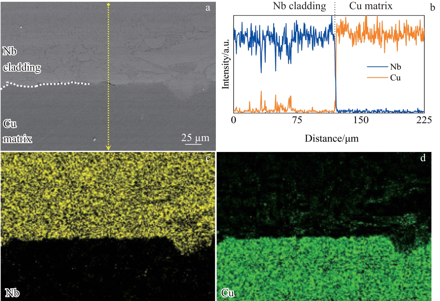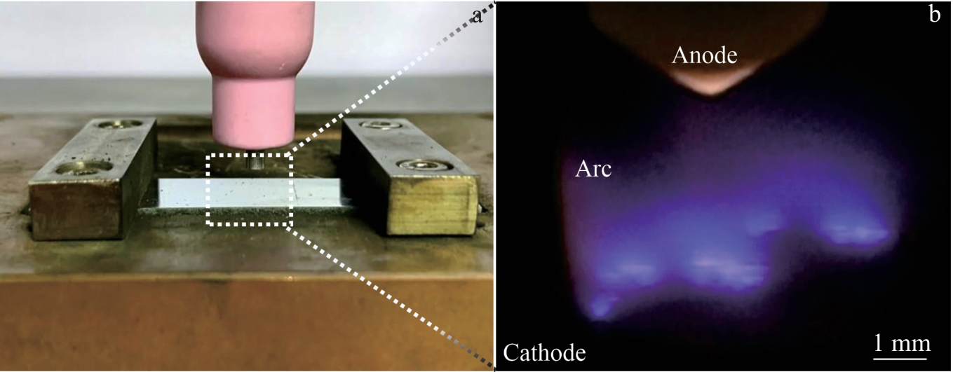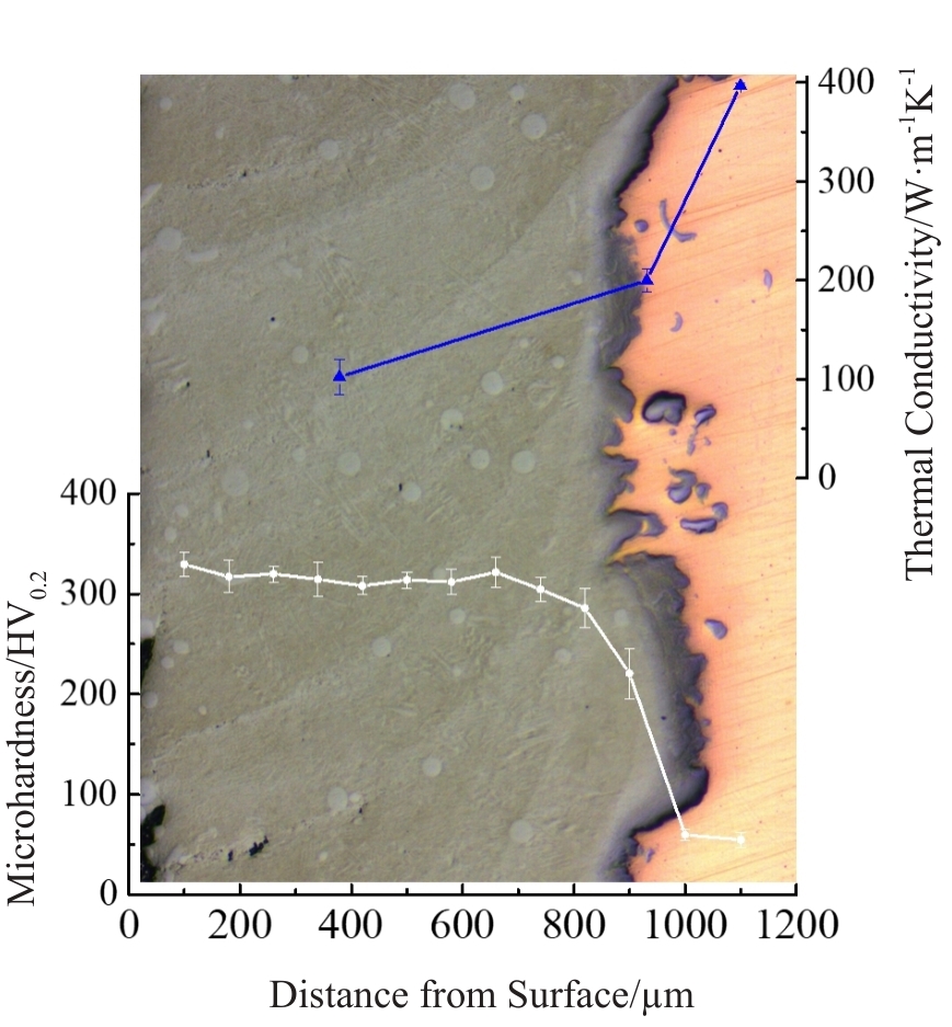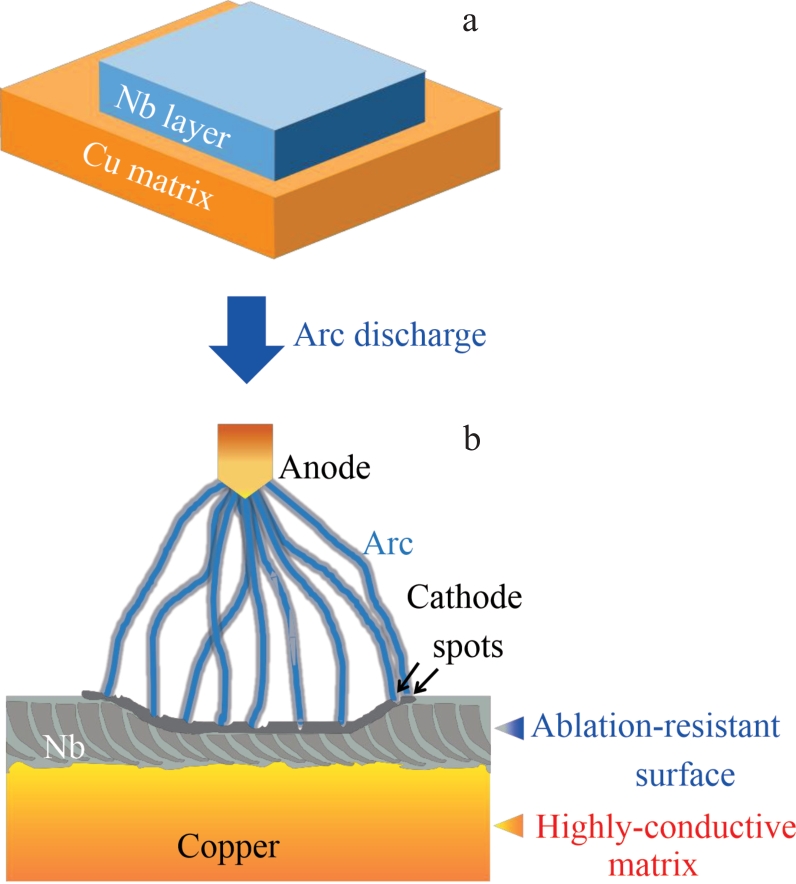Abstract:Functionally gradient cathodes (FGC) realize the combination of ablation-resistant surface and conductive matrix, which can effectively extend the cathodic service life. Nb/Cu FGC, with Nb layer and Cu as surface and matrix, respectively, was prepared by laser cladding. The microstructure, composition, and the phase information were characterized. The microhardness and thermal conductivity of the FGC were tested. Furthermore, the cathodic discharge and ablation behavior in Ar atmosphere were investigated. Results show that several scattered cathode spots appear and densely distributed ablation craters are observed. The Nb/Cu FGC displays relatively moderate ablation behaviors. The average ablation rate of Nb/Cu FGC (1.61 μg/C) is 26.1% lower than that of Cu cathodes (2.18 μg/C), as ascribed to the synergy of ablation resistant Nb surface and the highly-conductive Cu matrix. Nb/Cu FGC exhibits the potential in arc plasma applications.