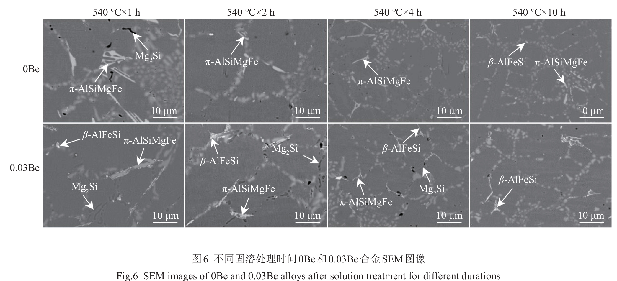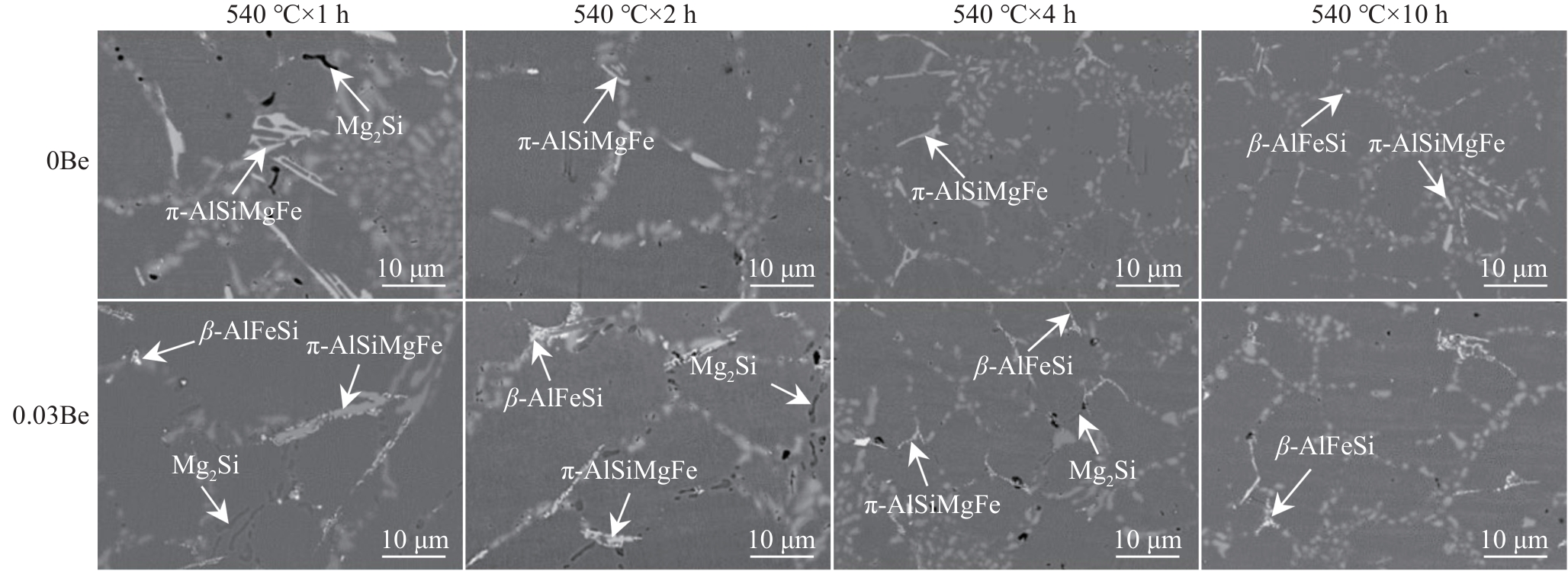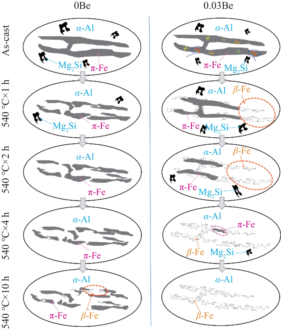 Abstract:To investigate the effect of Be on the transformation of Fe-containing phases during solution treatment, a series of experiments combining Be with different solution treatment processes were designed, and the intrinsic relationship between its effect on the morphology of eutectic silicon and Fe-containing phases and the mechanical properties was studied, aiming to improve the overall performance of the hypoeutectic Al-Si-Mg alloy. The results show that Be delays the decomposition of Mg2Si phase and promotes the transformation of π-AlSiMgFe phase to β-AlFeSi phase. The accelerated transformation of the structure and morphology of π-AlSiMgFe phase not only enhances the strengthening effect, but also weakens the cleavage effect of π-AlSiMgFe phase on the matrix, thus synchronously improving the strength and plasticity of the alloy.
