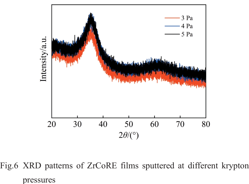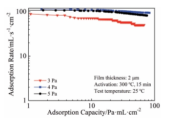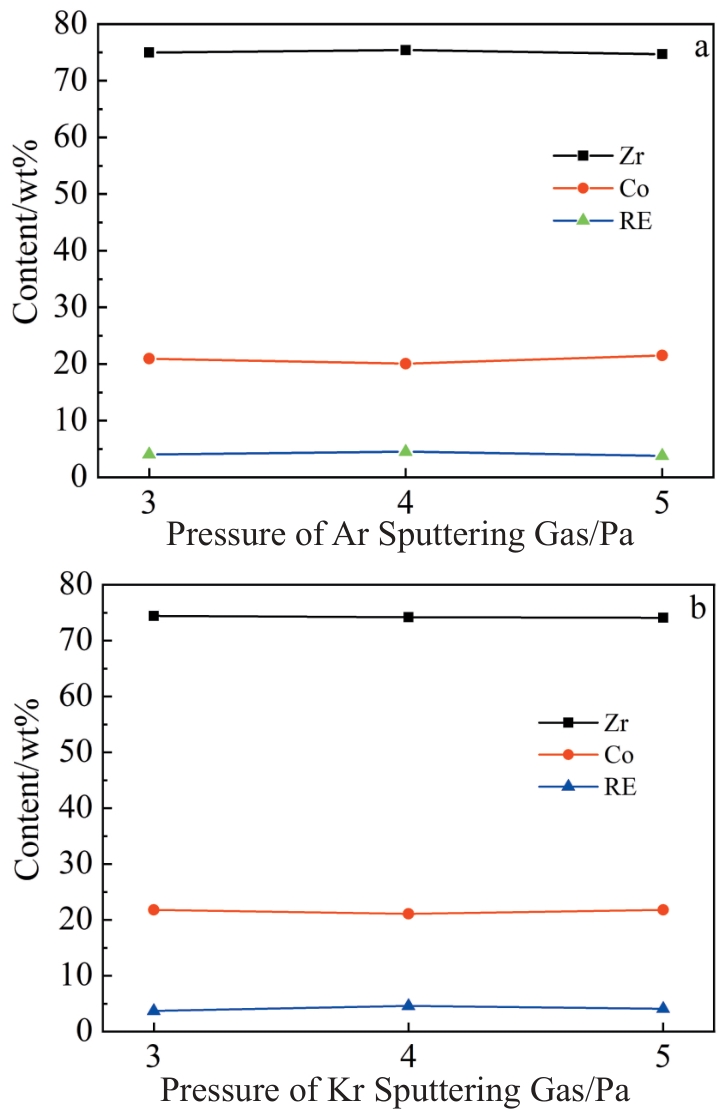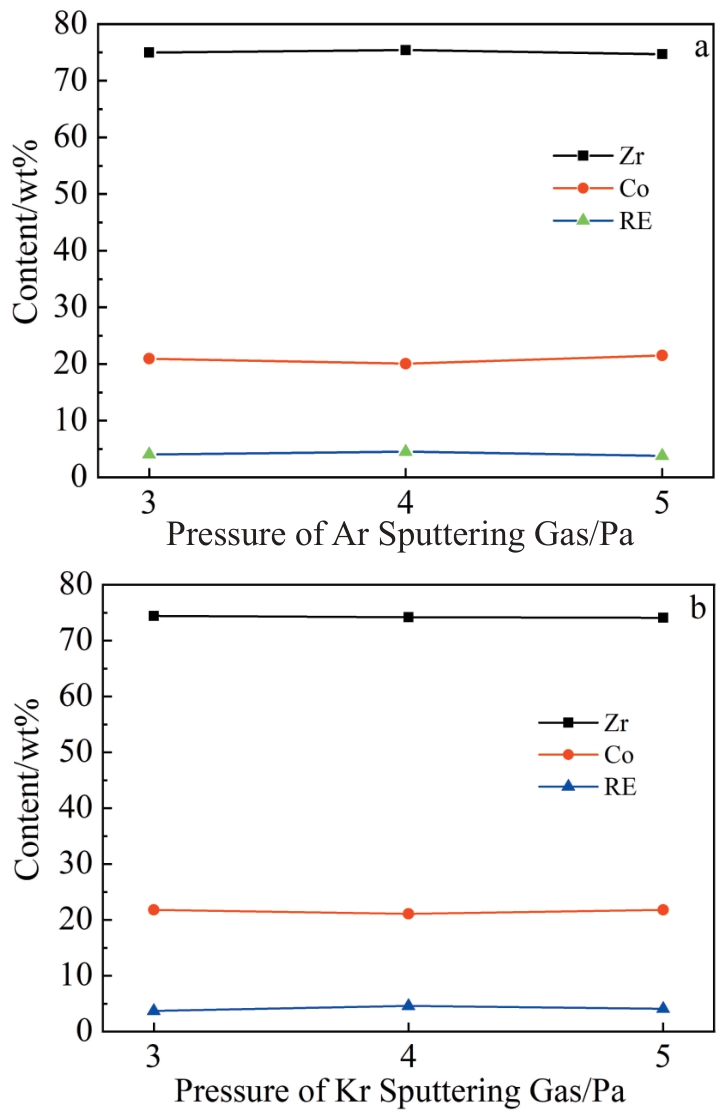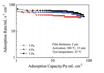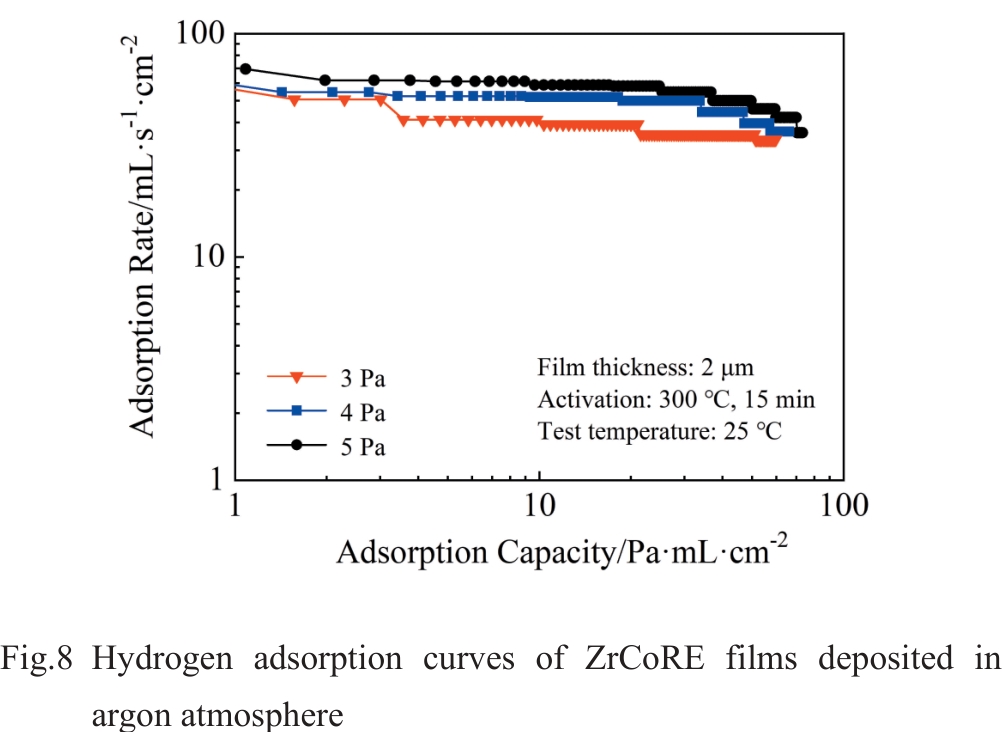 Abstract:ZrCoRE (RE denotes rare earth elements) non-evaporable getter films have significant applications in vacuum packaging of micro electro mechanical system devices because of their excellent gas adsorption performance, low activation temperature and environmental friendliness. The films were deposited using DC magnetron sputtering with argon and krypton gases under various deposition pressures. The effects of sputtering gas type and pressure on the morphology and hydrogen adsorption performance of ZrCoRE films were investigated. Results show that the films prepared in Ar exhibit a relatively dense structure with fewer grain boundaries. The increase in Ar pressure results in more grain boundaries and gap structures in the films. In contrast, films deposited in Kr display a higher density of grain boundaries and cluster structures, and the films have an obvious columnar crystal structure, with numerous interfaces and gaps distributed between the columnar structures, providing more paths for gas diffusion. As Kr pressure increases, the film demonstrates more pronounced continuous columnar structure growth, accompanied by deeper and wider grain boundaries. This structural configuration provides a larger specific surface area, which significantly improves the hydrogen adsorption speed and capacity. Consequently, high Ar and Kr pressures are beneficial to improve the adsorption performance.