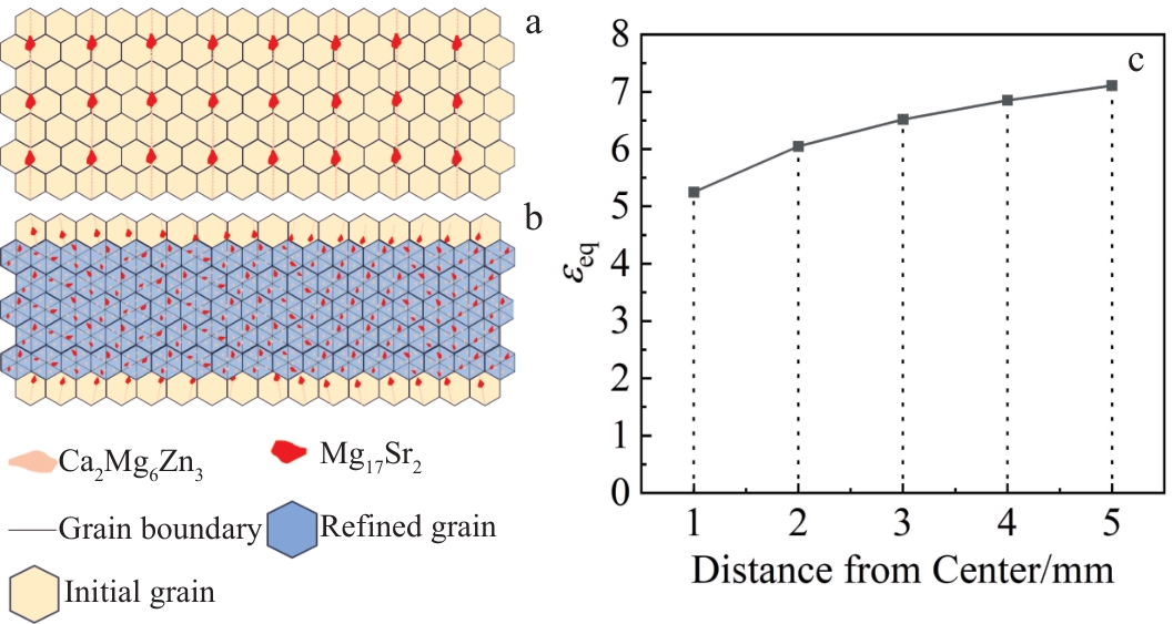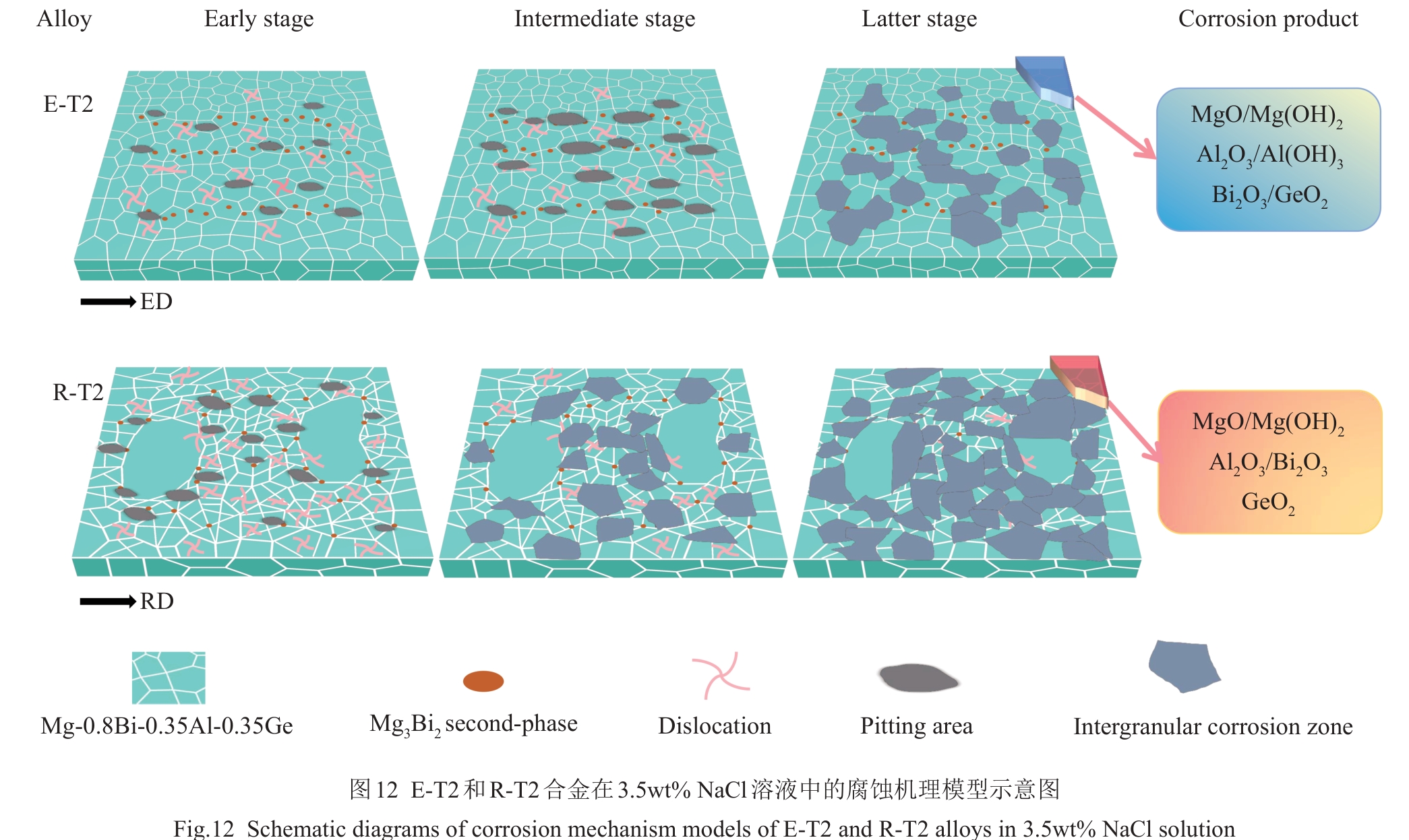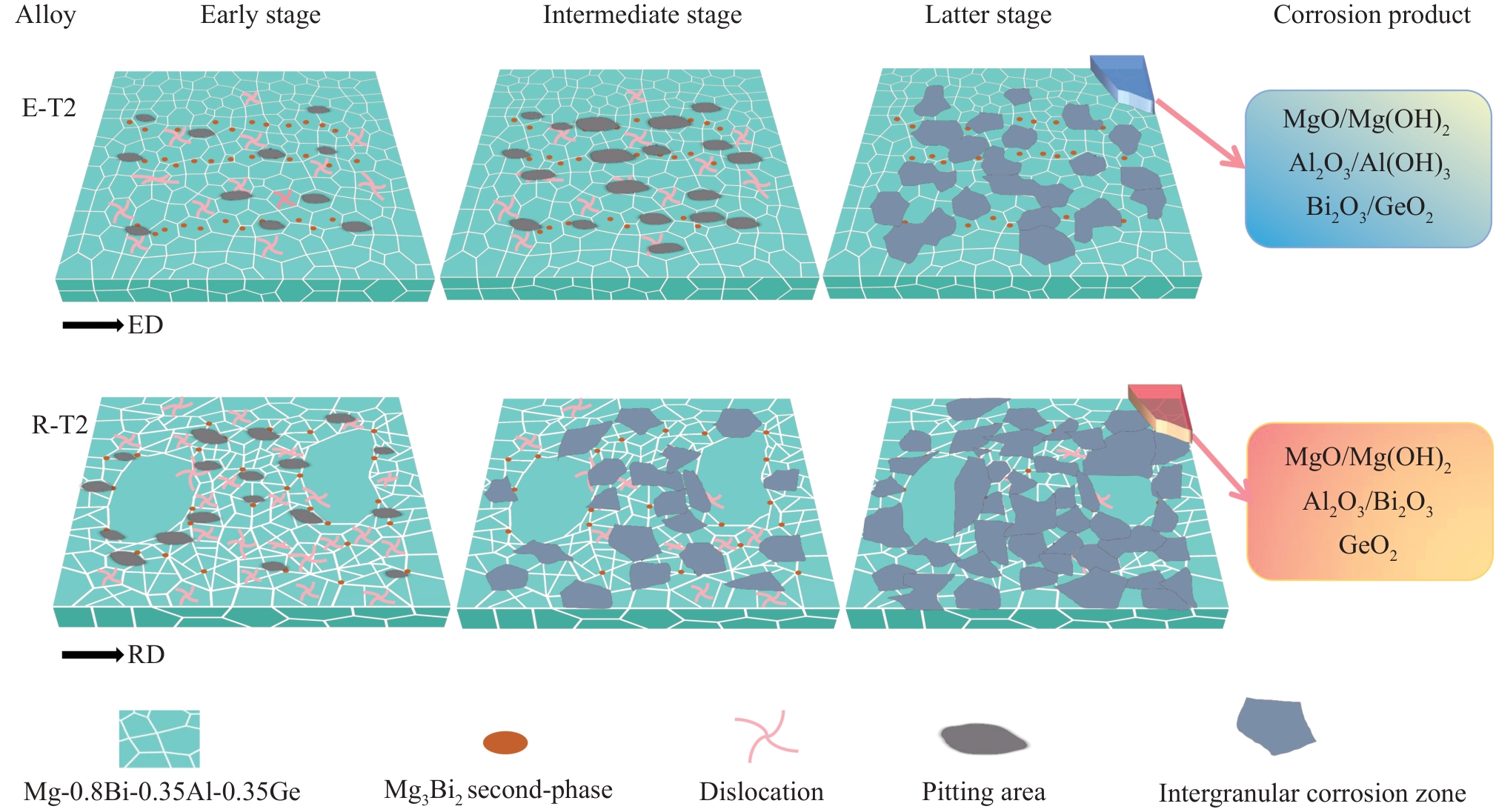 Abstract:Mg-0.8Bi-0.35Al-0.35Ge alloys with different grain structures were prepared by rolling and extrusion processes, including homogeneous E-T2 alloy and heterogeneous R-T2 alloy. The effects of grain structure on the mechanical properties and corrosion behavior of deformed alloys were discussed. Results show that the E-T2 alloy exhibits a homogeneous equiaxed grain structure, whereas the R-T2 alloy exhibits a necklace bimodal grain structure. E-T2 alloy exhibits excellent mechanical properties with synergistic corrosion resistance, whose yield strength, ultimate tensile strength, elongation, and corrosion rate are 208.0 MPa, 274.0 MPa, 25.4%, and 0.12 mm/a, respectively. In contrast, although R-T2 alloy has higher yield strength (285.0 MPa), its corrosion resistance is inferior (0.35 mm/a). This is mainly related to the severe intergranular corrosion caused by the presence of cathode Mg3Bi2 phase and high-density dislocations at the grain boundary.