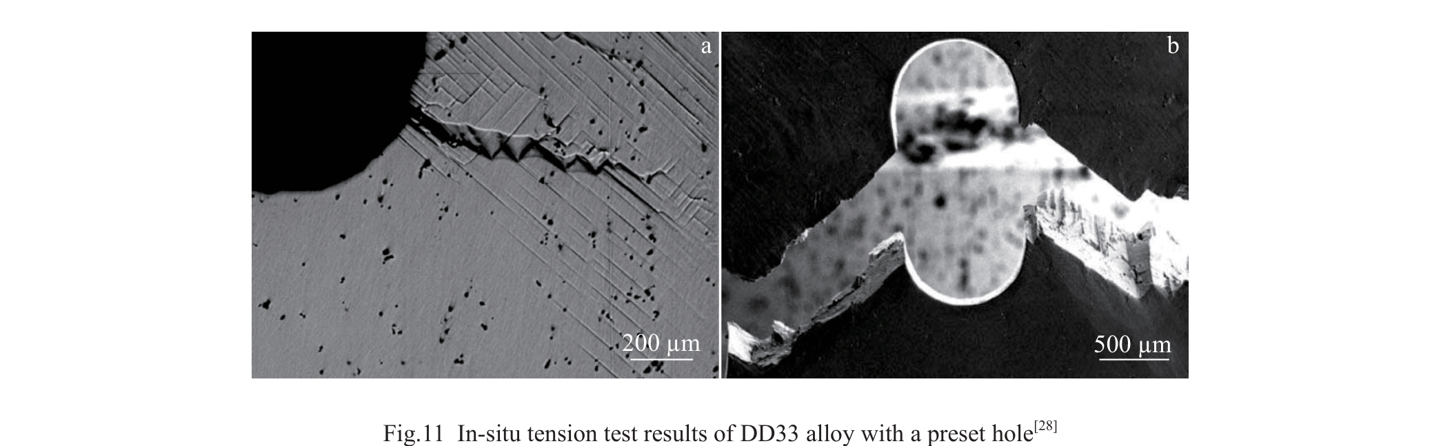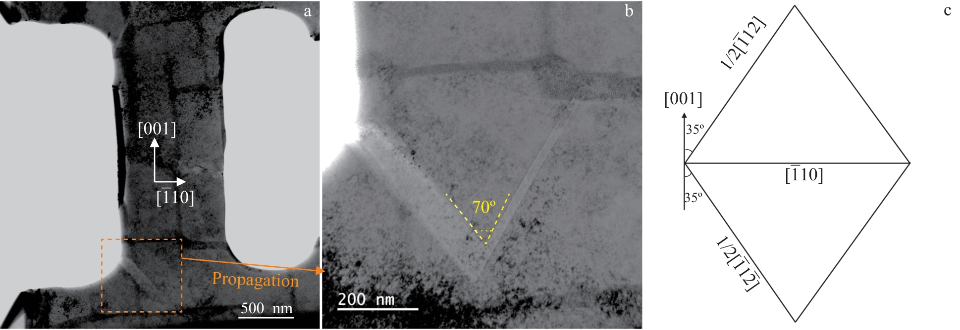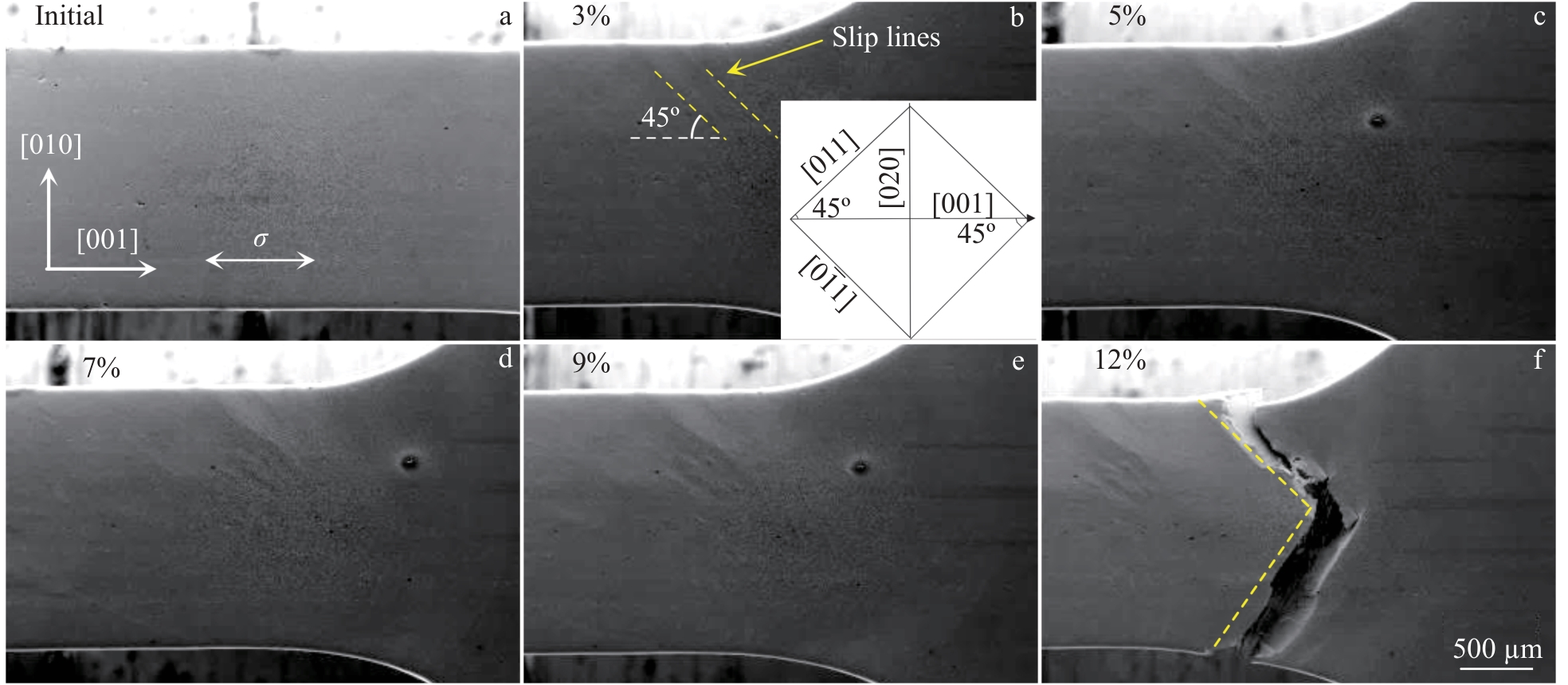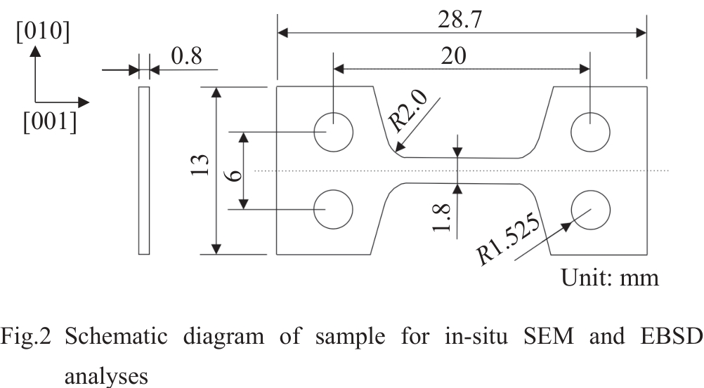 Abstract:The deformation and fracture of a third-generation single crystal superalloy during in-situ tension at room temperature were investigated at multiple scales by scanning electron microscope, electron back-scattered diffractometer, and transmission electron microscope to reveal the deformation and fracture mechanism during tension. The proportion of low angle boundaries (LABs) with angles from 2.5° to 5.5° increases during tension. The change in LABs is particularly pronounced after elongation over 7%. The initiation of microcracks is caused by {111}<110> slip systems. After initiation, the crack size along the stress direction increases whereas the size extension along slip systems is suppressed. The fracture mode of the alloy is quasi-cleavage fracture and the slip lines near the fracture are implicit at room temperature.