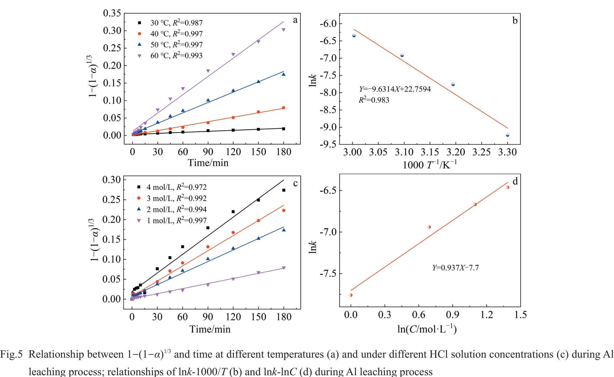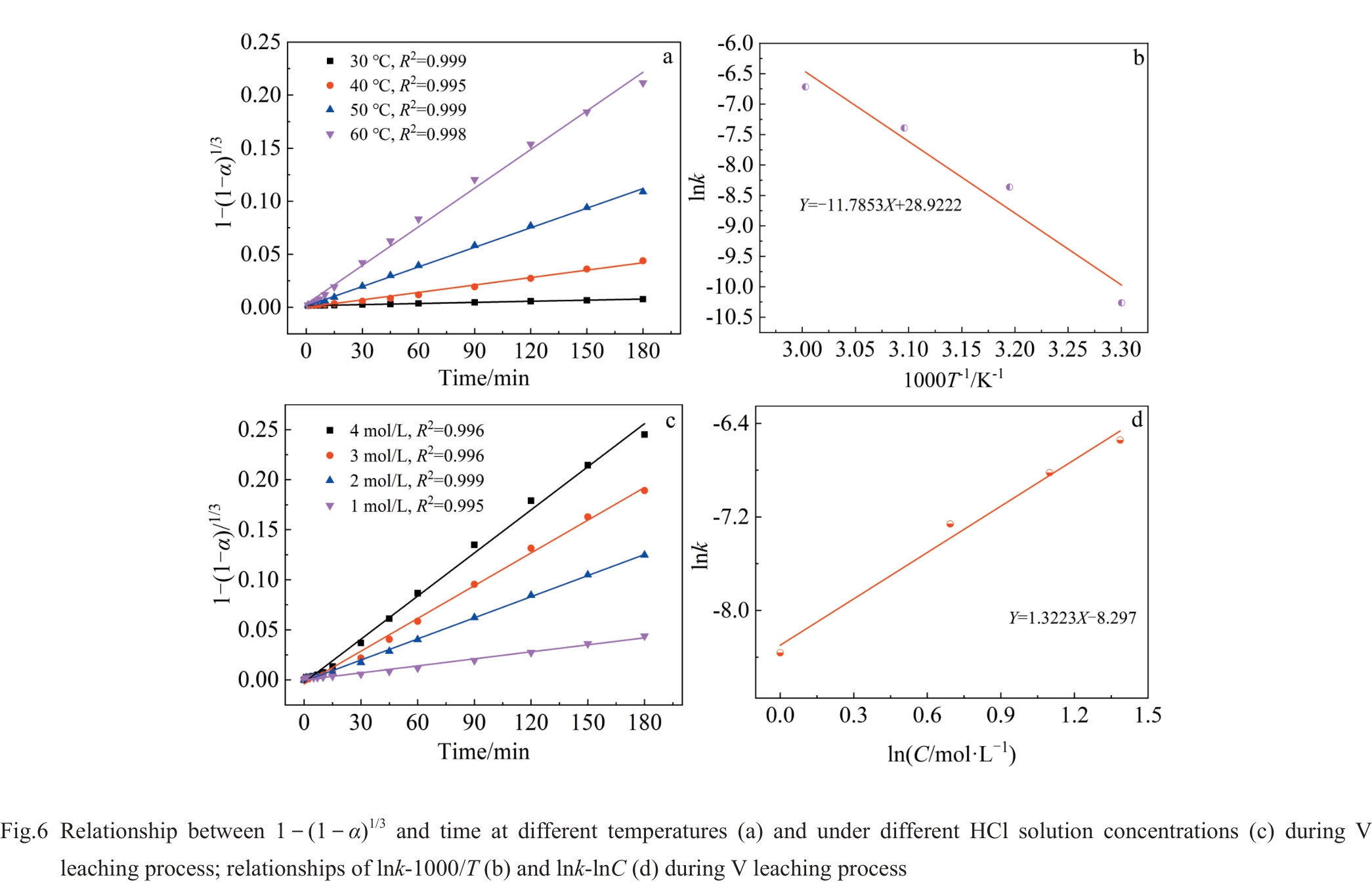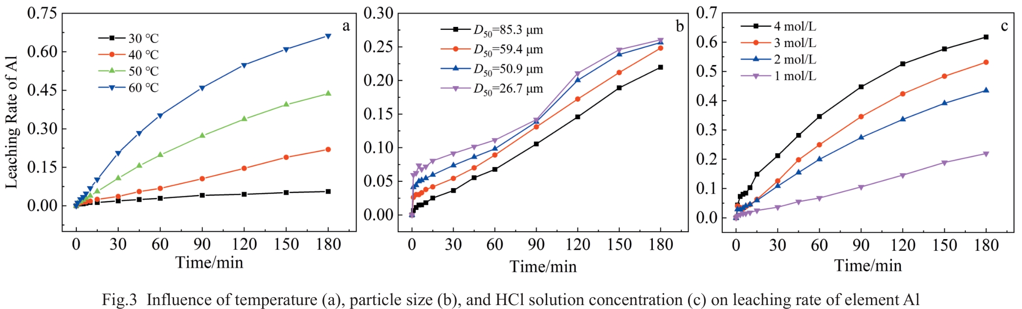 Abstract:The leaching process of magnesiothermic self-propagating product generated during the multistage deep reduction process was investigated. The influence of magnesiothermic self-propagating product particle size, HCl solution concentration, and leaching solution temperature on the leaching behavior of Al and V elements was investigated. Results demonstrate that the leaching rate of Al and V is increased with the rise in leaching solution temperature, the increase in HCl solution concentration, and the enlargement of magnesiothermic self-propagating product particle size. The leaching processes of Al and V are consistent with the chemical reaction control model. When the magnesiothermic self-propagation product with D50 of 59.4 μm is selected as the raw material, the leaching temperature is 40 °C, and 1 mol/L HCl solution is employed, after leaching for 180 min, the leaching rates of Al and V are 24.8% and 12.6%, respectively. The acid-leached product exhibits a porous structure with a specific surface area of 3.5633 m2/g.