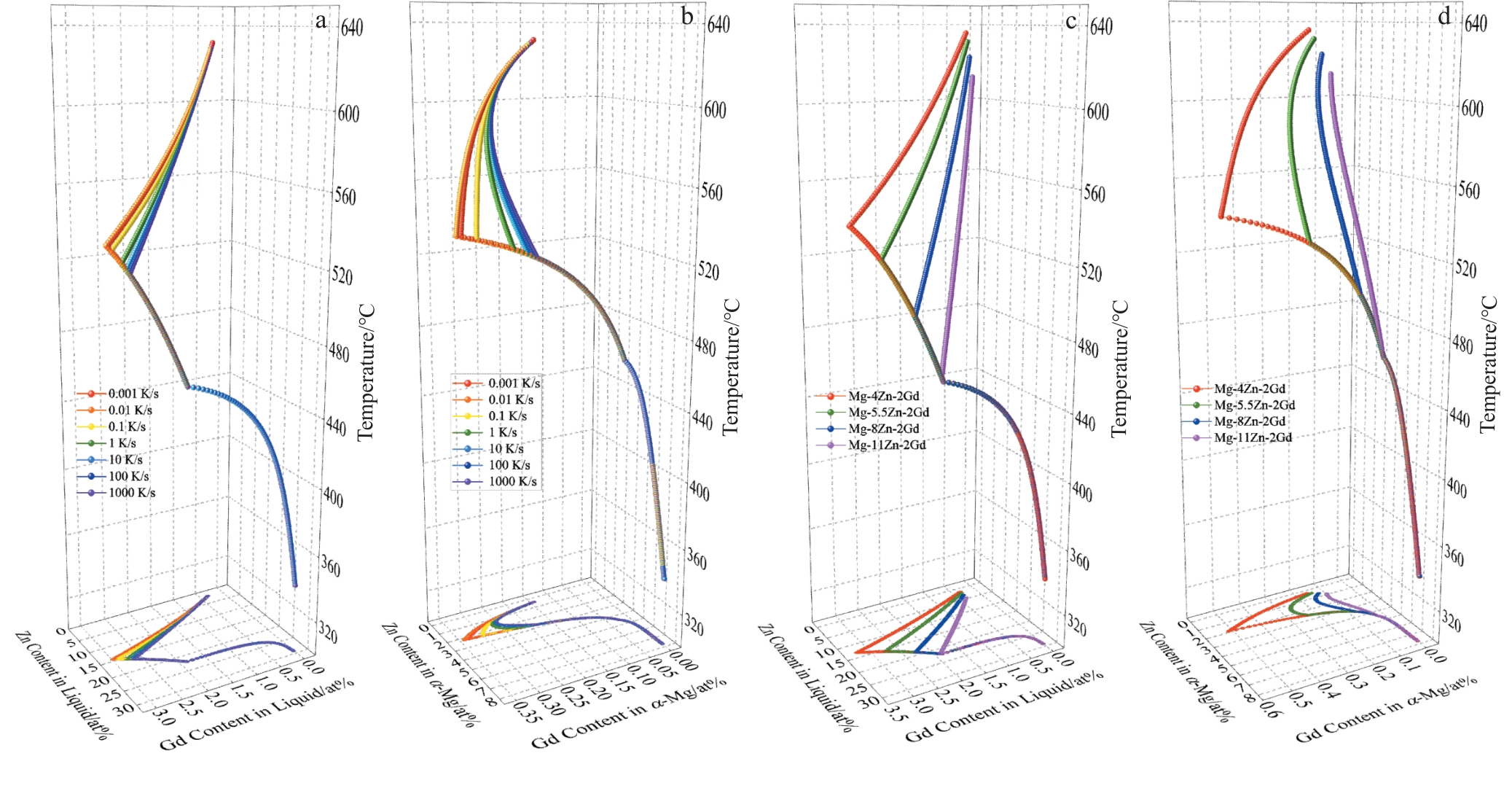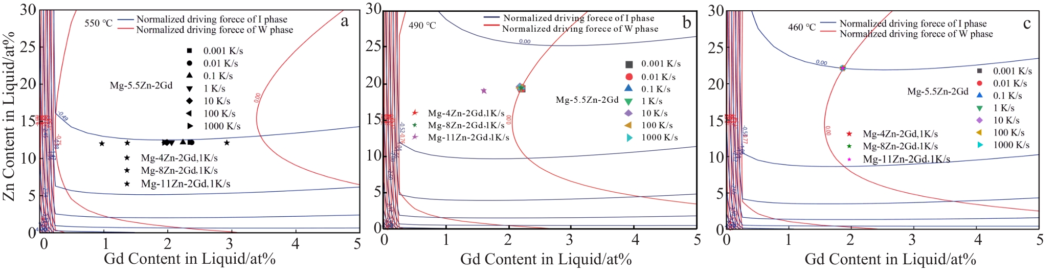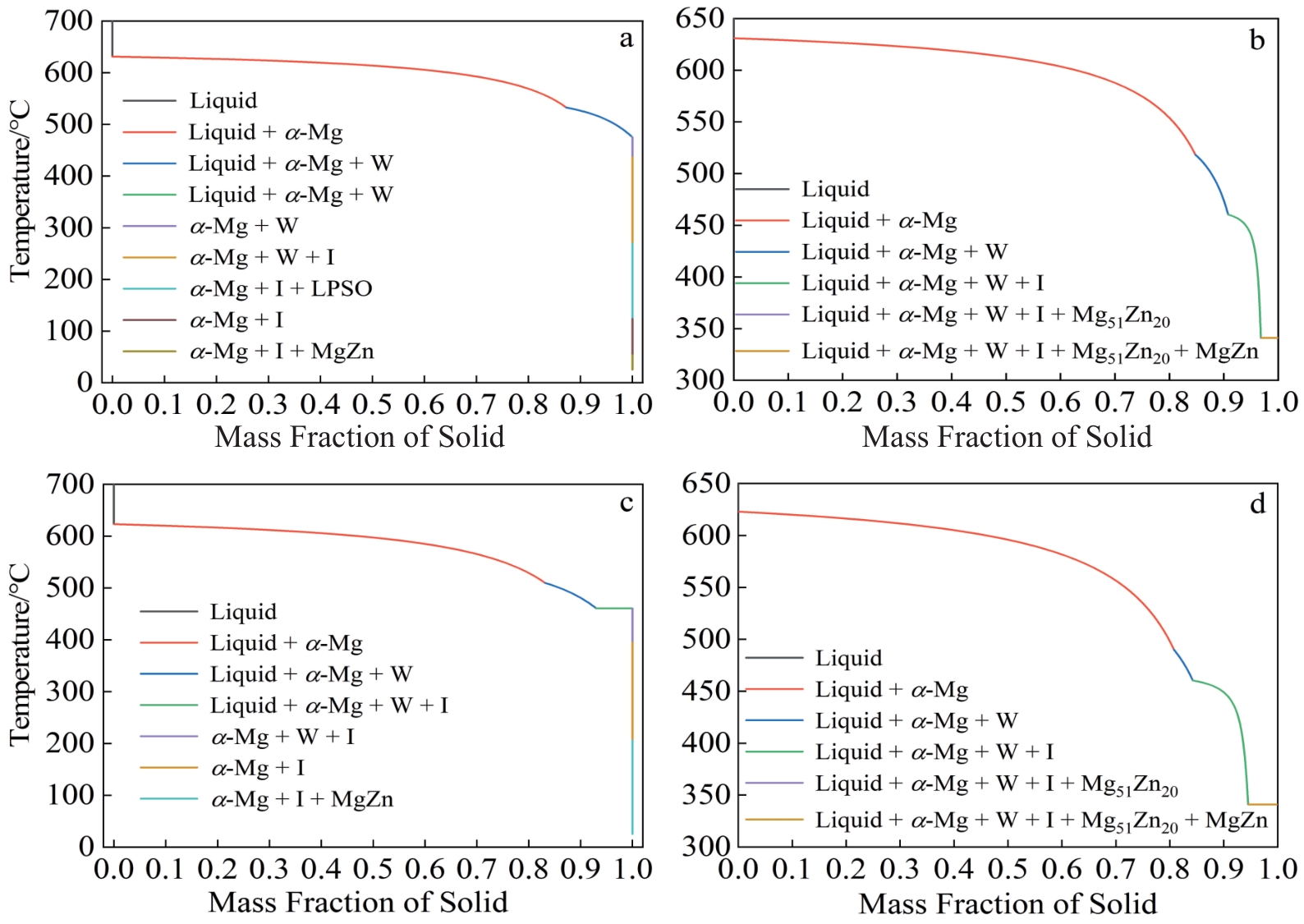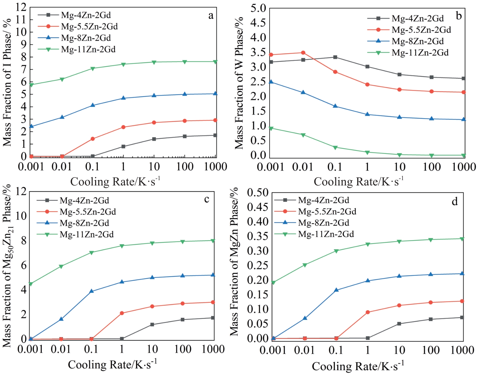 Abstract:The I phase (Mg3Zn6Gd, icosahedral quasicrystal phase) is widely considered as the strengthening phase in Mg-Zn-Gd system alloys, providing more significant improvements in the mechanical properties compared to the W phase (Mg3Zn3Gd2, cubic phase). However, both the W phase and the I phase typically coexist in the as-cast Mg-Zn-Gd alloy, thereby weakening its mechanical properties. There has been limited systematic research dedicated to investigating the crystallization mechanism of these phases during solidification. In this study, the equilibrium solidification and Scheil solidification paths of Mg-xZn-2Gd (x=0–12, wt%) alloys were calculated by Thermo-Calc software. The effects of cooling rate and alloy composition on the fraction of the I phase were studied. The results show that the equilibrium solidification structure of the alloy with a Zn/Gd atomic ratio of 6.0 only contains the I phase. In contrast, limited solute diffusion in the solid phase hampers the transformation of the W phase into the I phase during non-equilibrium solidification, forming a mixed structure composed of both the W phase and the I phase. The variation of cooling rate and alloy composition affects the solute enrichment rate in the Liquid during the solidification process of the primary α-Mg phase and alters the solute content and temperature of the residual Liquid when the secondary phase begins to crystallize, and influences the type and fraction of the secondary phase as determined by the solidification driving force. The increased solidification cooling rates and Zn/Gd atomic ratio inhibit the W phase and promote the formation of the I phase during Mg-Zn-Gd alloy preparation, resulting a higher proportion of the I phase in the alloy.
