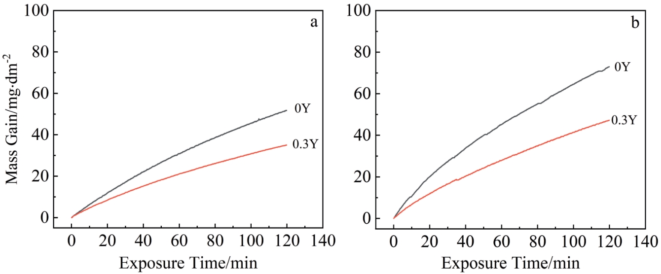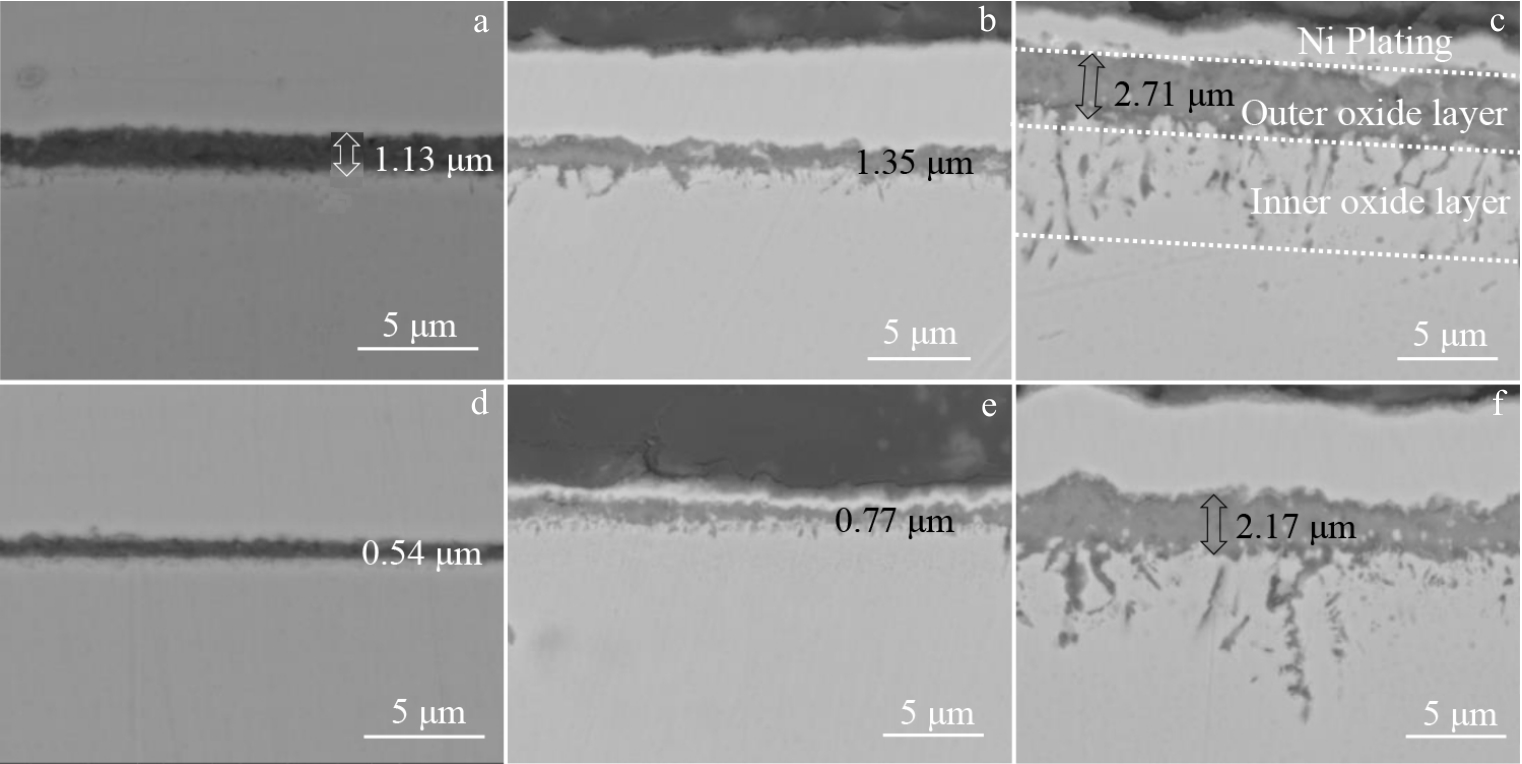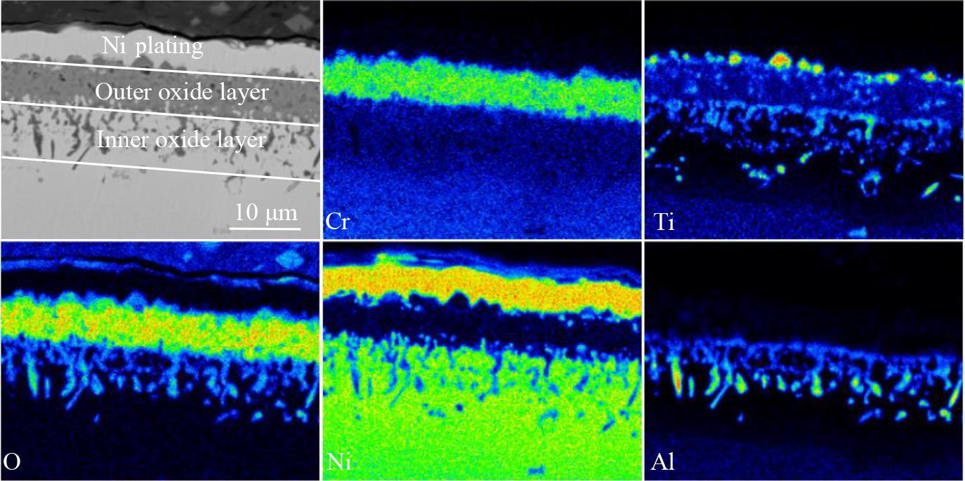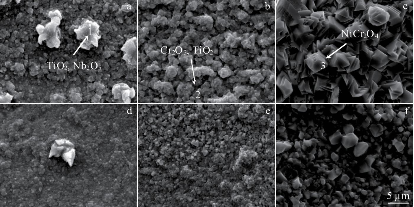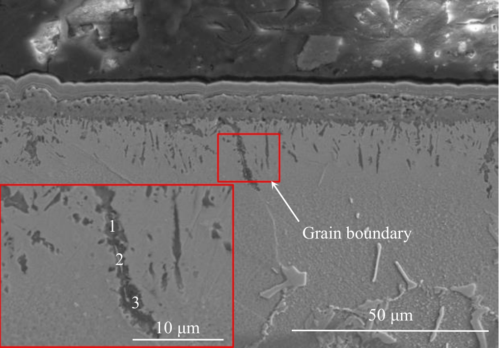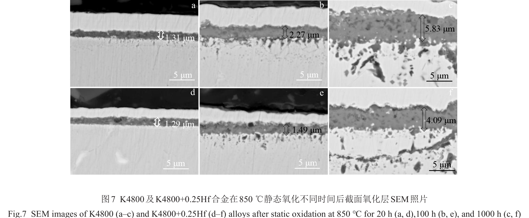 Abstract:The effect of Hf on high-temperature oxidation behavior of K4800 nickel-based superalloy was studied. The results show that the oxidation kinetics curves of K4800 and K4800+0.25Hf alloys obey parabolic law during thermostatical static oxidation at 800 and 850 ℃.However, the initial static oxidation rate of K4800+0.25Hf alloy (0.026 g/m2·h at 800 °C for 20 h and 0.061 g/m2·h at 850 °C for 20 h) is lower than that of K4800 alloy (0.041 g/m2·h at 800 °C for 20 h and 0.066 g/m2·h at 850 °C for 20 h). The oxide layer of the two experimental alloys consists of outer oxide layer and an inner oxide layer. The outer oxide layer primarily consists of dense Cr2O3, while the inner oxide layer mainly contains dendritic Al2O3. However, with the increase in Hf content from 0wt% to 0.25wt%, the thickness of the Cr2O3 outer oxide layer decreases from 2.71 μm to 2.17 μm after oxidation at 800 °C for 1000 h and from 5.83 μm to 4.09 μm after oxidation at 850 °C for 1000 h. The results of EPMA analysis indicate the formation of HfO2 at the grain boundary of the oxide layer in the K4800+0.25Hf alloy, promoting the formation of Al2O3 around HfO2 and accelerating the growth of Al2O3. The presence of Al2O3 and HfO2 at the grain boundary contributes to the reduction of the outward diffusion rate of Cr3+ and the delaying of thickening of the Cr2O3 oxide layer. Consequently, the trace addition of Hf enhances the oxidation resistance of the K4800 alloy.