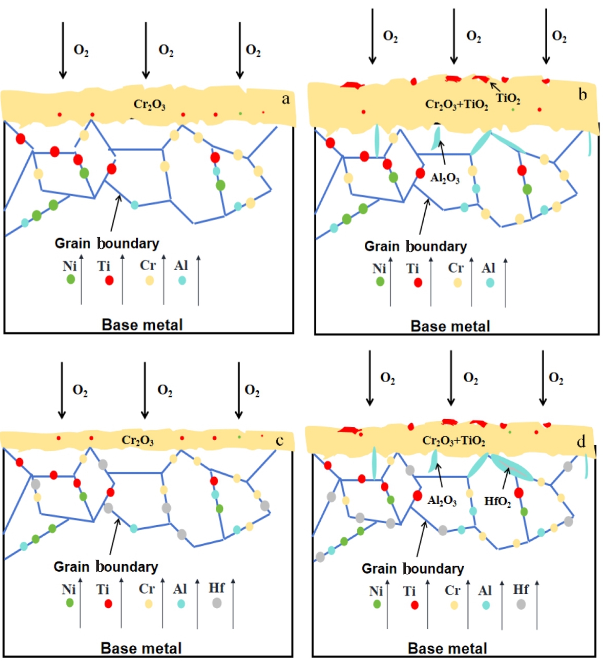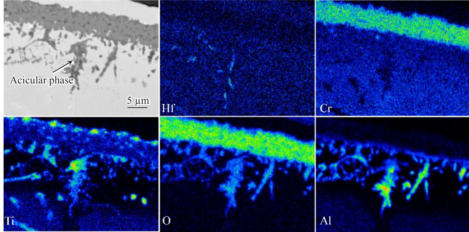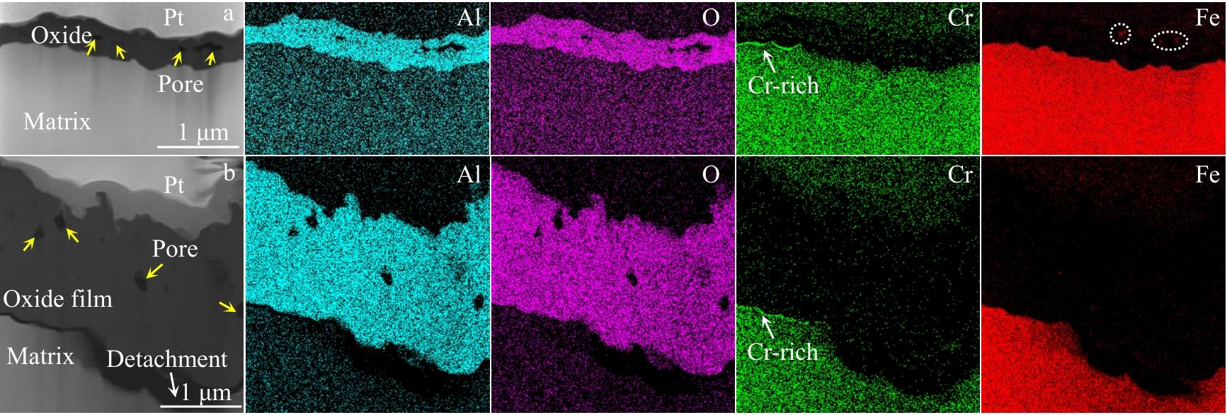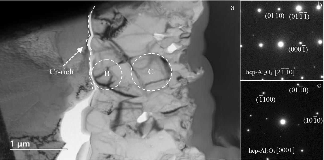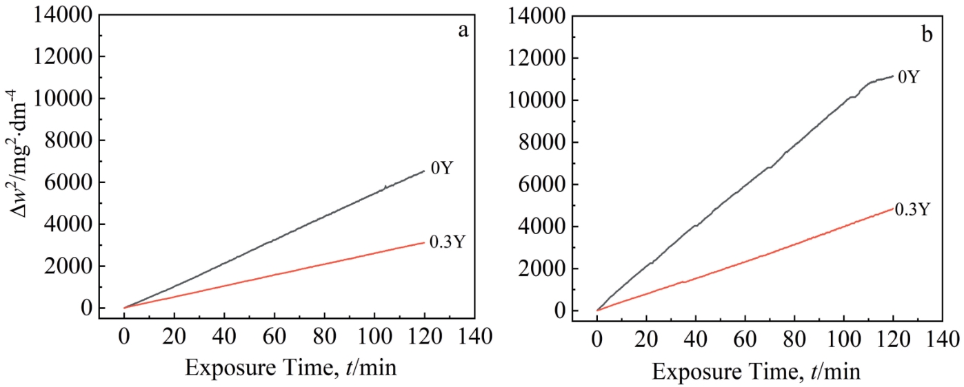 Abstract:The effect of Hf on high-temperature oxidation behavior of K4800 nickel-based superalloy was studied. The results show that the oxidation kinetics curves of K4800 and K4800+0.25Hf alloys obey parabolic law during thermostatical static oxidation at 800 and 850 ℃.However, the initial static oxidation rate of K4800+0.25Hf alloy (0.026 g/m2·h at 800 °C for 20 h and 0.061 g/m2·h at 850 °C for 20 h) is lower than that of K4800 alloy (0.041 g/m2·h at 800 °C for 20 h and 0.066 g/m2·h at 850 °C for 20 h). The oxide layer of the two experimental alloys consists of outer oxide layer and an inner oxide layer. The outer oxide layer primarily consists of dense Cr2O3, while the inner oxide layer mainly contains dendritic Al2O3. However, with the increase in Hf content from 0wt% to 0.25wt%, the thickness of the Cr2O3 outer oxide layer decreases from 2.71 μm to 2.17 μm after oxidation at 800 °C for 1000 h and from 5.83 μm to 4.09 μm after oxidation at 850 °C for 1000 h. The results of EPMA analysis indicate the formation of HfO2 at the grain boundary of the oxide layer in the K4800+0.25Hf alloy, promoting the formation of Al2O3 around HfO2 and accelerating the growth of Al2O3. The presence of Al2O3 and HfO2 at the grain boundary contributes to the reduction of the outward diffusion rate of Cr3+ and the delaying of thickening of the Cr2O3 oxide layer. Consequently, the trace addition of Hf enhances the oxidation resistance of the K4800 alloy.