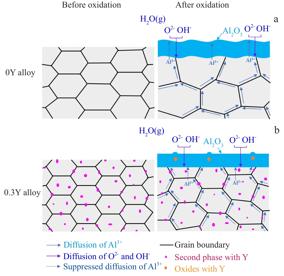 Abstract:Two types of Fe13Cr5AlxY with x=0, 0.3 (wt%) alloys, denoted as 0Y and 0.3Y, respectively, were prepared in a vacuum non-consumable arc furnace and exposed in 1000 and 1200 ℃ steam for 2 h. The high temperature oxidation behavior of the alloys was studied by thermogravimetric analyzer with steam generator. The microstructure and composition of the oxide film before and after oxidation were analyzed by XRD, FIB/SEM, EDS, and TEM. Results show that the addition of Y can refine the grains of FeCrAl alloys and form the spherical or elliptical hcp-Al3Fe14Y2 second phase. The oxidation kinetics of the Fe13Cr5AlxY (x=0, 0.3, wt%) alloys oxidized in 1000 and 1200 ℃ steam for 2 h follows a parabolic growth law. The addition of Y can decrease the oxidation mass gain rate of the alloys. The oxide film of the two alloys is mainly composed of α-Al2O3 and a small amount of Fe oxide exists on the outside of oxide film. The second phase in the oxide film of 0.3Y alloy is oxidized into YAlO3, Fe2O3 and Fe(Cr, Al)2O4. The ridged oxide film is formed on the surface of 0Y alloy. The oxide film of the alloy peels off from the substrate under oxidation at 1200 ℃. The oxide film on 0.3Y alloy is smooth and has good adhesion to the matrix. Therefore, the formation of the ridged oxide film is inhibited by adding Y, which can reduce the oxidation mass gain rate and enhance the high-temperature steam oxidation resistance of the alloy.
