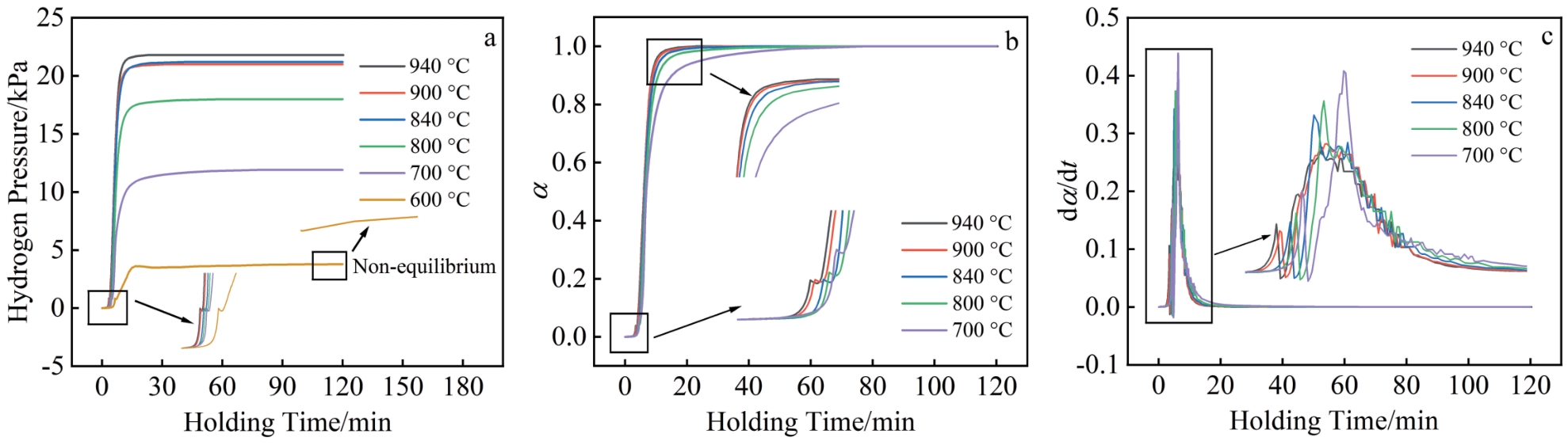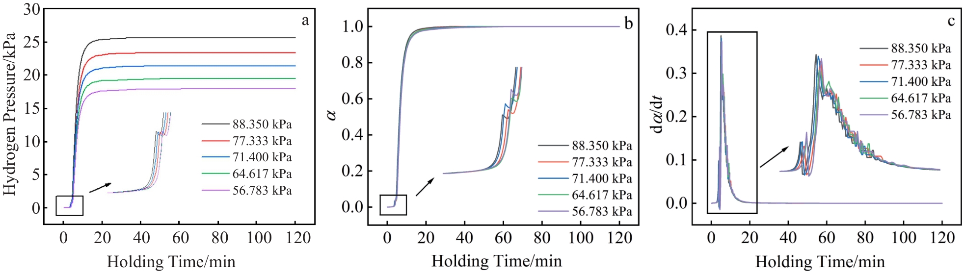 Abstract:Hydrogen desorption kinetics and characteristics, residual hydrogen content and activation energy of TC21 alloy were investigated by the constant volume method. Results show that hydrogen desorption temperature and initial hydrogen pressure affect hydrogen desorption characteristics of TC21 alloy. The hydrogen desorption process is mainly dominated by nucleation and growth process (kt=[-ln(1-α)]2/3), chemical reaction process (kt=(1-α)-1/2) and three-dimensional diffusion process (kt=[1-(1-α)1/3]1/2) when the hydrogenated TC21 alloy is dehydrogenated at temperatures of 700–940 °C. When the hydrogenated TC21 alloy releases hydrogen, the following relationship exists among the rate constants of each process: k (chemical reaction process)>k (nucleation and growth process)>k (three-dimensional diffusion process). The residual hydrogen content of the hydrogenated TC21 alloy after hydrogen desorption decreases gradually with the increase in hydrogen desorption temperature, and increases gradually with the increase in the initial hydrogen pressure. The activation energy of TC21 alloy in the process of hydrogen desorption is about 26.663 kJ/mol.