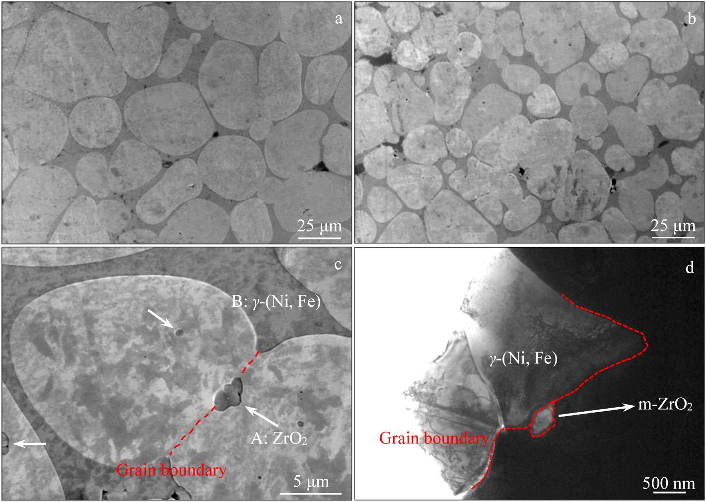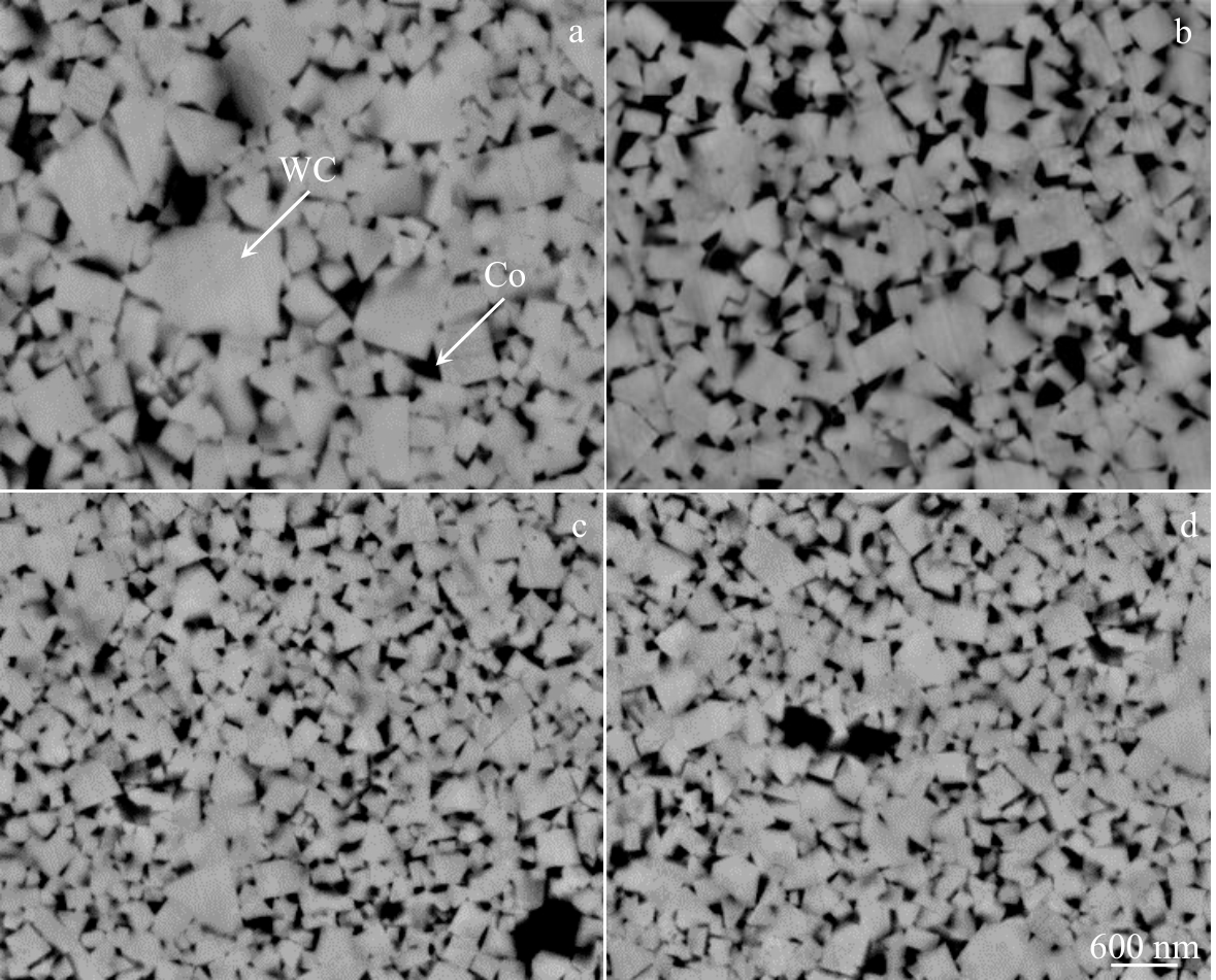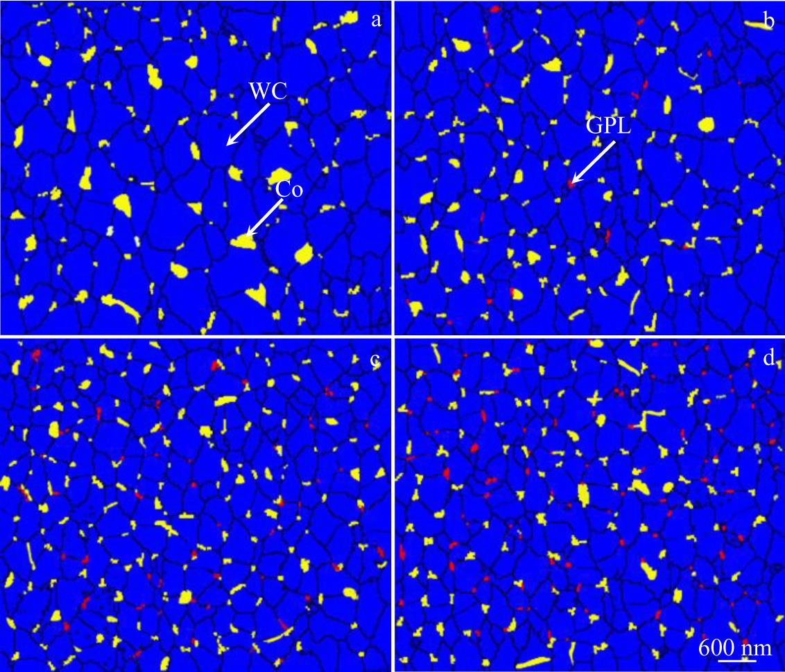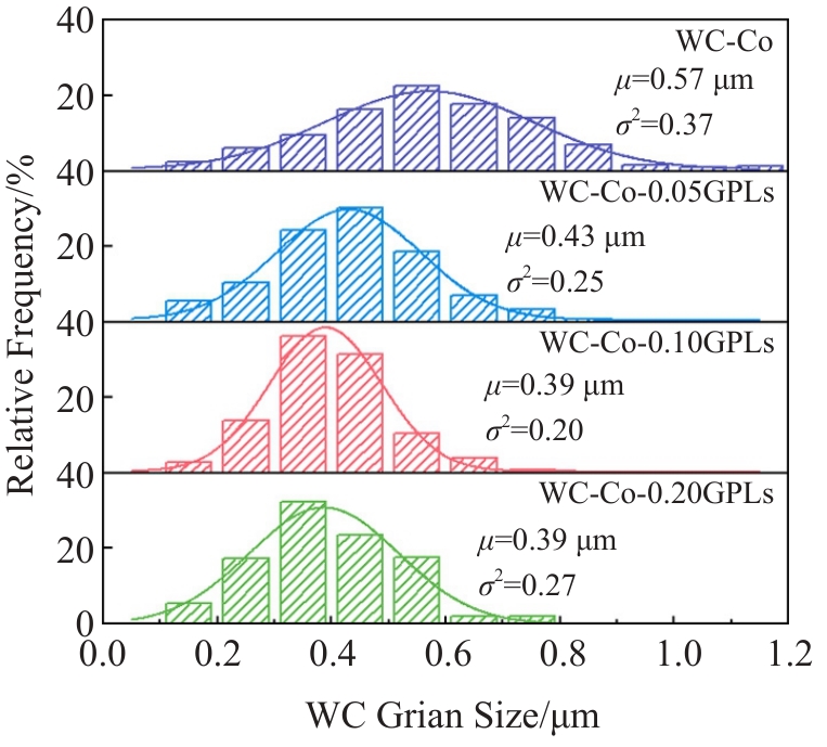 Abstract:The influence of graphene platelets (GPLs) on the WC grain size of WC-Co-GPLs cemented carbide prepared by low-pressure sintering was investigated. The role of GPLs in refining WC grains was explored by characterizing grain size and phase distribution. Results show that the addition of GPLs leads to significant grain refinement of WC and the more uniform distribution of WC grain size. When the content of GPLs is 0.10wt%, the average WC grain size in the cemented carbide is 0.39 μm, which is 32% lower than that in WC-Co. However, the shape of WC grains is almost unaffected, while the mean free path of Co decreases. The grain refinement of WC is attributed to the homogeneous distribution of GPLs between WC/WC and WC/Co grain boundaries, which hinders the solution and precipitation process of WC in liquid phase Co, as well as the migration and growth of WC grains. Additionally, GPLs can serve as heat transfer plates in materials to improve cooling efficiency, thus inhibiting the growth of WC grain.