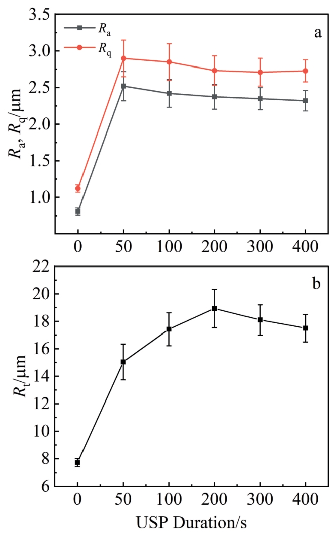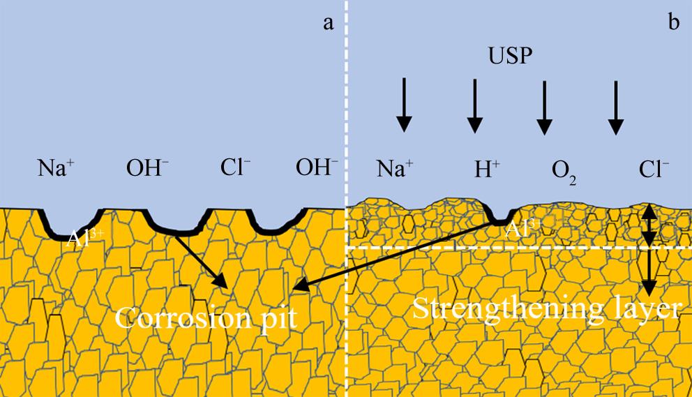 Abstract:According to surface morphology, microhardness, X-ray diffraction, and static contact angle experiments, the changes in the surface integrity and corrosion resistance of 6061-T6 aluminum alloy after ultrasonic shot peening (USP) were investigated. Results show that the grain size of the material surface is reduced by 43%, the residual compressive stress has an increasing trend, the roughness and hardness are increased by approximately 211.1% and 35%, respectively. And the static contact angle is increased at first, followed by a slight decrease. Weighing, scanning electron microscope, and energy dispersive spectrometer were used to study the samples after a cyclic corrosion test. Results show that USP reduces the corrosion rate by 41.2%. A model of surface corrosion mechanism of USP is developed, and the mechanism of USP to improve the corrosion resistance of materials is discussed. The introduction of compressive residual stresses, grain refinement, increased grain boundaries, increased hardness, and increased static contact angle are the main factors related to the improvement of corrosion resistance in most materials, while increased roughness tends to weaken surface corrosion resistance.