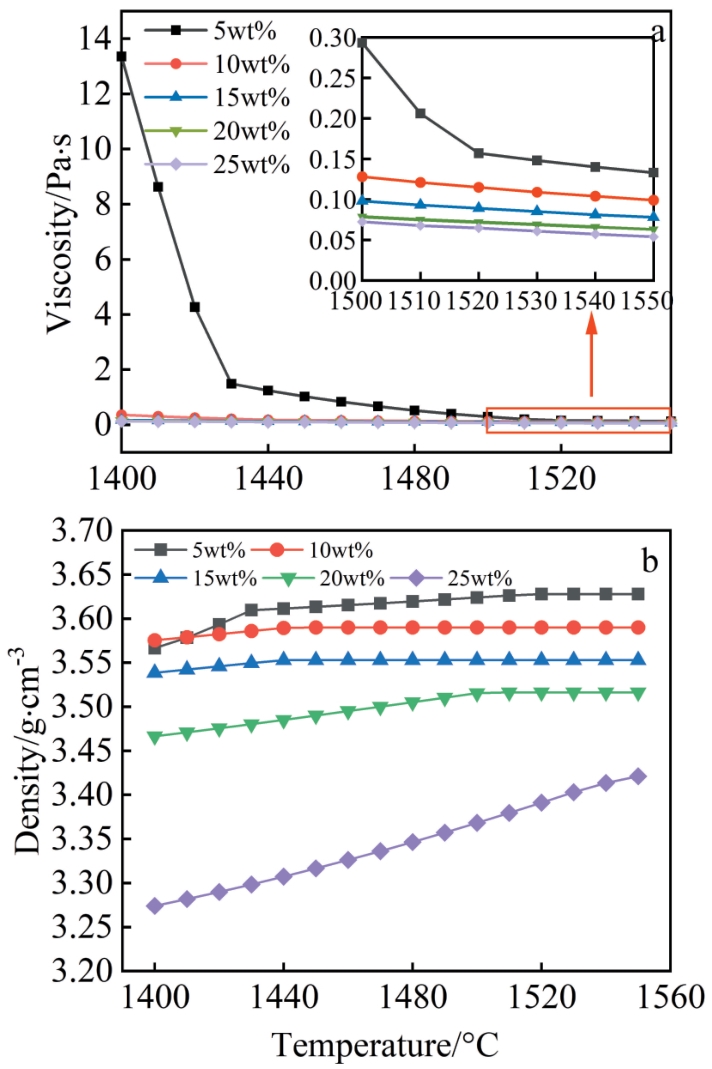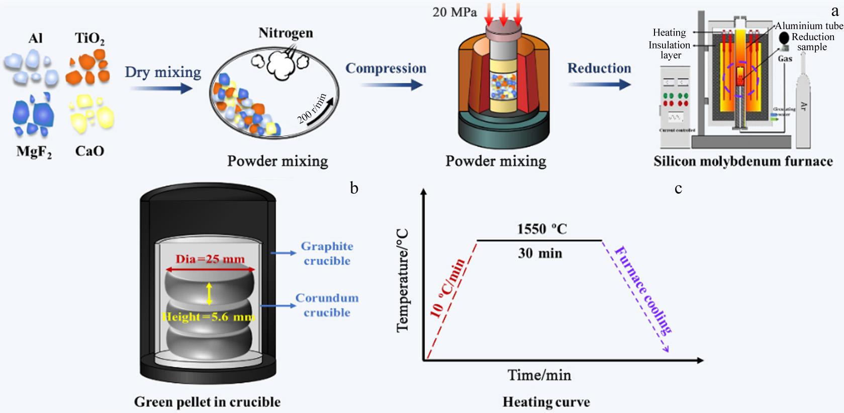 Abstract:The Ti-Al alloy was synthesized using the aluminothermic reduction of TiO2, with CaO and MgF2 serving as flux components. Investigations were conducted to ascertain the effects of MgF2 content on the alloy-slag separation, alloy microstructure, composition, phase constitution, overall alloy yield, and aluminothermic reduction of TiO2. Results indicate that MgF2 enhances the separation of the alloy from slag and promotes the formation of the TiAl phase within the alloy matrix. Nevertheless, an overabundance of MgF2 reduces the interfacial tension between the Al reductant and the slag, leading to significant loss of Al. This adversely affects alloy-slag separation, escalates the incorporation of oxide inclusions in the alloy, and severely reduces the recovery rate of alloy. Concurrently, the alloy has a phase transition from TiAl to Ti3Al. The optimum condition for alloy-slag separation and alloy integrity is realized at the MgF2 content of 10wt%. Kinetic analysis at this flux ratio determines the activating energy for the Al-TiO2-CaO-MgF2 system, which is 409.729 kJ/mol, and the order of kinetics is n=0.38.
