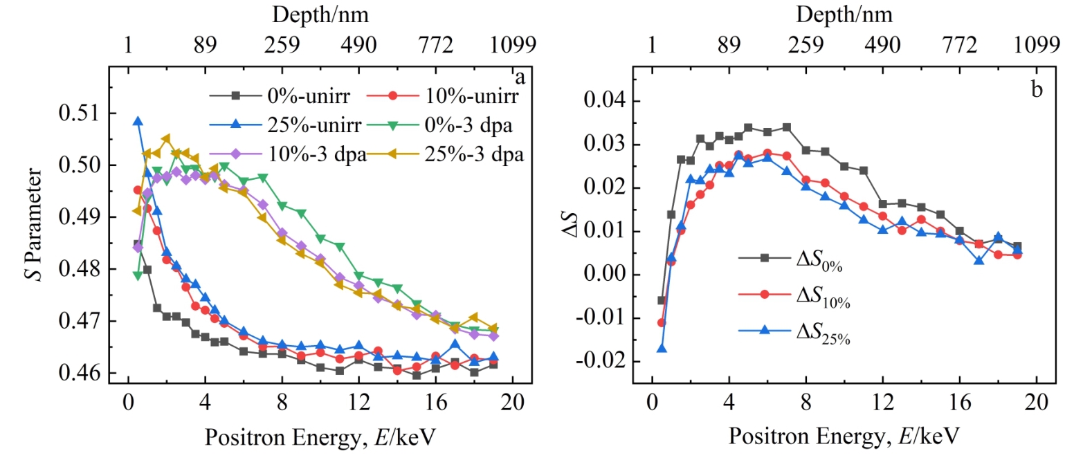 Abstract:The interaction between dislocations and helium-induced defects in Ti-5331 alloy with different cold rolling deformations (0%, 10%, 25%), and the retention behavior of helium in the alloy were investigated by positron annihilation spectroscopy (PAS), transmission electron microscopy (TEM), and grazing incidence X-ray diffraction (GIXRD). The results show that the dislocations generated by deformation in Ti-5331 alloy hinder the diffusion of injected helium atoms into the alloy. Moreover, a large number of vacancy defects generated by irradiation in the alloy form helium vacancy complexes with helium atoms, which finally evolve into helium bubbles. The irradiation damage of the inner layer of Ti-5331 alloy after deformation is lower than that of the surface layer. Additionally, the helium desorption amounts of the alloy with deformations of 0%, 10%, and 25% are 1.576×1015, 1.894×1015, and 2.171×1015 ions/cm2, respectively, indicating that the larger the deformation, the more the helium retention in the alloy.