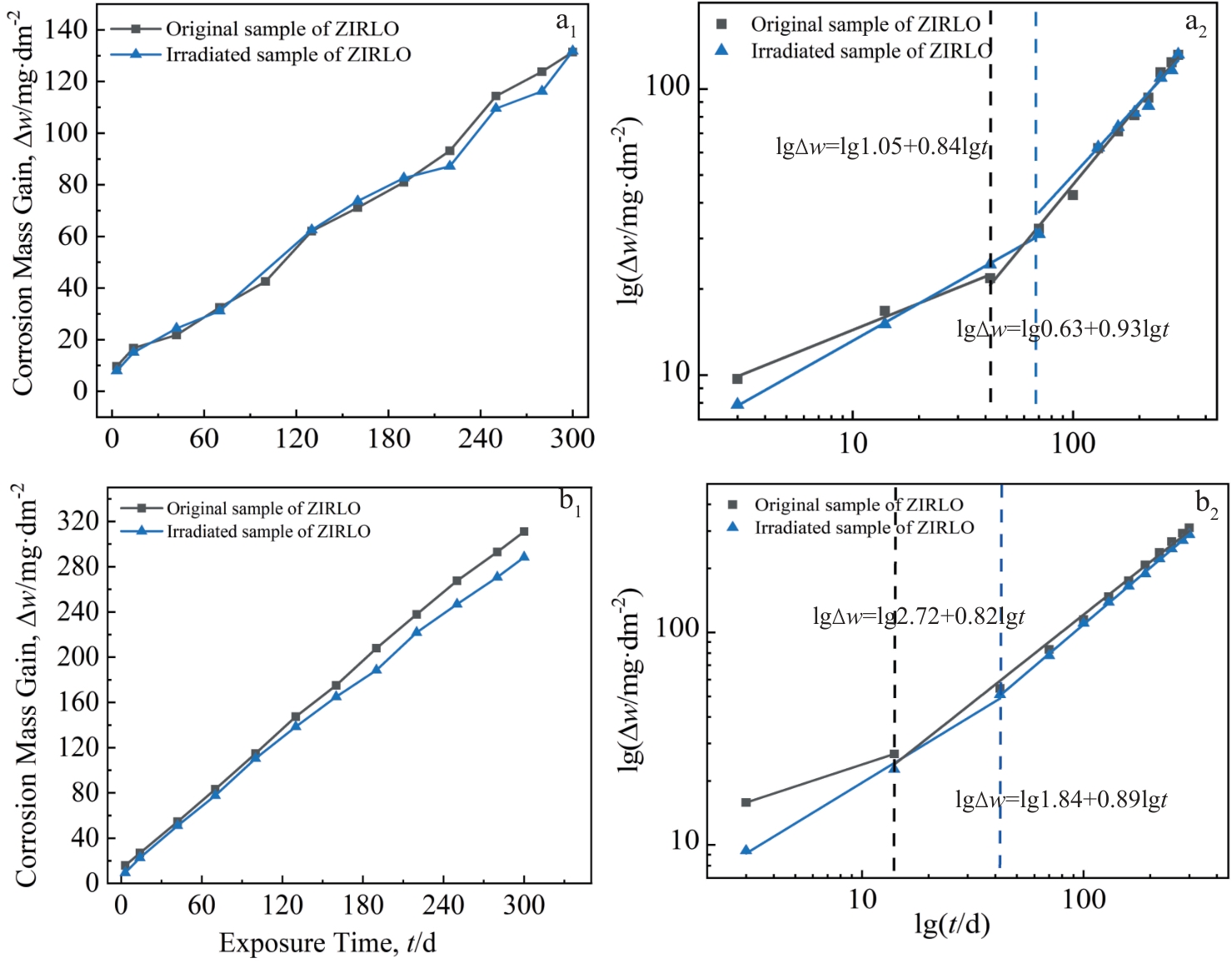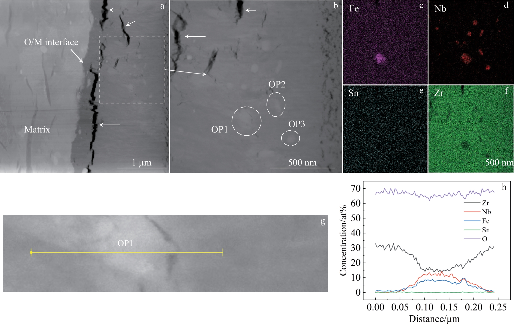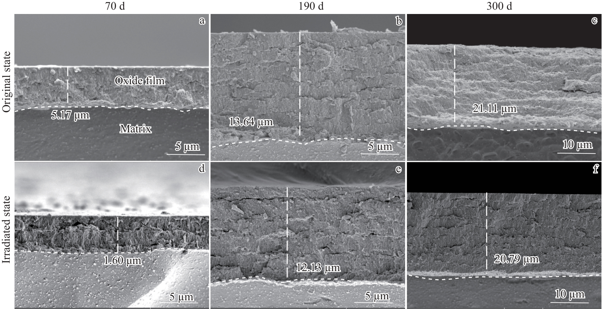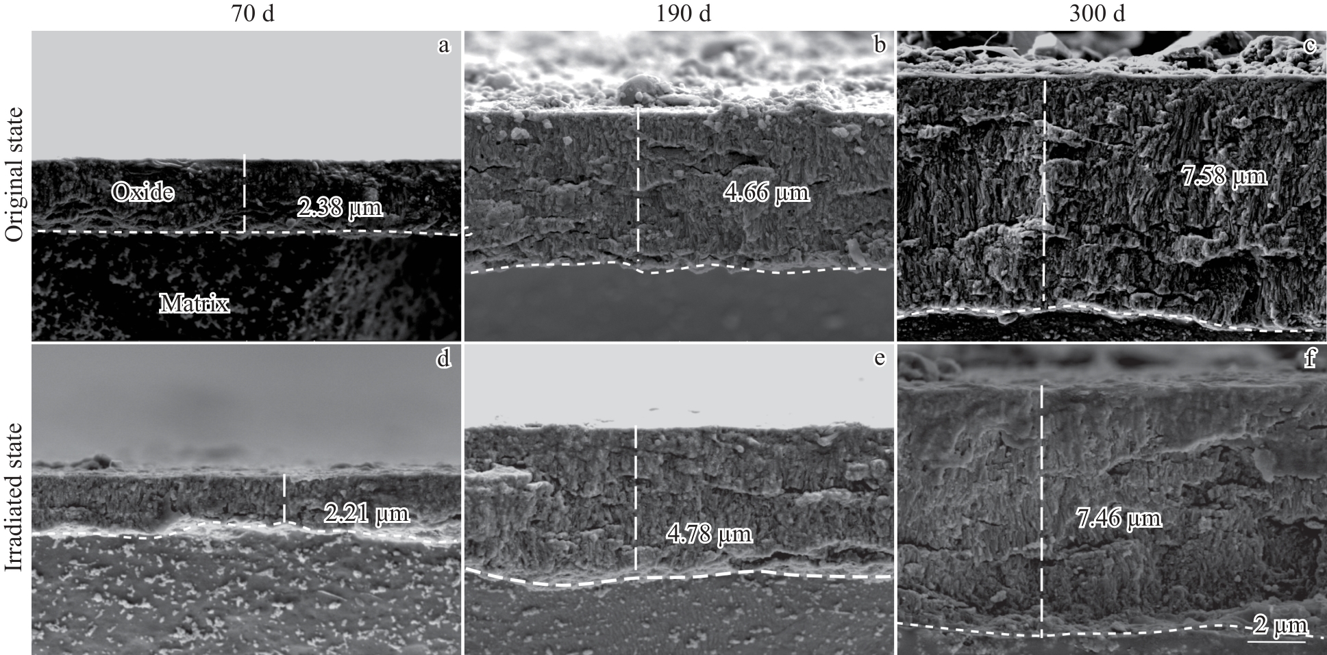 Abstract:Zirconium alloys used as nuclear fuel cladding materials are subjected to neutron irradiation inside the reactor, which affects their corrosion resistance. Ion irradiation can be used to simulate neutron irradiation to study the effect of irradiation on corrosion behavior. In this study, the Zr-4 plate was irradiated with Ar+ at 360 ℃ with an electrostatic accelerator. The unirradiated and 5 dpa irradiated samples were corroded in 360 ℃/18.6 MPa/3.5 μL/L Li+1000 μL/L B aqueous solution and 400 ℃/10.3 MPa super-heated steam for 300 d. The microstructure of the samples was characterized by SEM and TEM. Results show that the Zr(Fe,Cr)2 second-phase particles in the unirradiated samples have hexagonal close-packed structures, whose Fe/Cr atomic ratio is in the range of 1.8–2.0, and the second-phase particles are amorphized after irradiation. Under the two corrosion conditions, during the corrosion process of the irradiated damage zone in the alloy matrix, the oxide film thickness of the irradiated samples is smaller than that of the unirradiated samples, indicating that Ar+ irradiation can enhance the corrosion resistance of Zr-4 to a certain extent. However, once the irradiated damage zone is fully oxidized, as corrosion proceeds, the oxide film thickness of the irradiated samples becomes greater than that of the unirradiated samples, suggesting that the oxide film formed in the irradiated damage zone facilitates the diffusion of oxidative ions, accelerating the corrosion of Zr-4. The influence of irradiation on the corrosion resistance of Zr-4 at different stages is discussed from the perspectives of microstructure evolution and stress accumulation in the oxide film induced by irradiation-induced defects.
