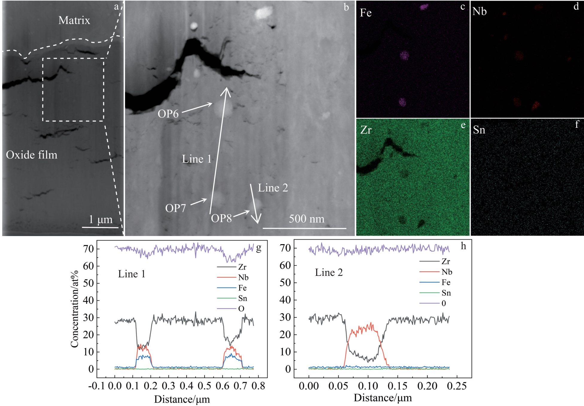 Abstract:Irradiation can induce the formation of a large number of defects in the matrix and oxide film of zirconium alloys, thereby facilitating the migration and diffusion of O2- and corrosive media and accelerating the corrosion of zirconium alloys. To investigate the influence of irradiation on Zr-Sn-Nb alloys, Ar+ was implanted into the alloys at an irradiation in fluence of 5.1×1015 ions/cm2. The original and irradiated samples were subjected to corrosion tests in an aqueous solution of 360 ℃/18.6 MPa/3.5 μL/L Li+1000 μL/L B (alkaline water) and in steam at 400 ℃/10.3 MPa (neutral water), separately. The microstructure and the effect of Ar+ irradiation on the corrosion resistance of Zr-Sn-Nb alloys in different corrosion environments were analyzed by XRD, SEM, and TEM. The results indicate that irradiation can lead to the amorphization of the second phase particles, among which the hcp-Zr(Fe,Nb)2 second phase is more likely to form an amorphous state phase than the bcc-β-Nb second phase. Furthermore, the second phase undergoes amorphization at the same time with element diffusion, and during the oxidation process of the second phase, it experiences lattice mismatch with the oxide film, resulting in cracks extending from the top of the second phase to its sides. Within 300 d, the damage dose of Ar ion irradiation at 5 dpa has little effect on the corrosion resistance of Zr-Sn-Nb alloys in the aqueous solution of 3.5 μL/L Li+1000 μL/L B. In contrast, in steam at 400 ℃/10.3 MPa, the stress relaxation during the irradiation process results in a reduction in defects, which subsequently slows down the oxygen diffusion within the oxide film and decelerates the corrosion process. Therefore, irradiation has a certain improving effect on the corrosion resistance of zirconium alloys.