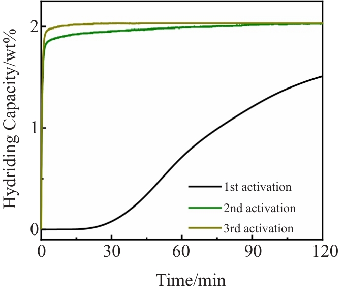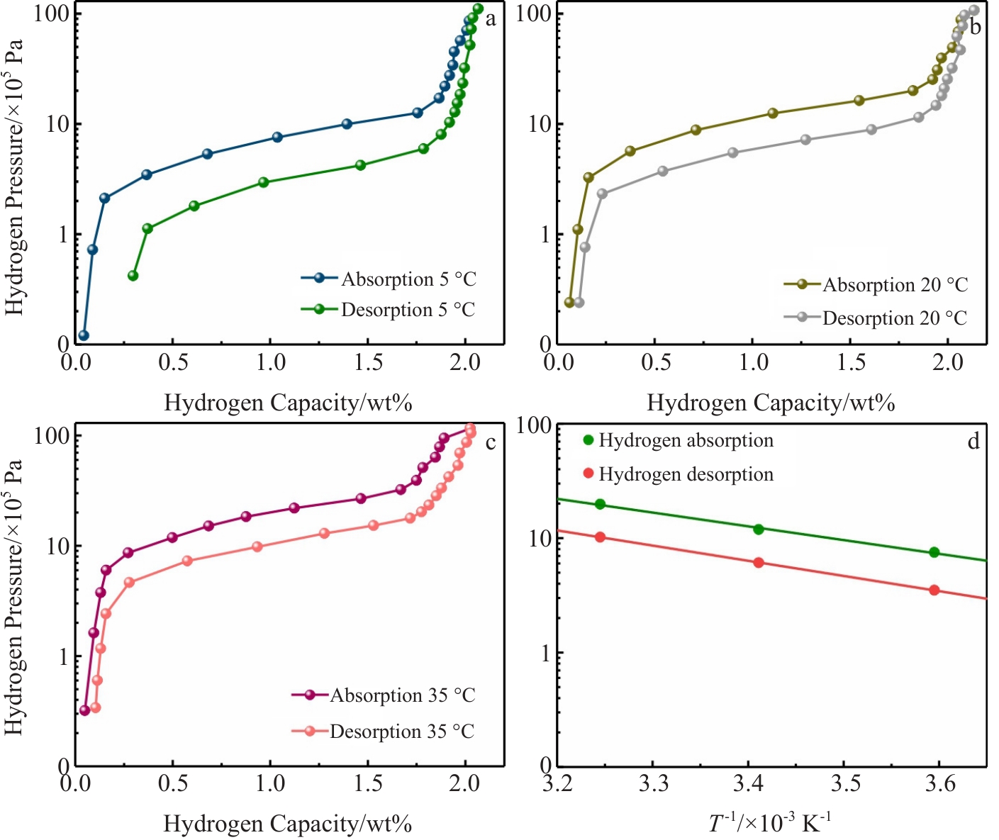 Abstract:The hydrogen storage properties of Ti0.8Zr0.2Mn1.2Cr0.6(V-Fe)0.2 alloy and its rare earth modification effect were studied. The results show that Ti0.8Zr0.2Mn1.2Cr0.6(V-Fe)0.2 alloy has excellent comprehensive hydrogen storage performance, with a hydrogen storage capacity more than 2 wt% at room temperature. After adding rare earth La or Ce for modification, the activation performance is further improved. The alloy added with 5wt% Ce can be activated by only one hydrogen absorption and desorption cycle, and has good hydrogen absorption and desorption cycling stability. After 100 hydrogen absorption and desorption cycles, the hydrogen absorption rate does not change significantly, and the capacity retention rate is 99%. A tubular hydrogen storage equipment with capacity greater than 180 N·m3 was designed and manufactured using this alloy as the medium, and it was combined with a fuel cell to form a hydrogen-electric conversion system, which could provide stable power generation and generate power more than 200 kW·h at one time when filled with hydrogen.