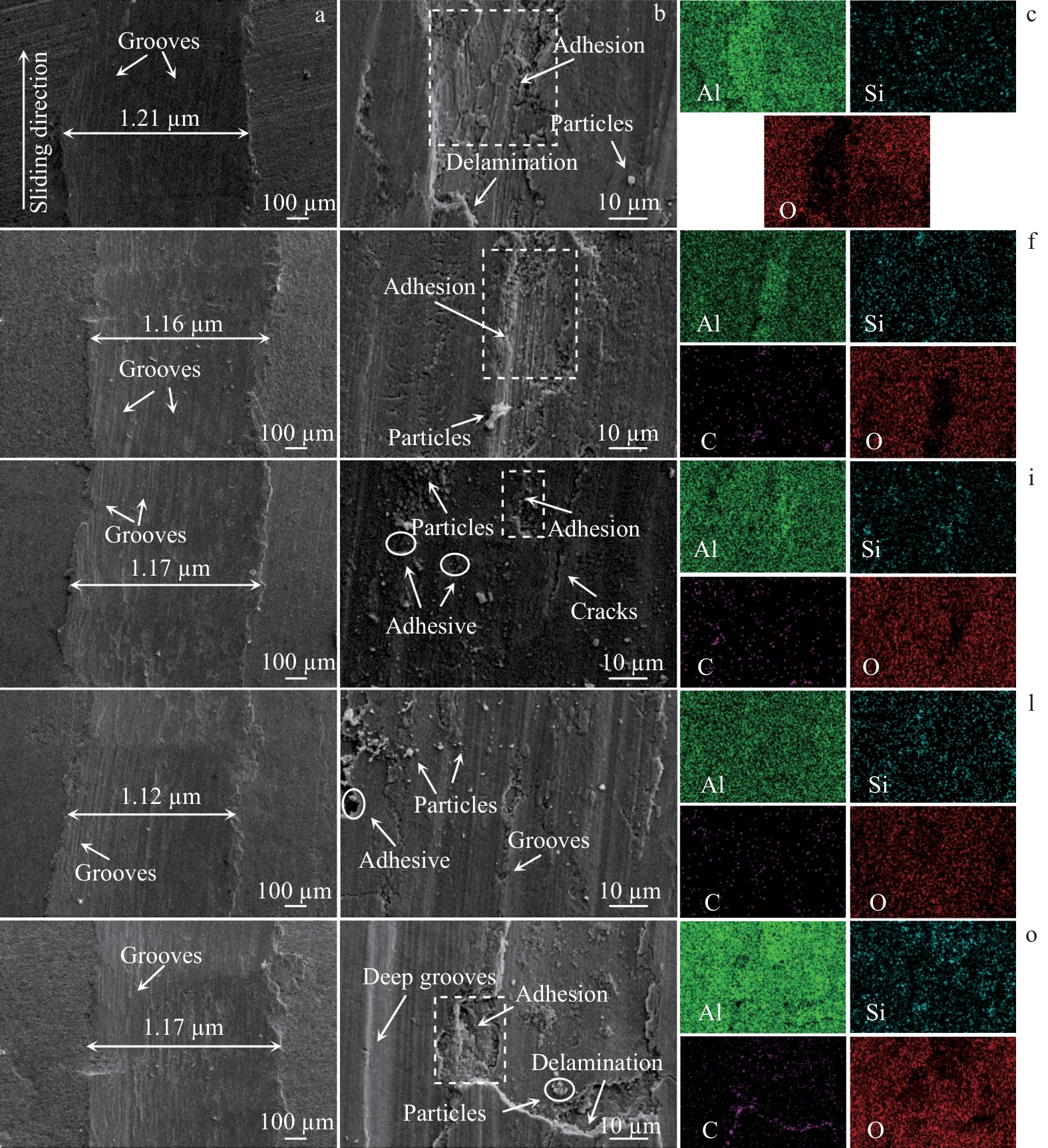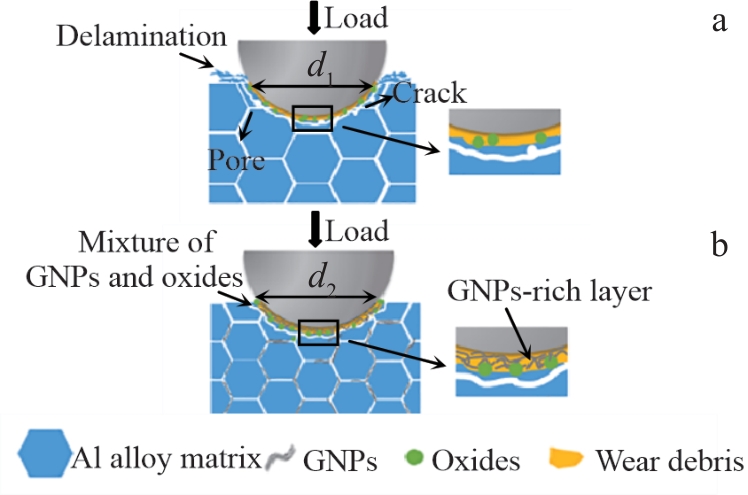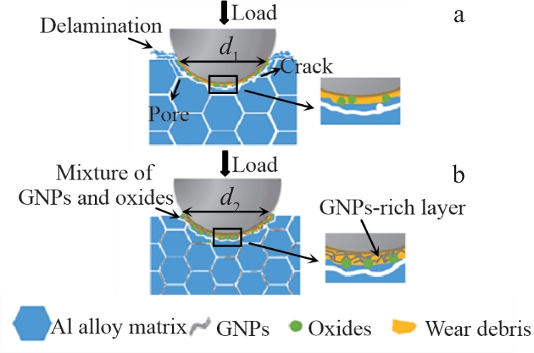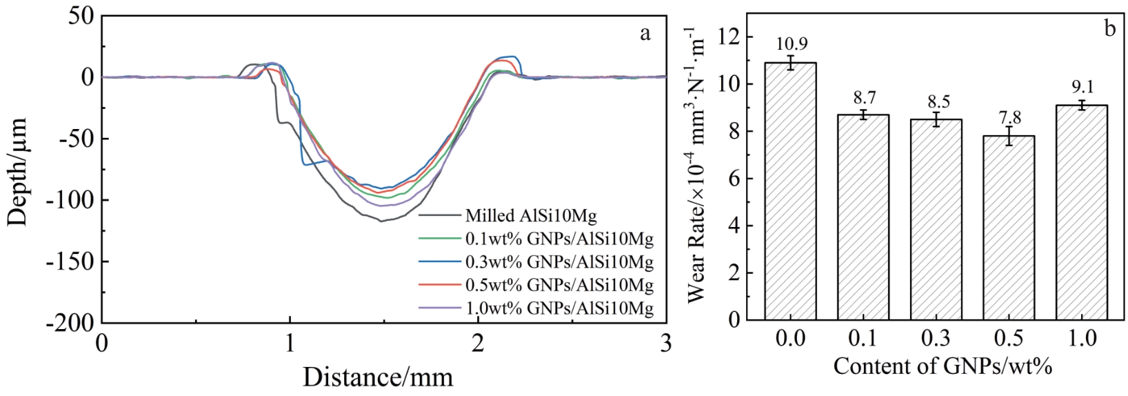 摘要:通过乙基纤维素(EC)对石墨烯纳米片(GNPs)表面改性,结合溶液超声分散和湿法球磨的方法,既实现GNPs和铝基体均匀混合,又抑制GNPs损伤,然后采用放电等离子快速烧结抑制界面反应,制备高耐磨的GNPs/AlSi10Mg复合材料。通过扫描电镜、透射电镜和摩擦试验机等设备对GNPs/AlSi10Mg复合材料的显微组织与耐磨性能进行表征分析,结果表明GNPs适量添加能有效提升复合材料的力学性能,GNPs添加量为0.5wt%时,复合材料的磨损率和摩擦系数最低,分别为7.8×10-4 mm3/(N·m)和0.417,磨损率较基体材料(10.9×10-4 mm3·N-1·m-1)降低了28.4%。GNPs/AlSi10Mg复合材料的磨损机制以磨粒磨损为主,伴随着轻微氧化磨损和粘着磨损。摩擦过程中复合材料试样与对偶接触时,在剪切力作用下GNPs露出表面形成薄膜,可作为润滑剂减少对偶与基体的接触点,防止过多的剥落和分层,起到保护基体的作用。