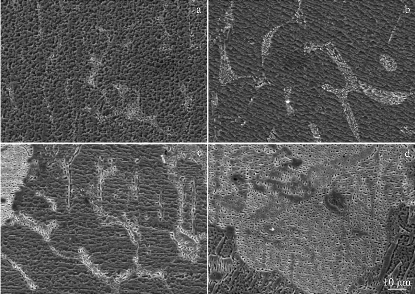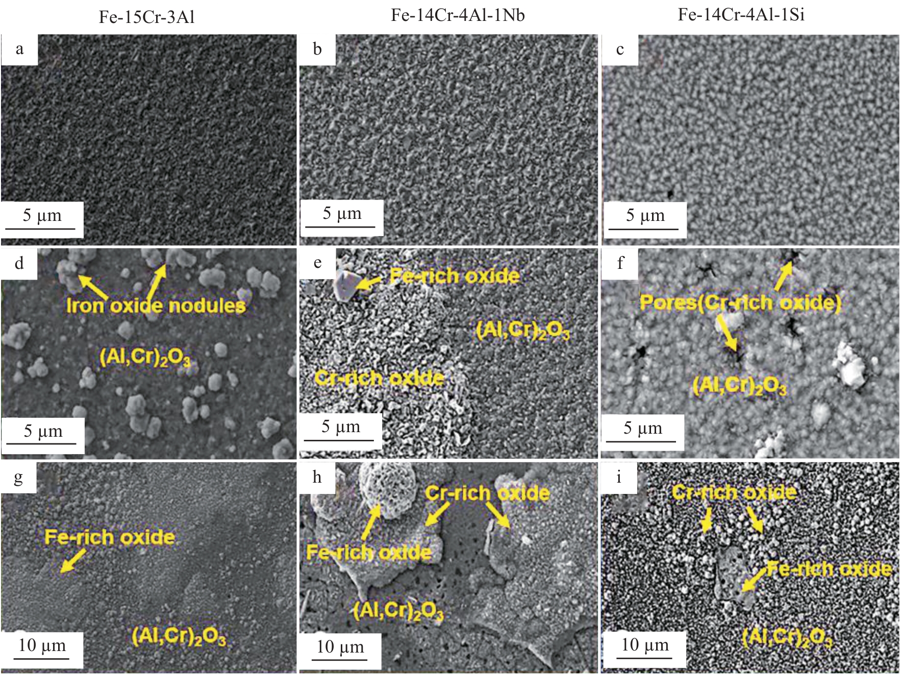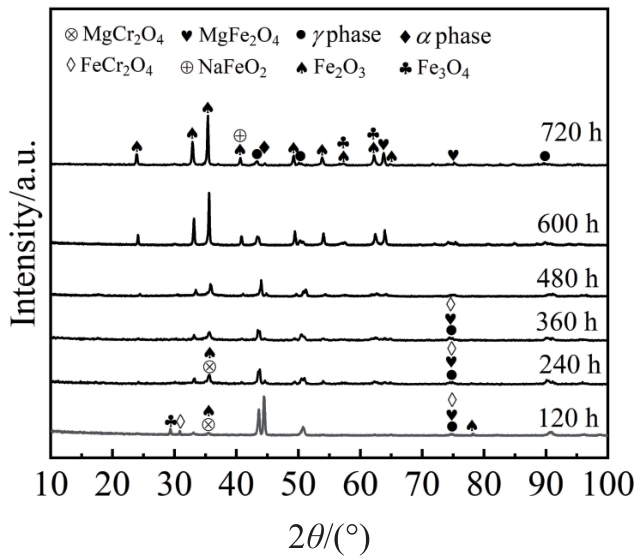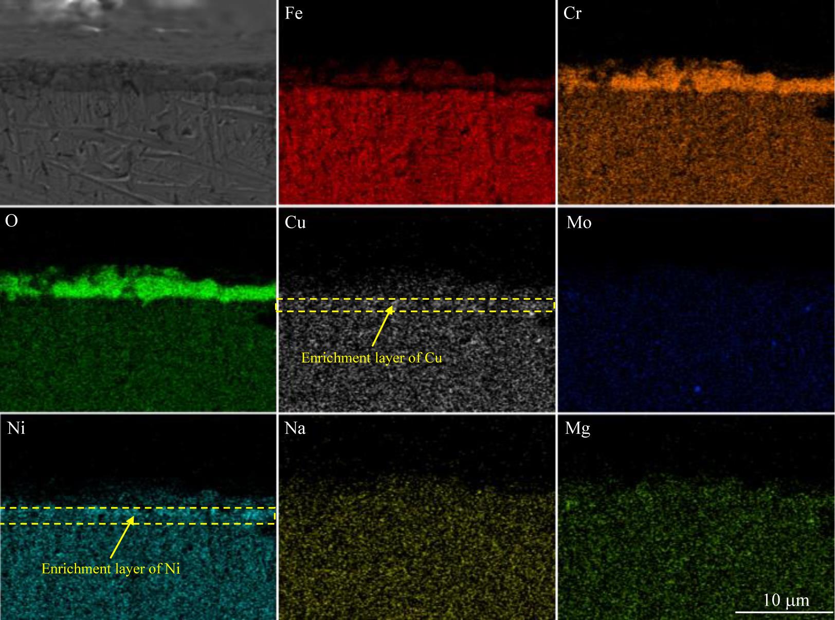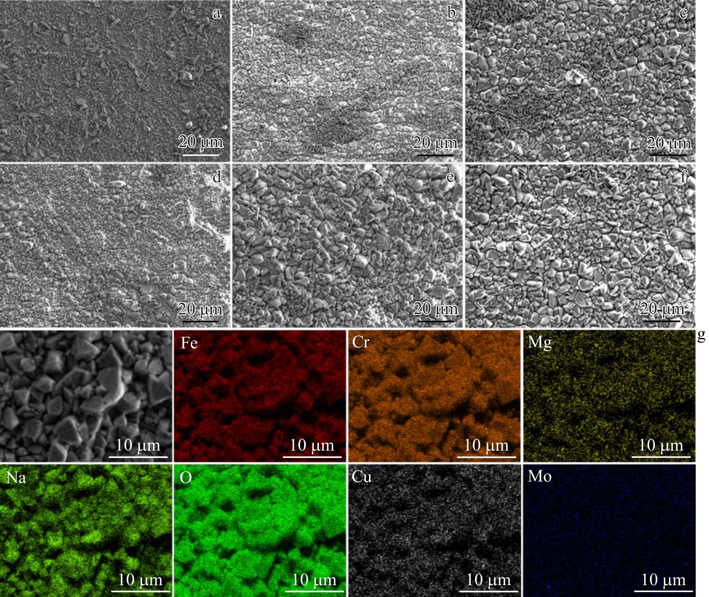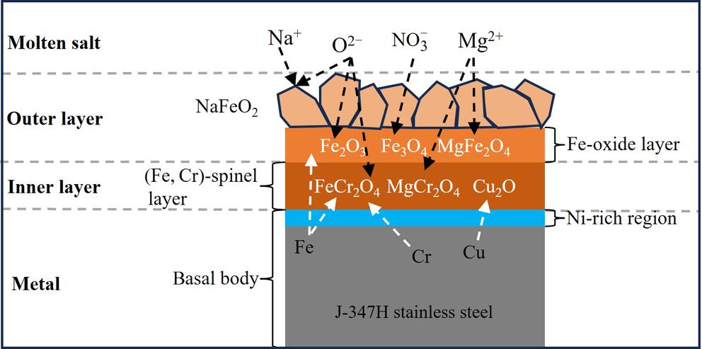 摘要:对Cu、Mo元素合金化的347H不锈钢在565 ℃的硝酸盐(60% NaNO3+40% KNO3)中进行长达720 h的静态腐蚀实验,通过分析腐蚀产物的物相组成、微观形貌和化学成分,研究Cu、Mo元素对347H不锈钢耐熔盐腐蚀的影响。结果表明:Mo元素可以细化晶粒,使不锈钢具有耐腐蚀性能最好的中等晶粒度;不锈钢在硝酸盐中发生均匀腐蚀,腐蚀层为双层结构,内外层均存在保护基体的腐蚀产物,外层由Fe的氧化物层(Fe2O3、Fe3O4)、NaFeO2层以及少量的MgFe2O4组成,内层主要由尖晶石层(FeCr2O4、MgCr2O4)和Cu2O薄层组成。Cu在内层被氧化形成致密的Cu2O,能有效阻隔O2-等离子向基体渗透。