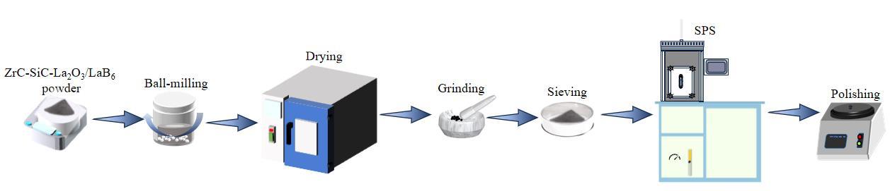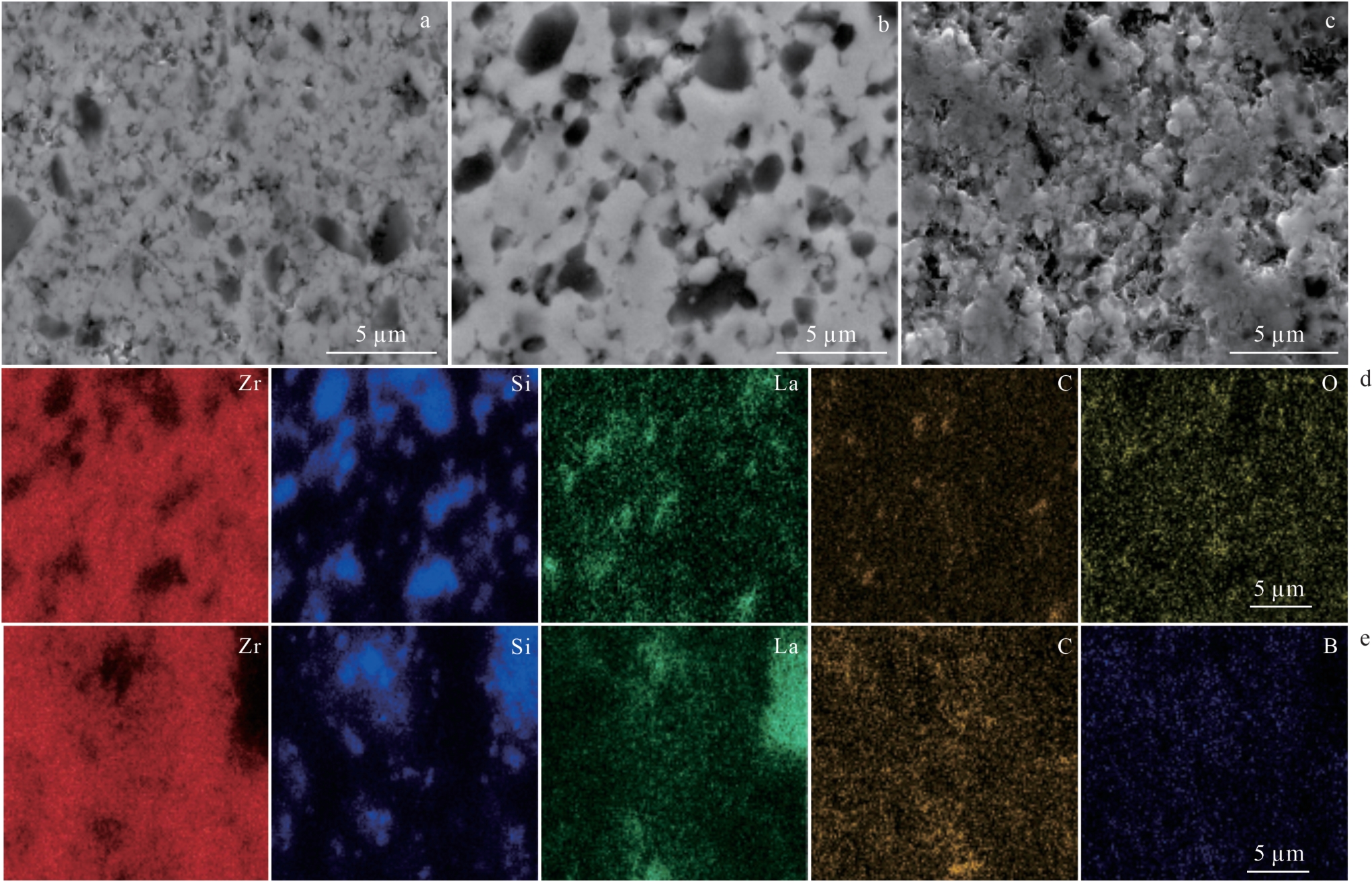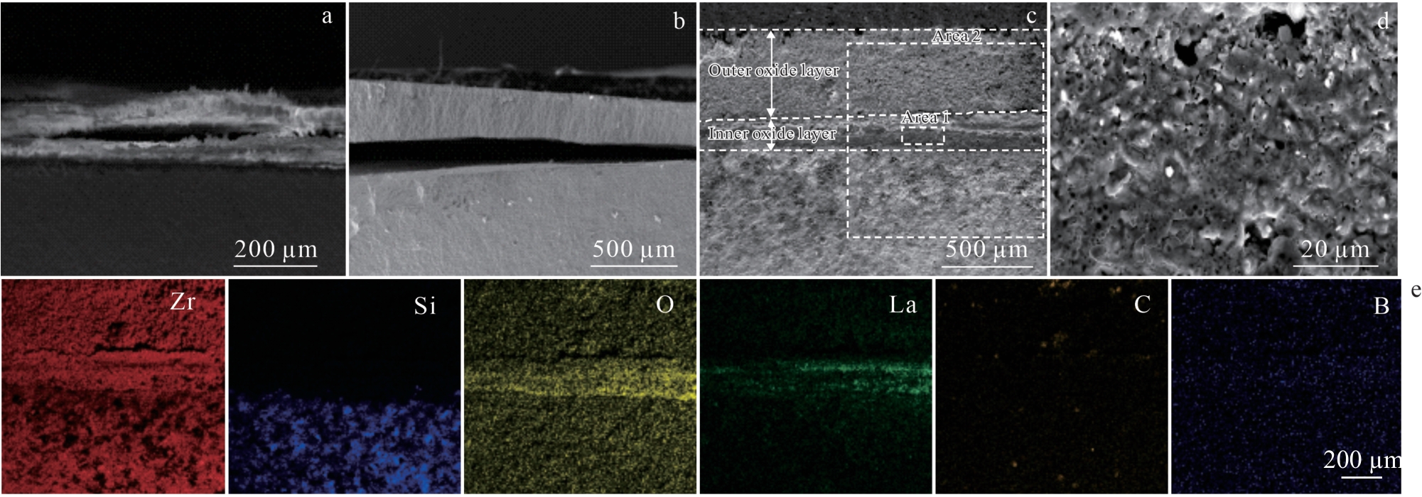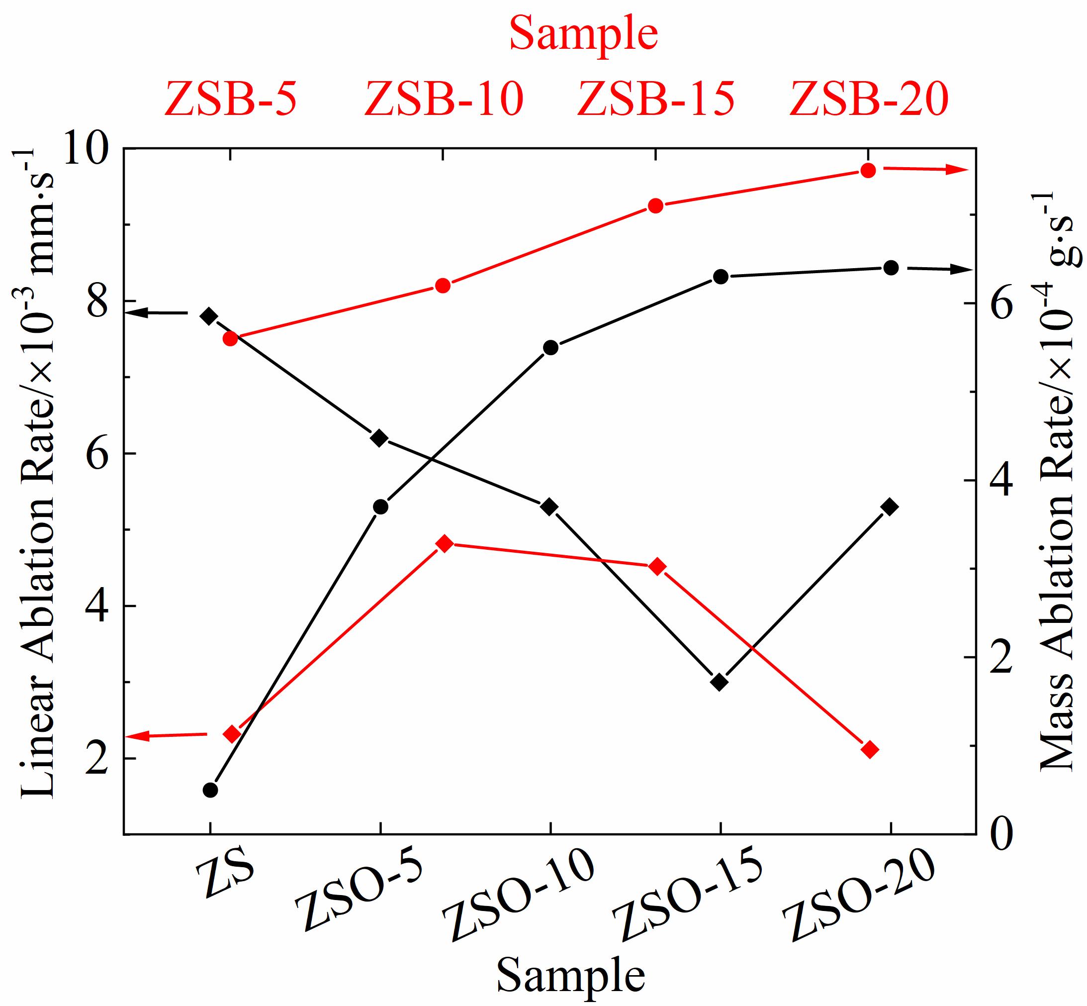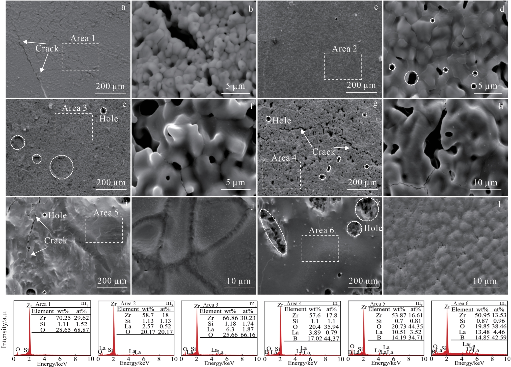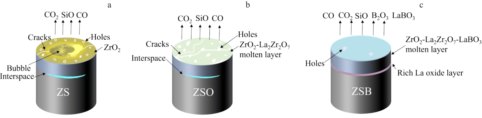 摘要:为了提高ZrC-SiC陶瓷的抗烧蚀性能,采用放电等离子烧结法在1600℃/50 MPa条件下制备了一系列不同含量La2O3和LaB6改性的ZrC-SiC复相陶瓷,在热流密度为2380 kW/m2的氧乙炔焰下考核了材料的抗烧蚀性能。结果表明:La2O3和LaB6的加入不仅提高了ZrC-SiC的烧结性能,致密度增加,还提升了其抗热震性能。随着添加量的加大,烧蚀后试样表面氧化层从破裂逐渐趋于完整。相比而言,La2O3改性后烧蚀表面形成的ZrO2-La2Zr2O7固溶层仍存在较多的孔洞和裂纹,而且与内部陶瓷结合差,防护效果有限。LaB6加入后,烧蚀过程中低熔点硼化物的挥发可将材料的烧蚀温度降低约300 ℃,试样烧蚀中心表面形成热稳定性好的La2Zr2O7-LaBO3-ZrO2外氧化层和粘结性佳的富镧Zr-O-La-B内氧化层,该双层结构的保护膜成为阻挡氧化气流进入材料内部的密实屏障,有效提高了材料的抗烧蚀性能,添加20vol% LaB6的ZrC-SiC综合抗烧蚀性能最佳。氧乙炔烧蚀60 s后,其质量烧蚀率和线性烧蚀率分别为7.5×10-4 g/s和2.1×10-3 mm/s。