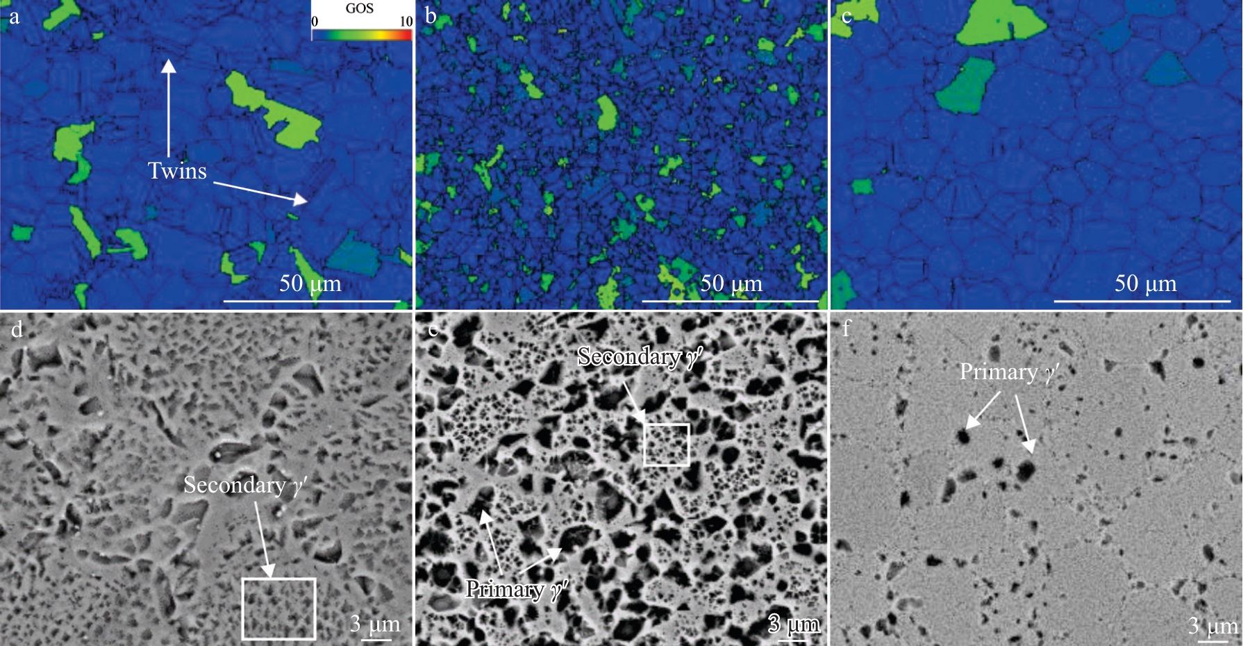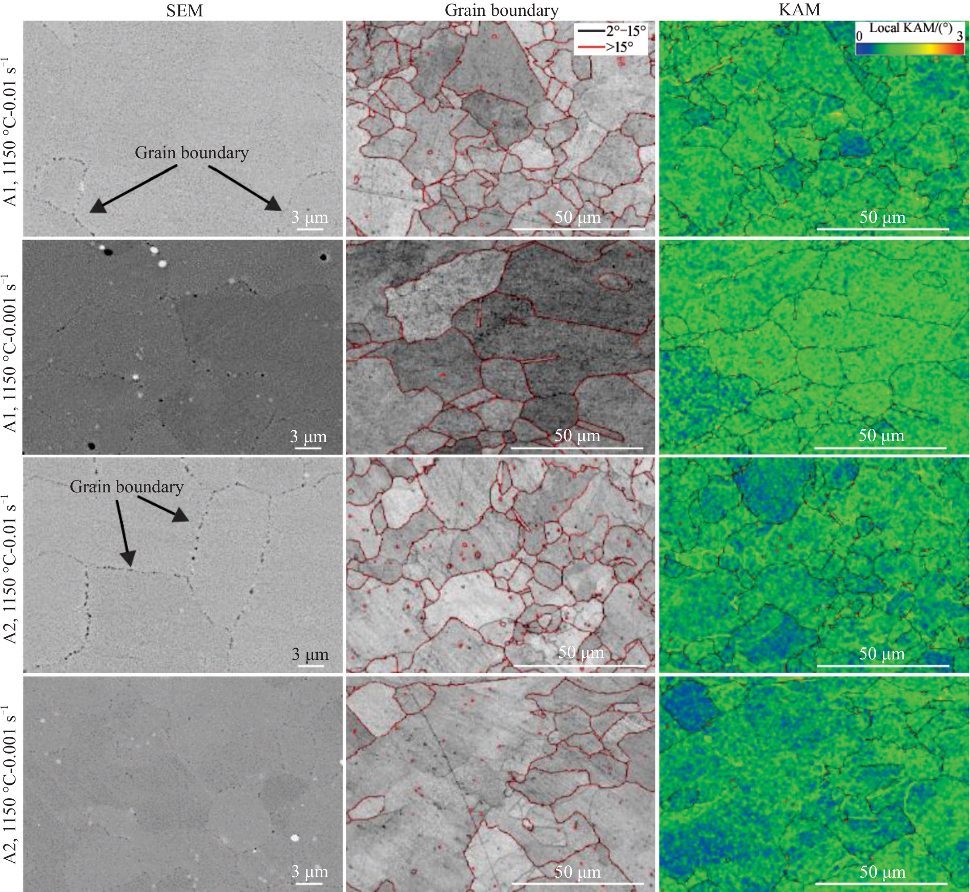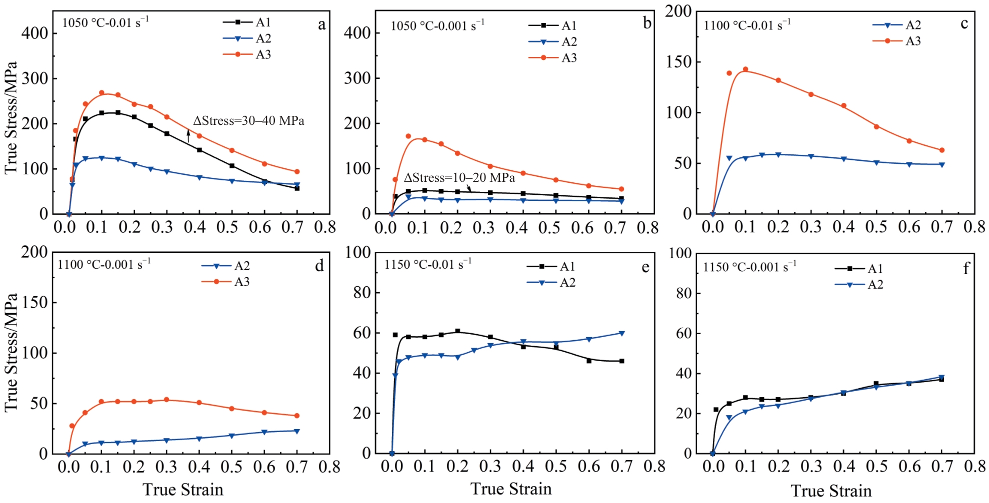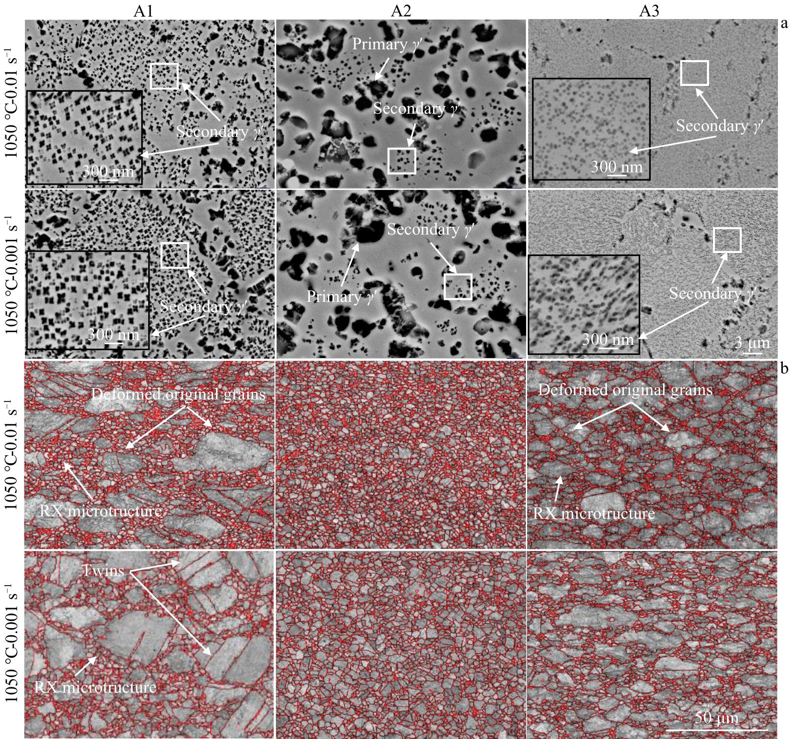 摘要:研究了热等静压(HIP,A1)、热等静压+1100 ℃热挤压(A2)、热等静压+1150 ℃热挤压(A3)3种不同热变形条件下的热压缩曲线和变形组织。结果表明:1100 ℃挤压的A2样品具有均匀的γ+γ′双相细晶粒组织,1050和1100 ℃条件下均表现出良好的热变形性能。在较大应变范围内,A2样品的真应力-真应变曲线保持了硬化-软化平衡状态,变形后平均晶粒尺寸5 μm。热等静压态A1样品和1150 ℃挤压A3样品在1050 ℃仍处于变形软化阶段,组织为原始粗大晶粒和细小再结晶晶粒的混合项链晶,样品的再结晶形核机制主要为应变诱发晶界弓弯形核。1150 ℃?0.001 s-1条件下,初始组织对热变形行为和变形后组织的影响相对较小,变形后组织为完全再结晶的晶粒。细晶组织有利于最大化合金的热变形潜力。通过合理地调控变形机制,可以获得细小均匀的变形组织。