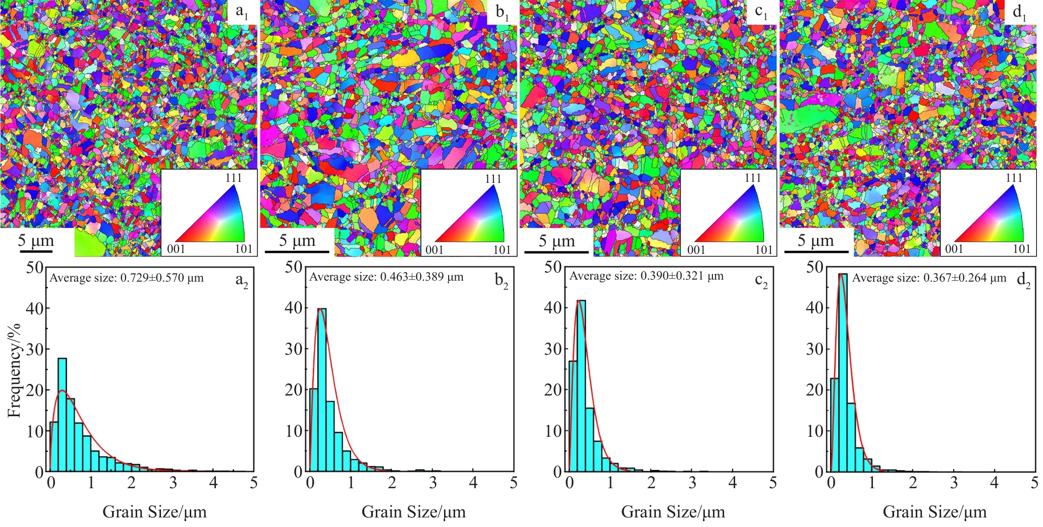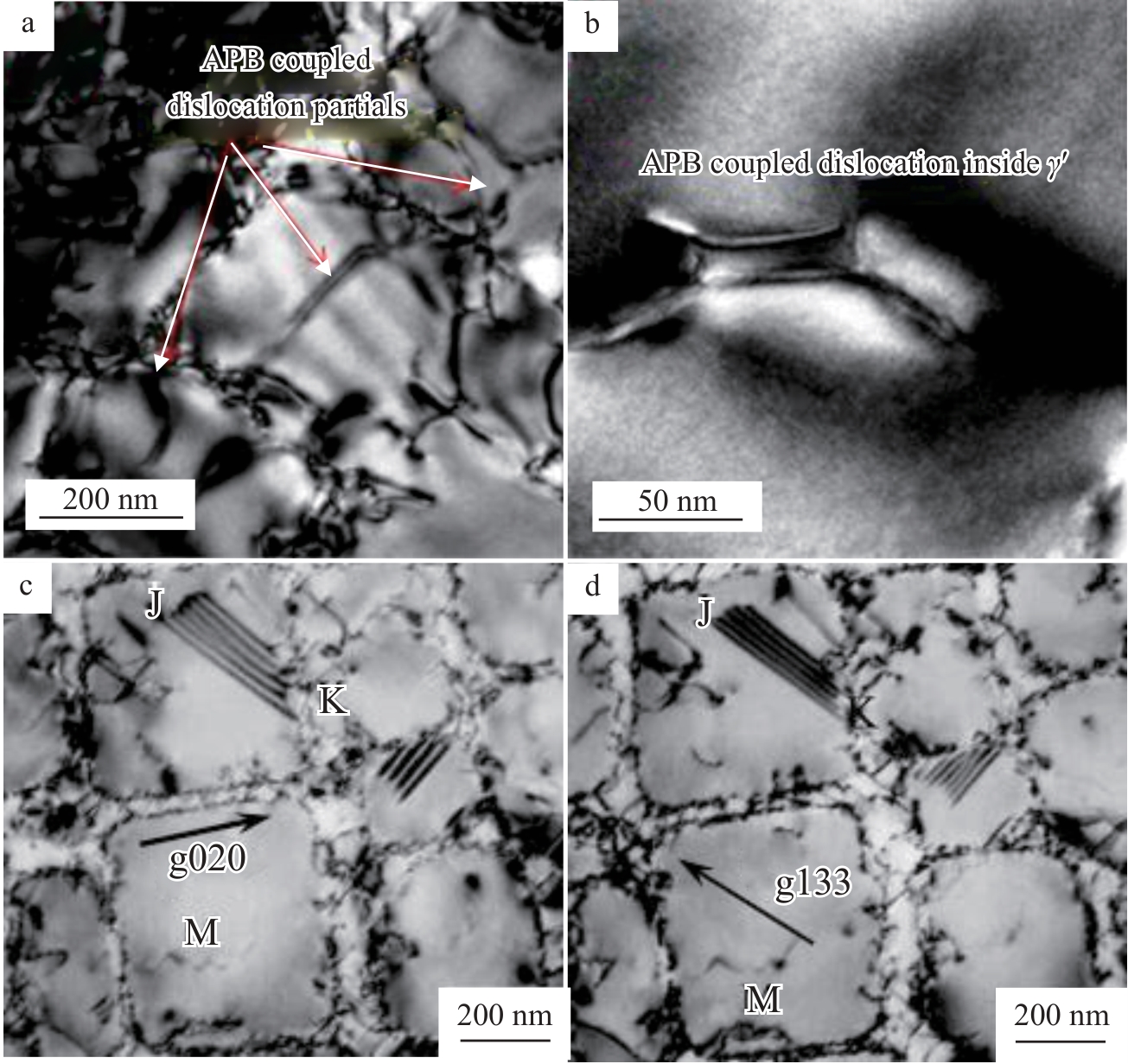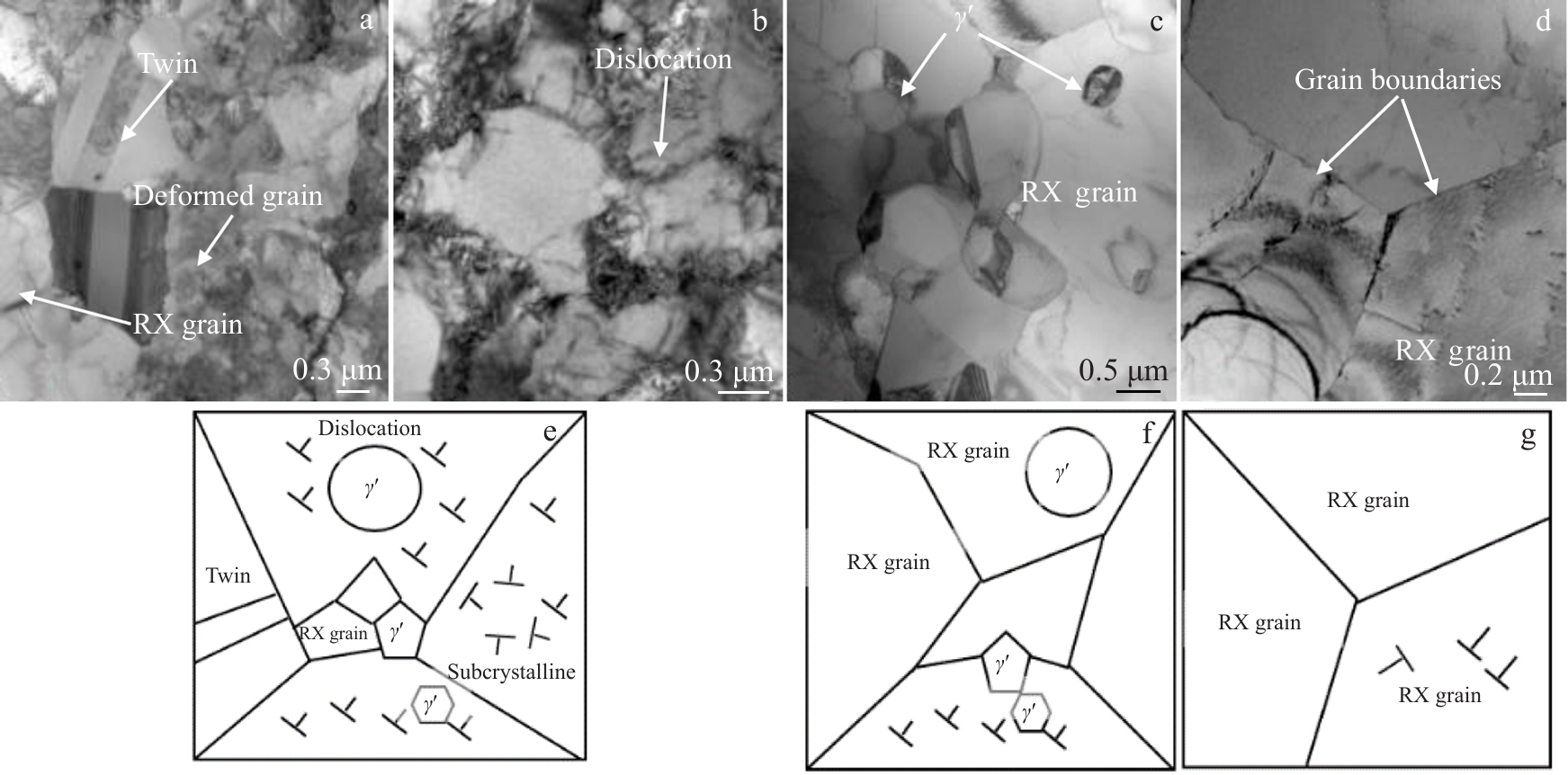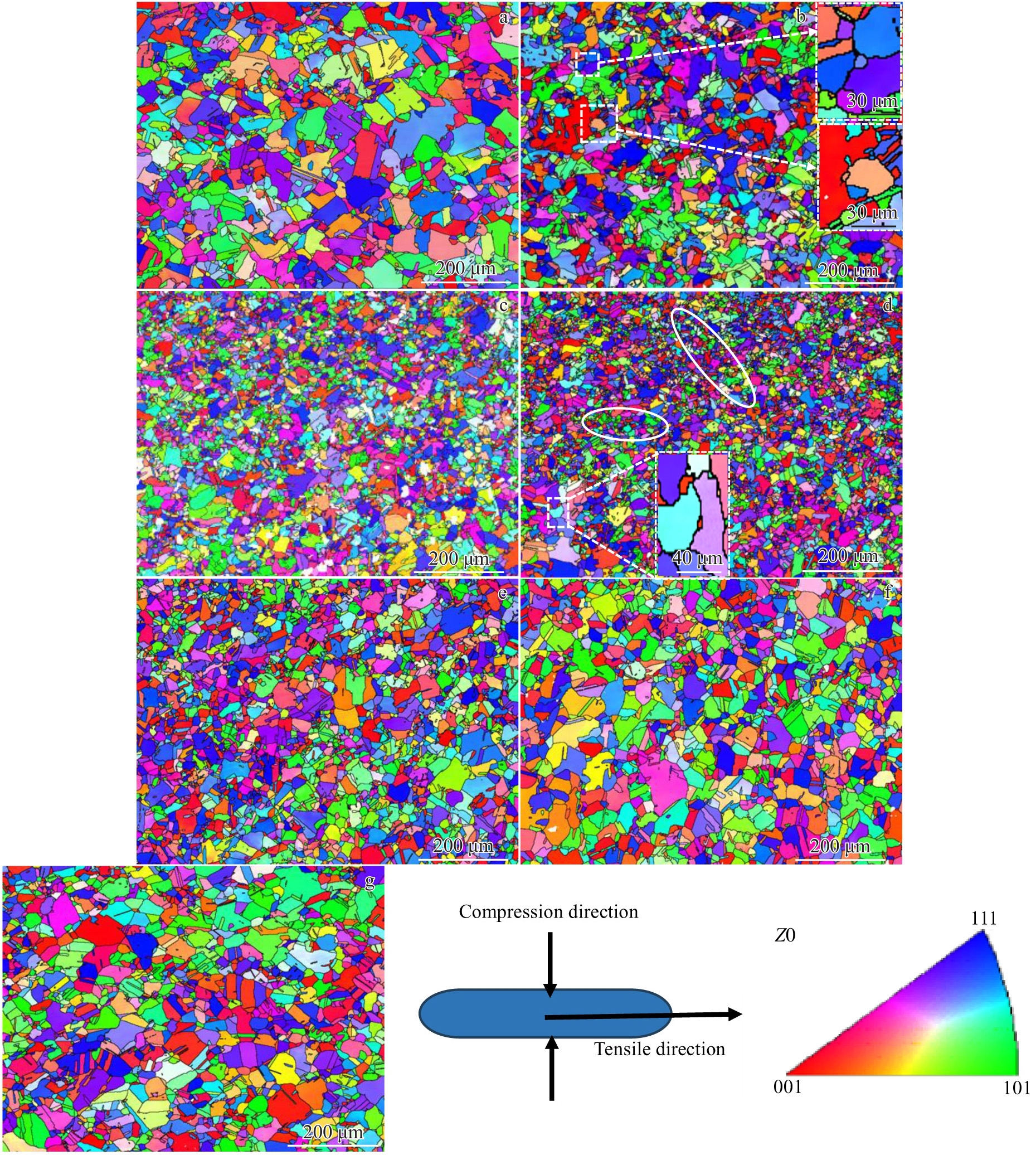 摘要:研究了热等静压(HIP,A1)、热等静压+1100 ℃热挤压(A2)、热等静压+1150 ℃热挤压(A3)3种不同热变形条件下的热压缩曲线和变形组织。结果表明:1100 ℃挤压的A2样品具有均匀的γ+γ′双相细晶粒组织,1050和1100 ℃条件下均表现出良好的热变形性能。在较大应变范围内,A2样品的真应力-真应变曲线保持了硬化-软化平衡状态,变形后平均晶粒尺寸5 μm。热等静压态A1样品和1150 ℃挤压A3样品在1050 ℃仍处于变形软化阶段,组织为原始粗大晶粒和细小再结晶晶粒的混合项链晶,样品的再结晶形核机制主要为应变诱发晶界弓弯形核。1150 ℃?0.001 s-1条件下,初始组织对热变形行为和变形后组织的影响相对较小,变形后组织为完全再结晶的晶粒。细晶组织有利于最大化合金的热变形潜力。通过合理地调控变形机制,可以获得细小均匀的变形组织。