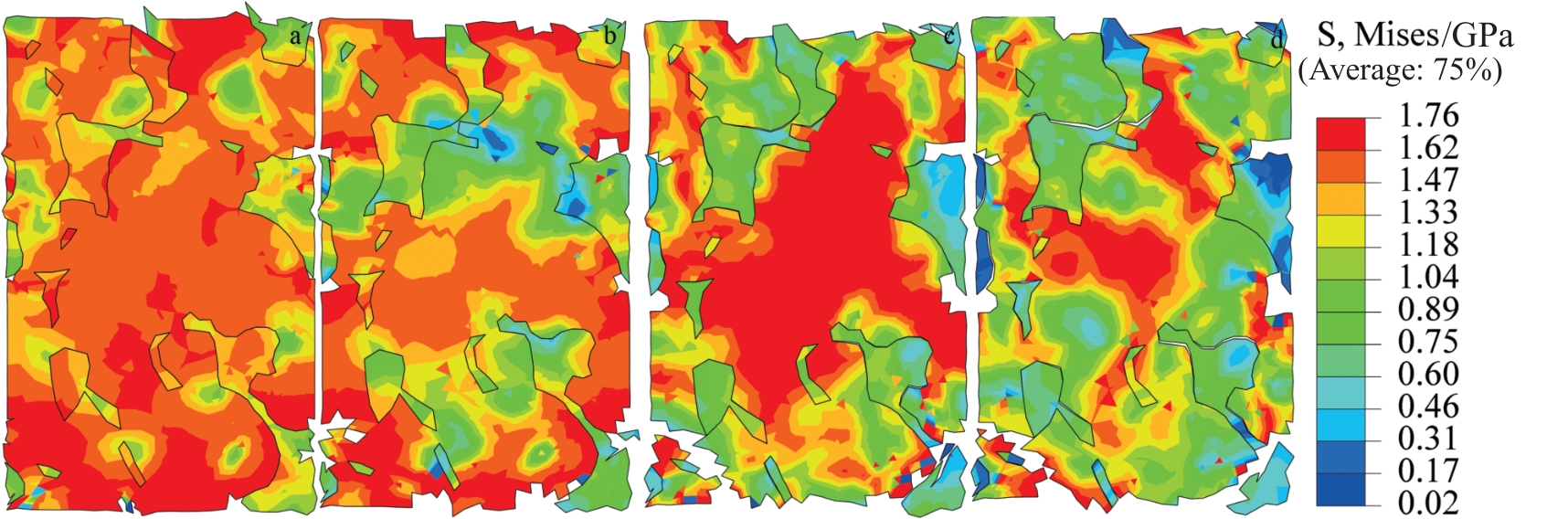 摘要:为研究W骨架/Zr基非晶合金复合材料的细观结构损伤,基于W骨架/Zr基非晶合金复合材料的扫描电子显微镜图像建立了复合材料的细观尺度有限元模型,并结合内聚力模型对复合材料的准静态压缩过程进行了数值模拟,研究了界面刚度、界面强度和断裂能等参数对复合材料力学性能的影响。通过与准静态压缩试验数据对比,确定了内聚力模型参数的取值。结果表明,W骨架/Zr基非晶合金复合材料在压缩过程中出现了3种破坏模式,分别是W颗粒的解理断裂、Zr基非晶合金内部的剪切带扩展断裂及两相间的界面开裂;内聚力模型参数对仿真曲线有很大影响,加大界面刚度会使仿真曲线弹性阶段的斜率升高,增加界面强度会使曲线的屈服点上升,提高断裂能会使曲线塑性阶段缩短。当界面刚度、界面强度、断裂能分别取10 000 GPa/μm3、500 MPa、0.055 J/m2时,仿真结果与试验结果吻合较好,仿真模型能够准确地描述W骨架/Zr基非晶合金复合材料的力学行为。