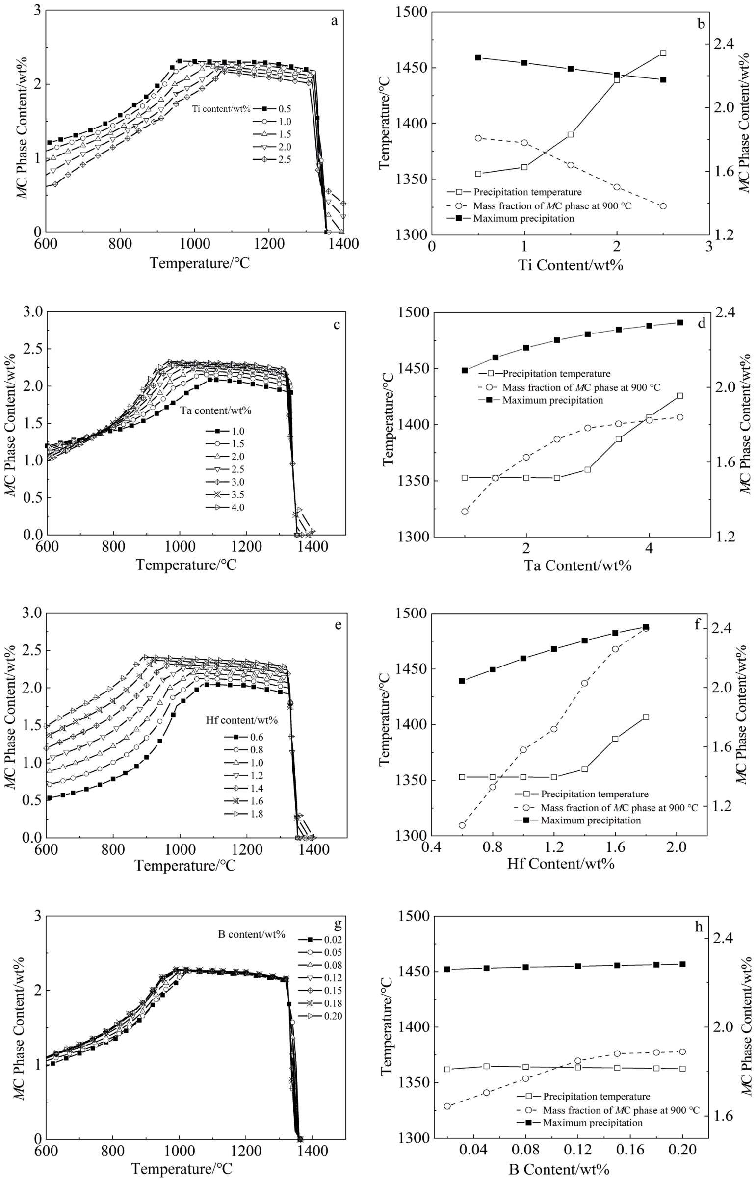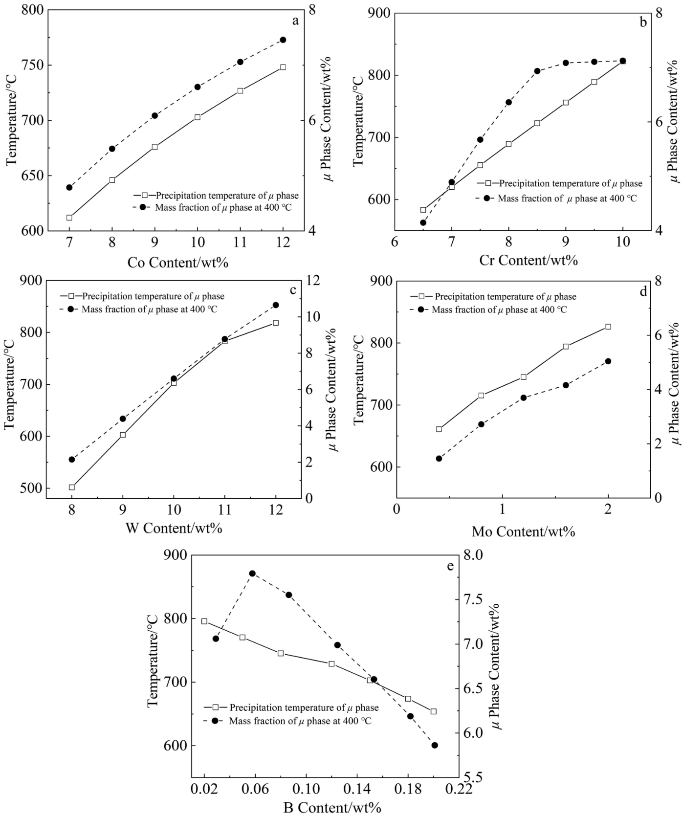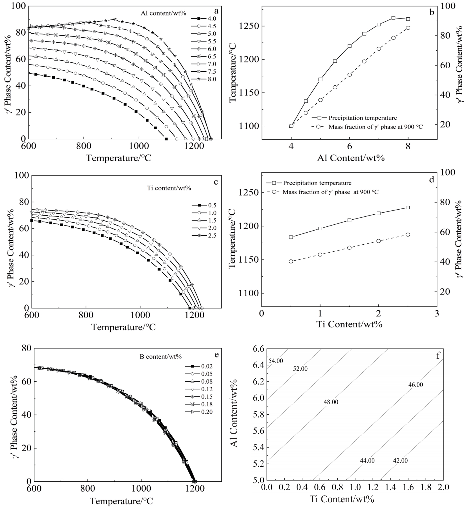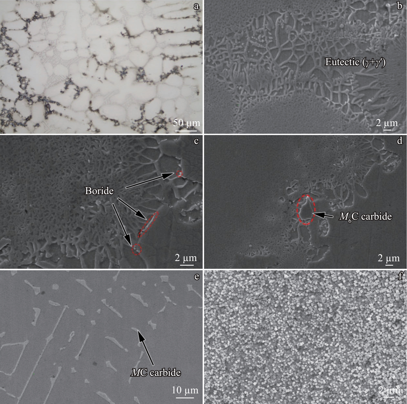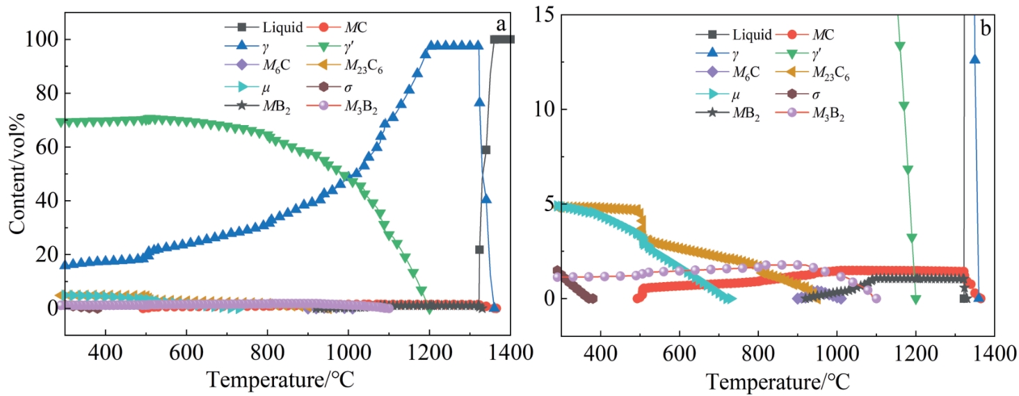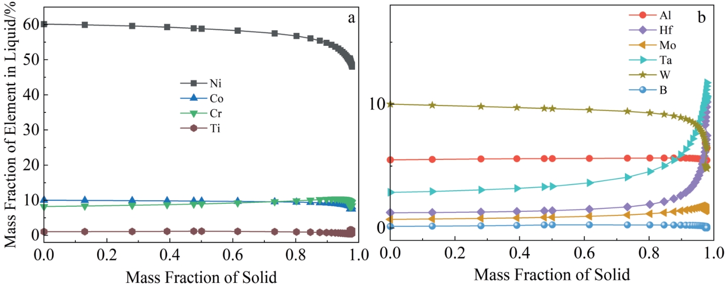 摘要:利用JMatPro热力学软件,研究了合金元素对新型高B镍基高温合金的物相析出行为的影响,并与实际铸造组织进行对比。结果表明,新型高B镍基高温合金的铸态组织为典型的铸态枝晶形貌,主要由γ、γ′、碳化物、硼化物和(γ+γ′)共晶组织(体积分数约15.5%)等组成,凝固过程中Hf和Ta元素的偏析较明显。热力学计算表明,对合金熔化温度影响较大的元素为Ti、Ta、Hf、Al、B元素。γ′相的开始析出温度及其在900 ℃析出量随Al含量增加而升高,而Ti元素的影响相对较小。此外,Ta和Hf合金元素将促进MC型碳化物析出,Cr元素对M23C6碳化物析出量的影响大于对M6C碳化物。硼化物的析出主要受Cr和W元素的影响,而Mo元素对M3B2硼化物的析出温度影响显著。随着Co、Cr、W和Mo元素含量增加,μ相析出量和析出温度均呈现增加的趋势。