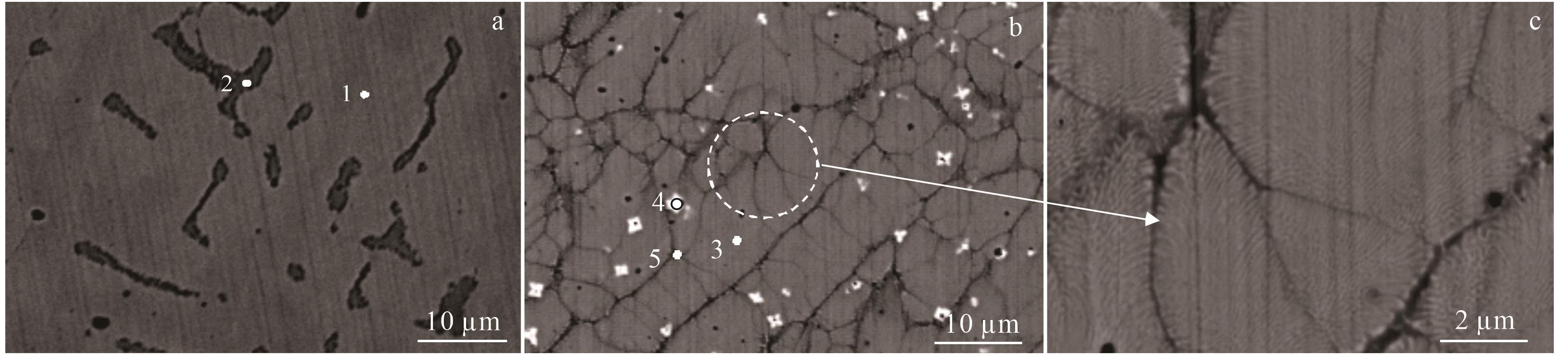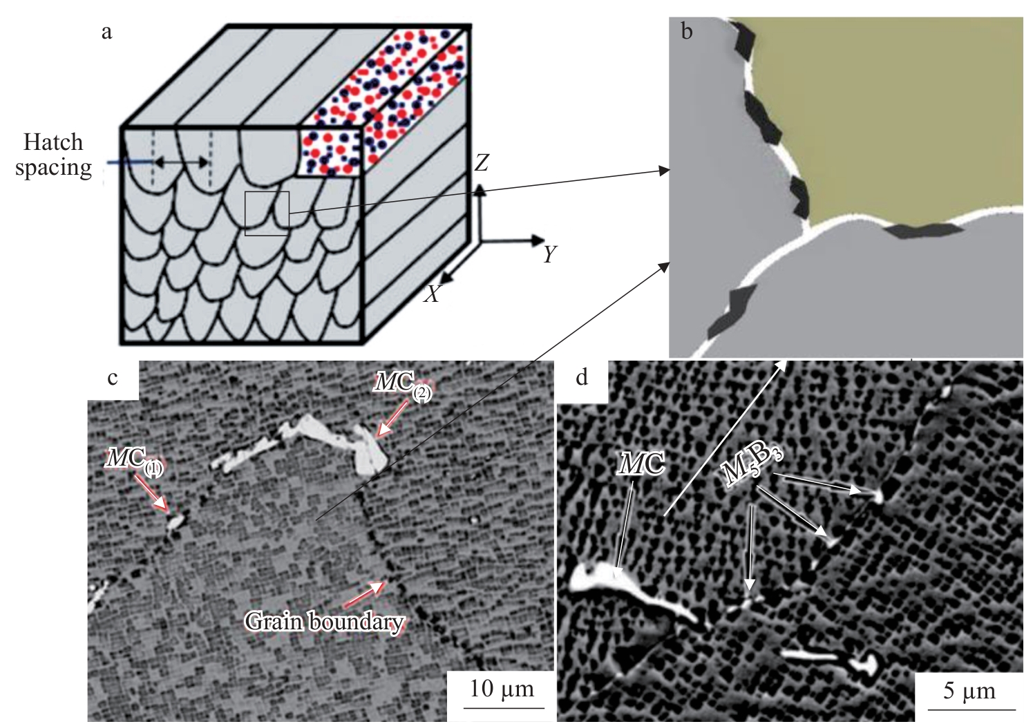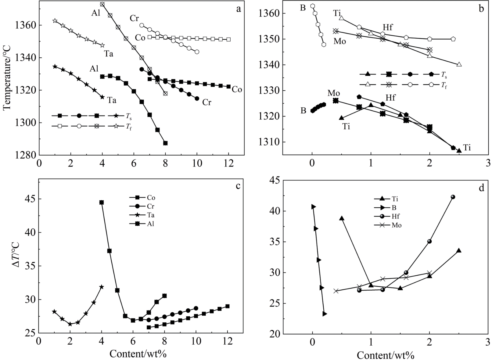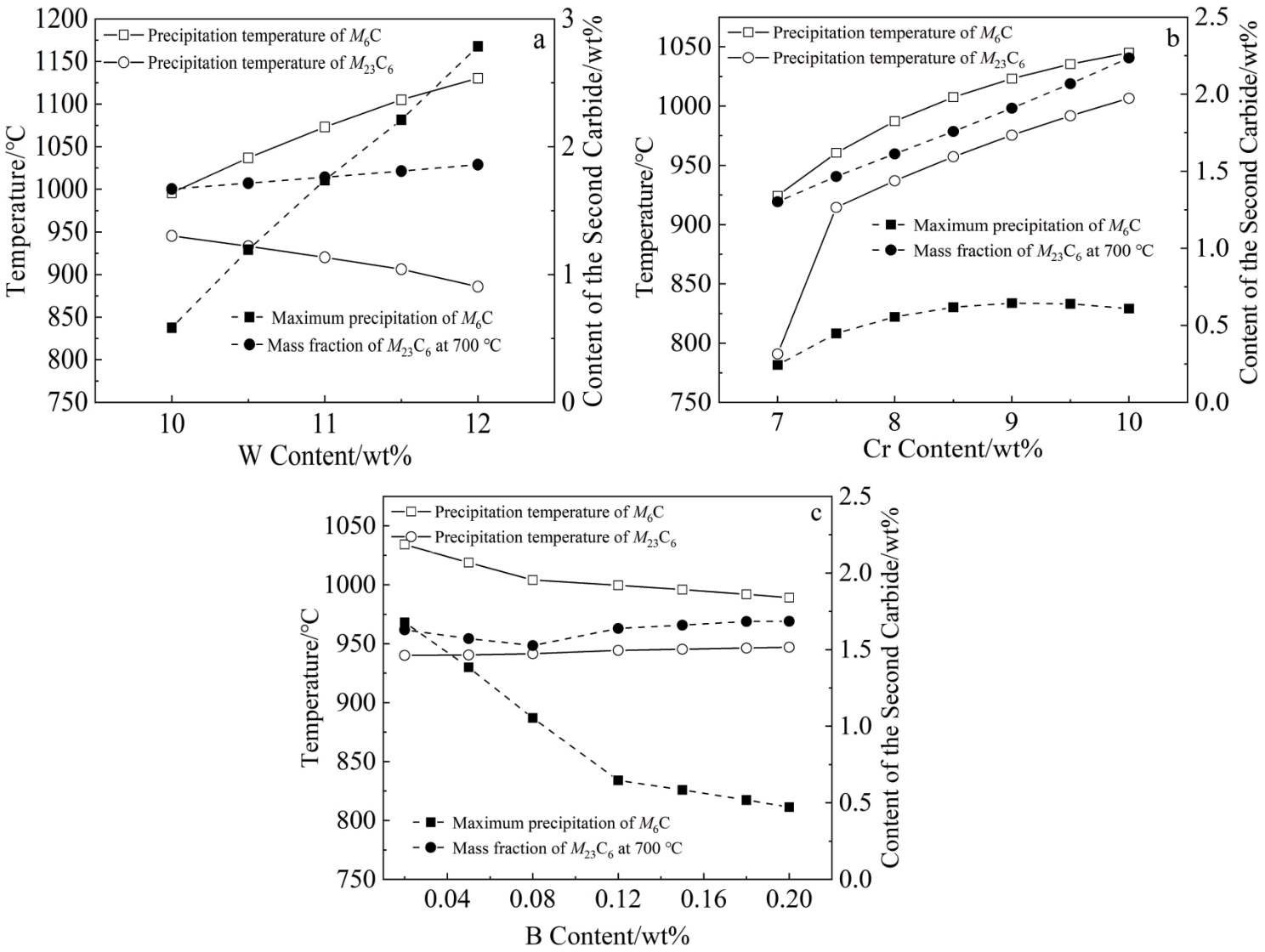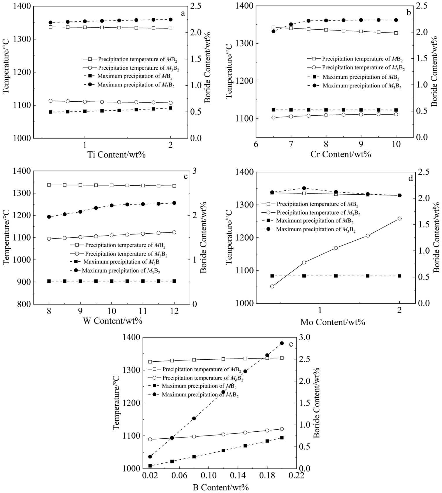 摘要:利用JMatPro热力学软件,研究了合金元素对新型高B镍基高温合金的物相析出行为的影响,并与实际铸造组织进行对比。结果表明,新型高B镍基高温合金的铸态组织为典型的铸态枝晶形貌,主要由γ、γ′、碳化物、硼化物和(γ+γ′)共晶组织(体积分数约15.5%)等组成,凝固过程中Hf和Ta元素的偏析较明显。热力学计算表明,对合金熔化温度影响较大的元素为Ti、Ta、Hf、Al、B元素。γ′相的开始析出温度及其在900 ℃析出量随Al含量增加而升高,而Ti元素的影响相对较小。此外,Ta和Hf合金元素将促进MC型碳化物析出,Cr元素对M23C6碳化物析出量的影响大于对M6C碳化物。硼化物的析出主要受Cr和W元素的影响,而Mo元素对M3B2硼化物的析出温度影响显著。随着Co、Cr、W和Mo元素含量增加,μ相析出量和析出温度均呈现增加的趋势。