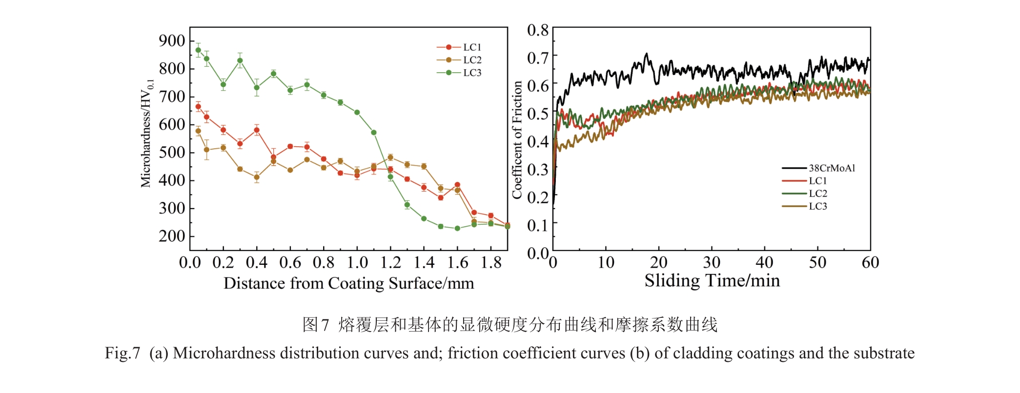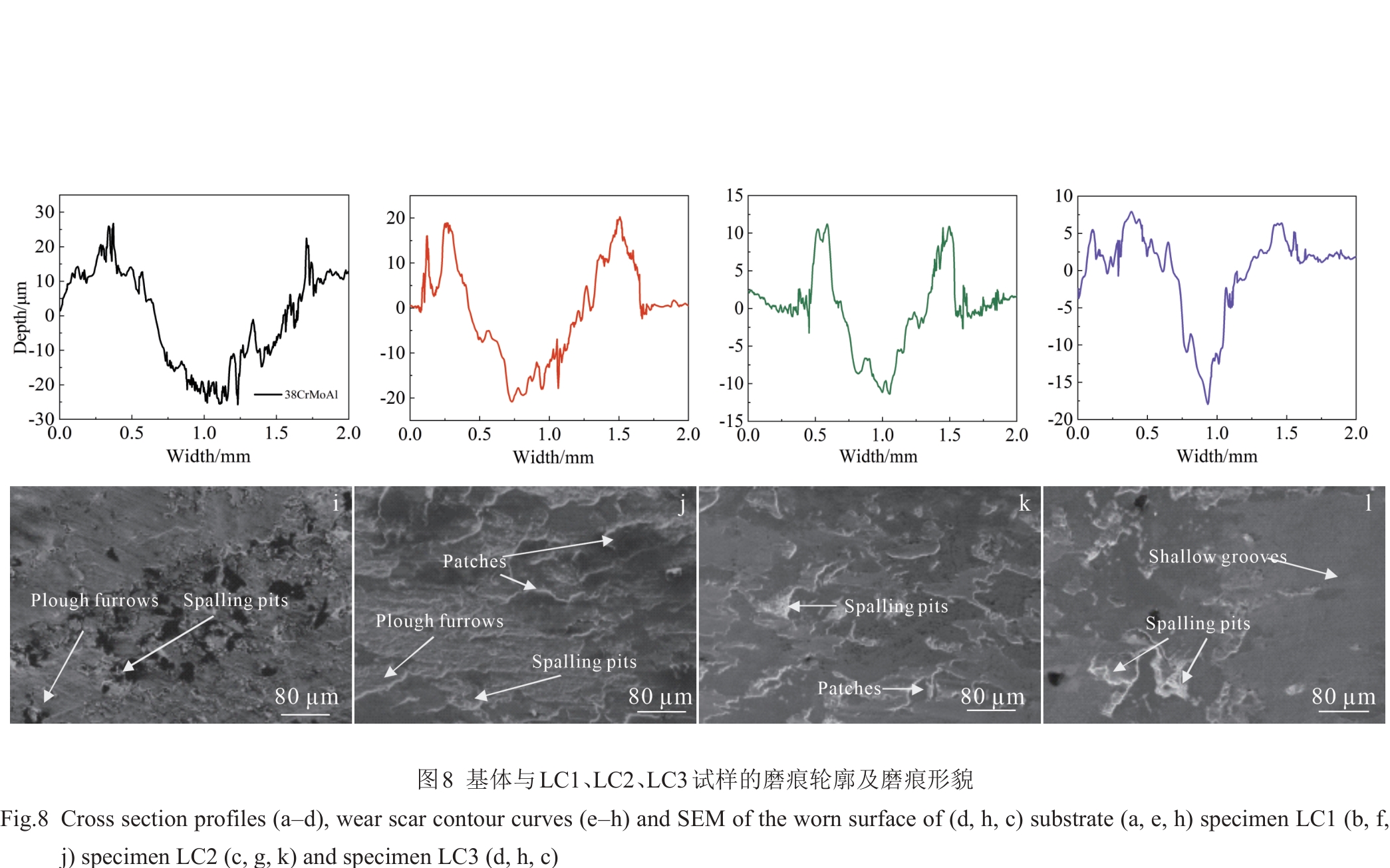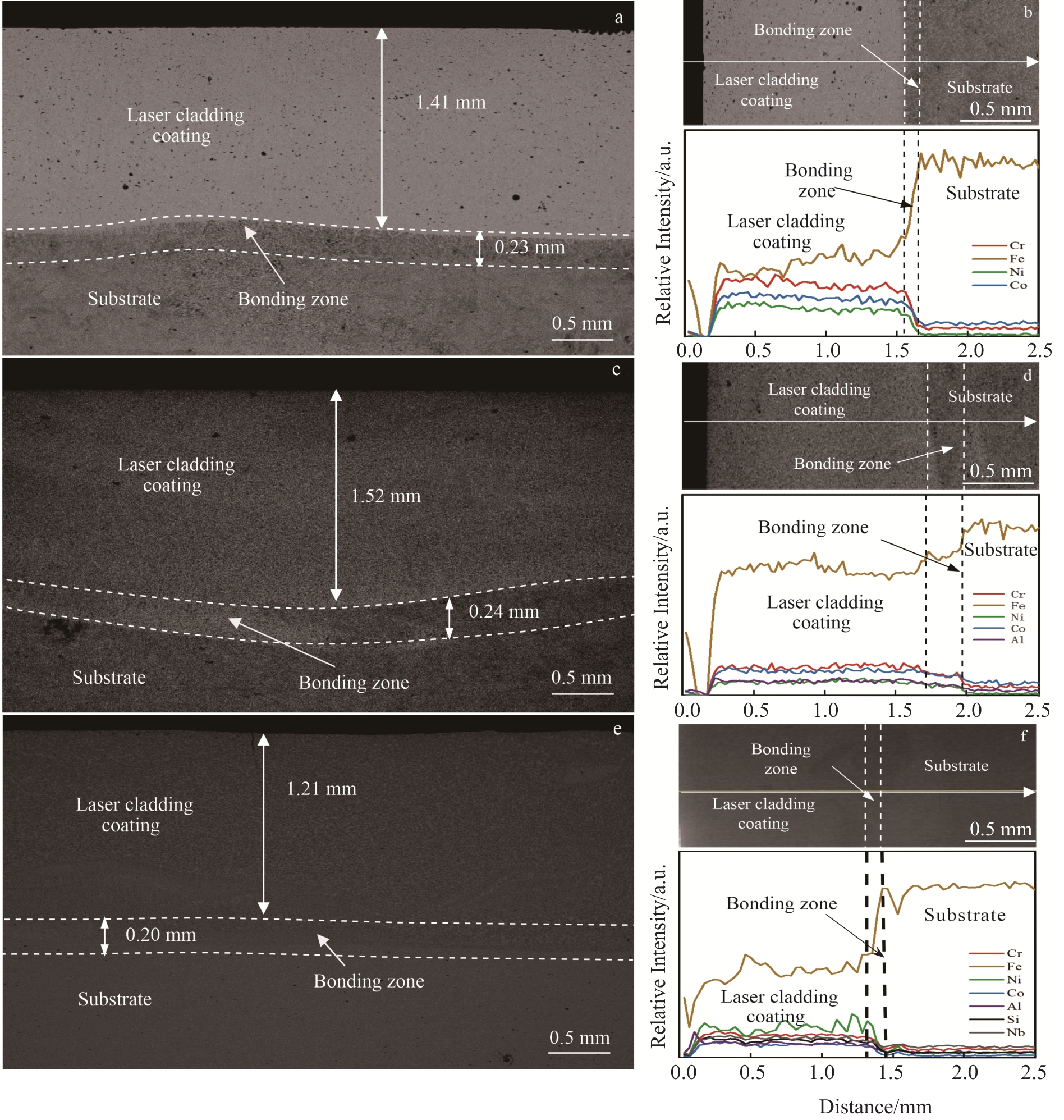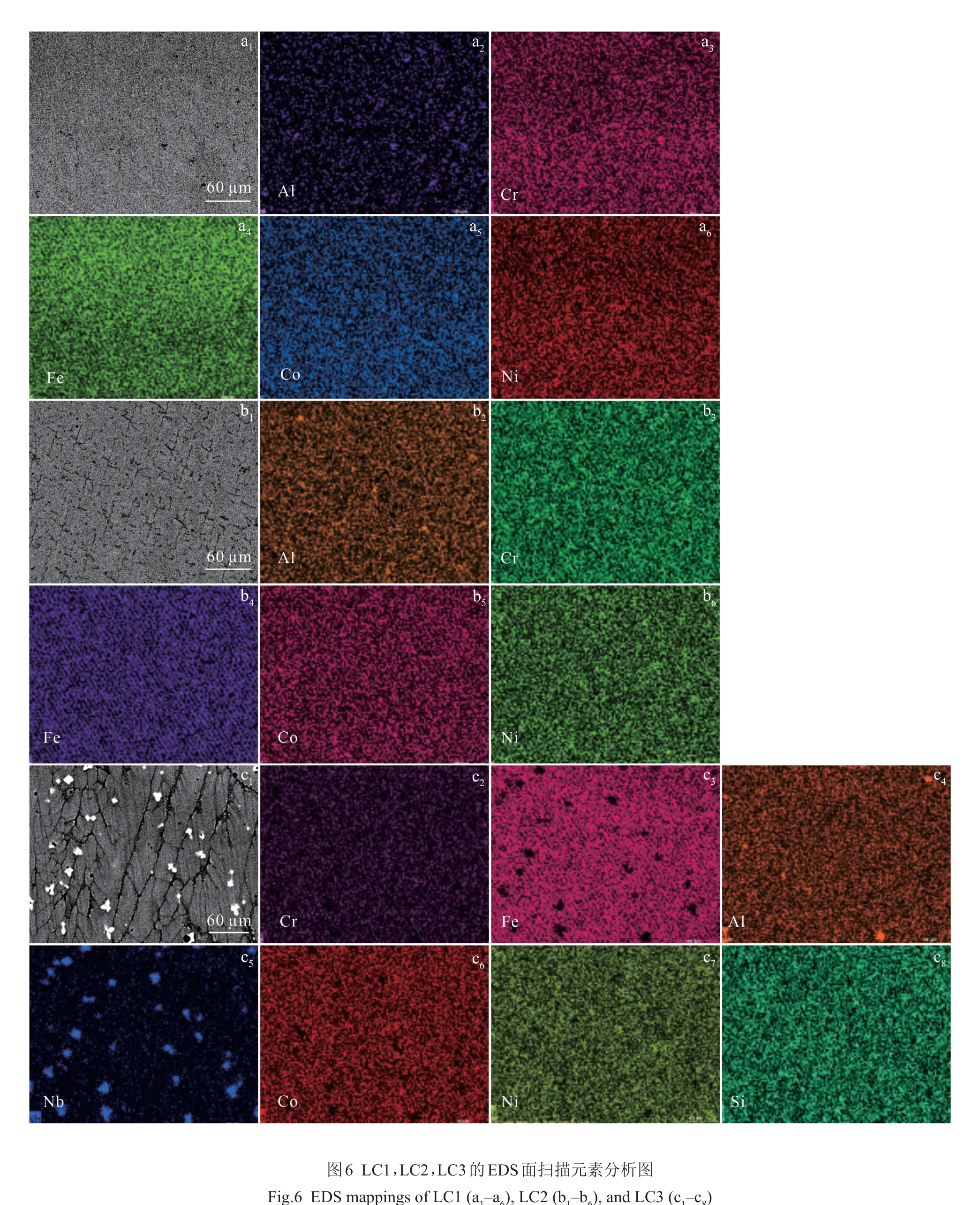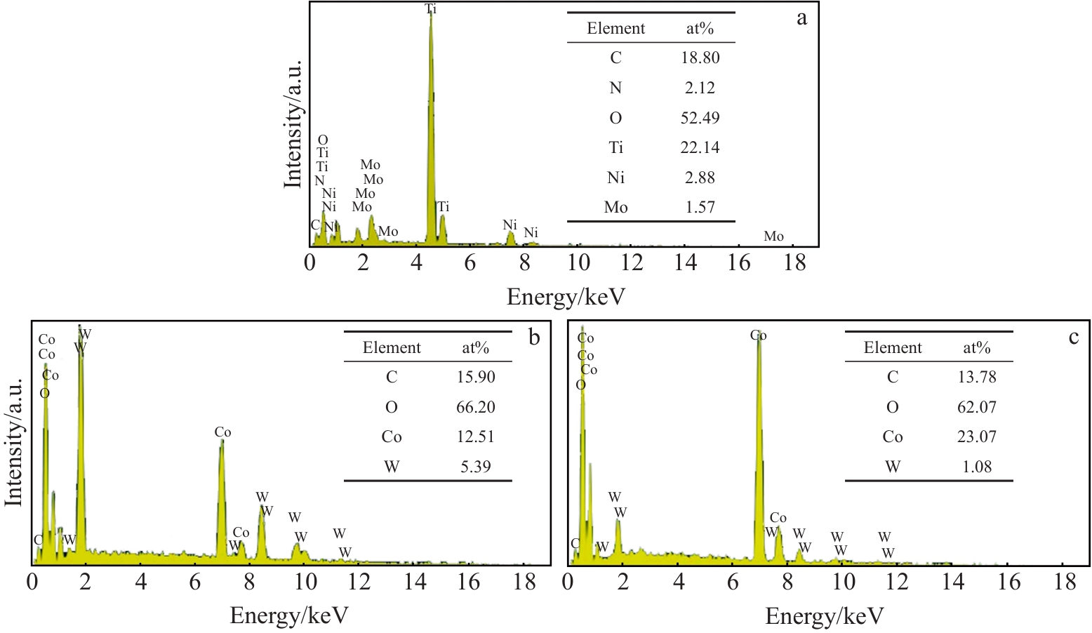 摘要:本工作采用激光熔覆技术在38CrMoAl表面制备中高熵合金涂层,研究了在CoCrNi系列合金中加入Al、Si、Fe、Nb等元素对合金涂层物相、组织和元素分布的影响,并对涂层的硬度、摩擦学和电化学性能进行分析表征。结果表明,CoCrNi合金是面心立方(fcc)晶体结构,Al、Fe的加入促使体心立方(bcc)相的形成;继续加入Nb、Si元素后七元合金涂层中形成了Laves/bcc共晶+富Nb的复合相,并且组织得到明显细化。CoCrNi系中高熵合金涂层综合性能均优于38CrMoAl基体。相较于CoCrNi和 AlCoCrFeNi合金涂层,AlSiCoCrFeNiNb涂层的硬度、耐磨性和耐蚀性能都有较大提升:表层硬度为713.3 HV0.1,是基体的3.24倍;磨损机制主要为轻微的磨粒磨损和黏着磨损,平均摩擦系数为0.52,磨损率为115.73×10-12 mm3/(N·m),比基体减少了64.4%;自腐蚀电位Ecorr=–0.3392 V,自腐蚀电流密度Icorr=0.472 μA·cm-2。