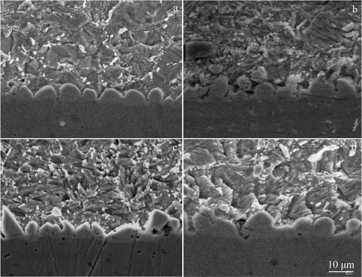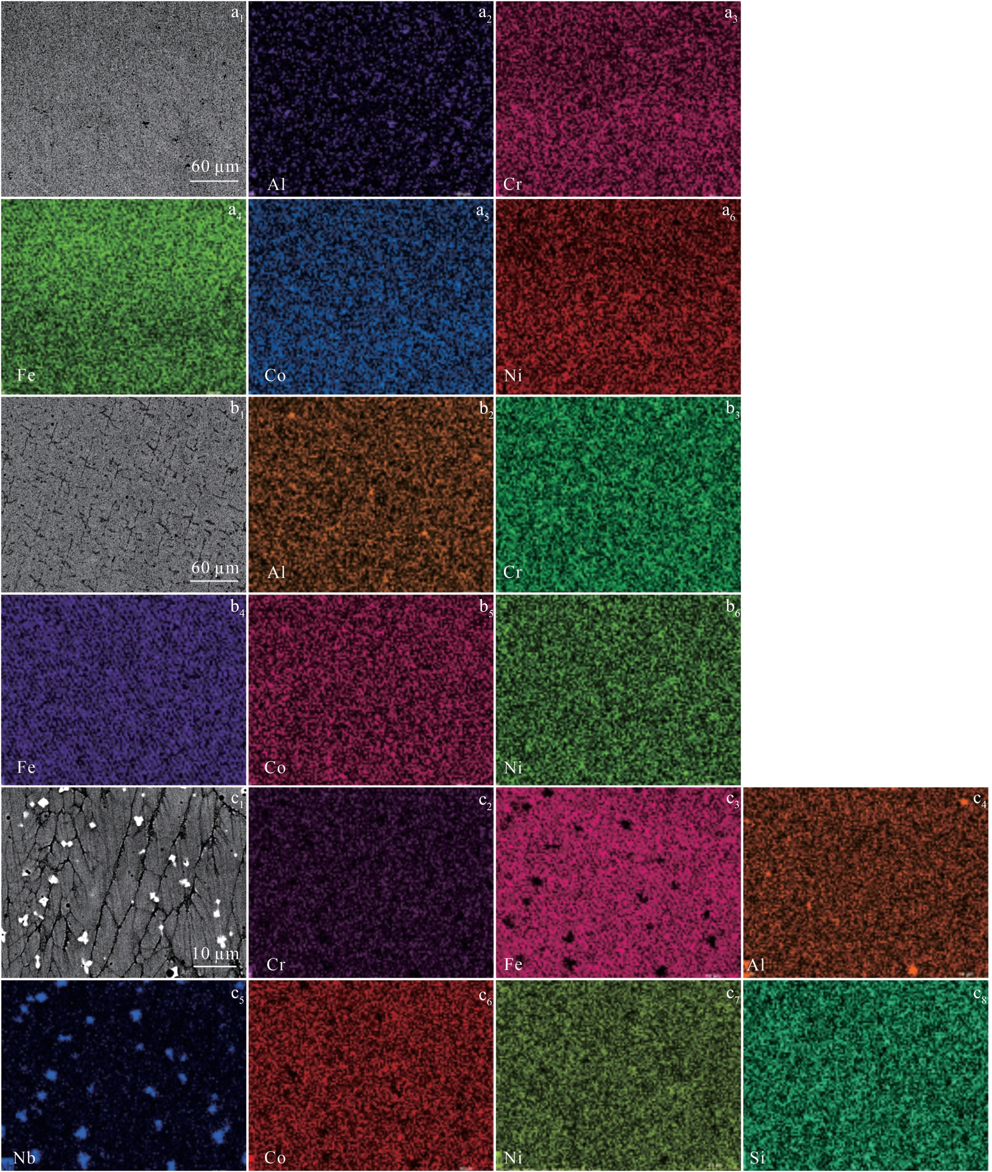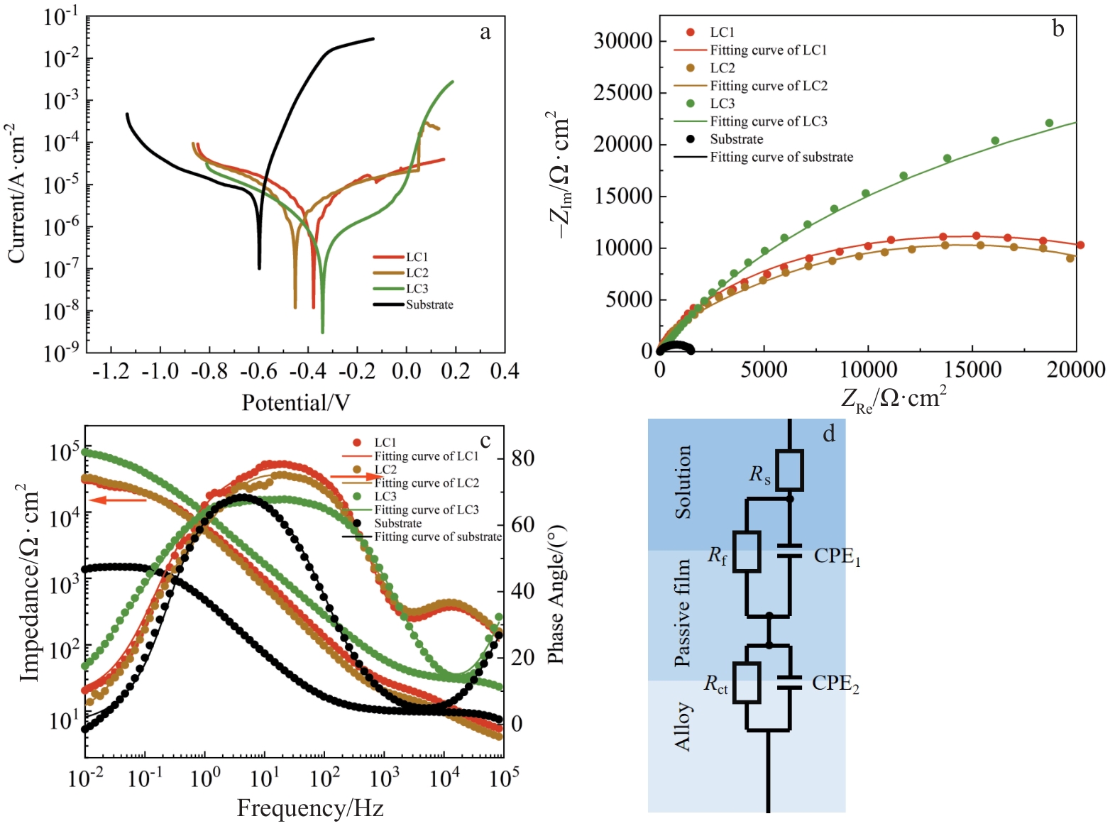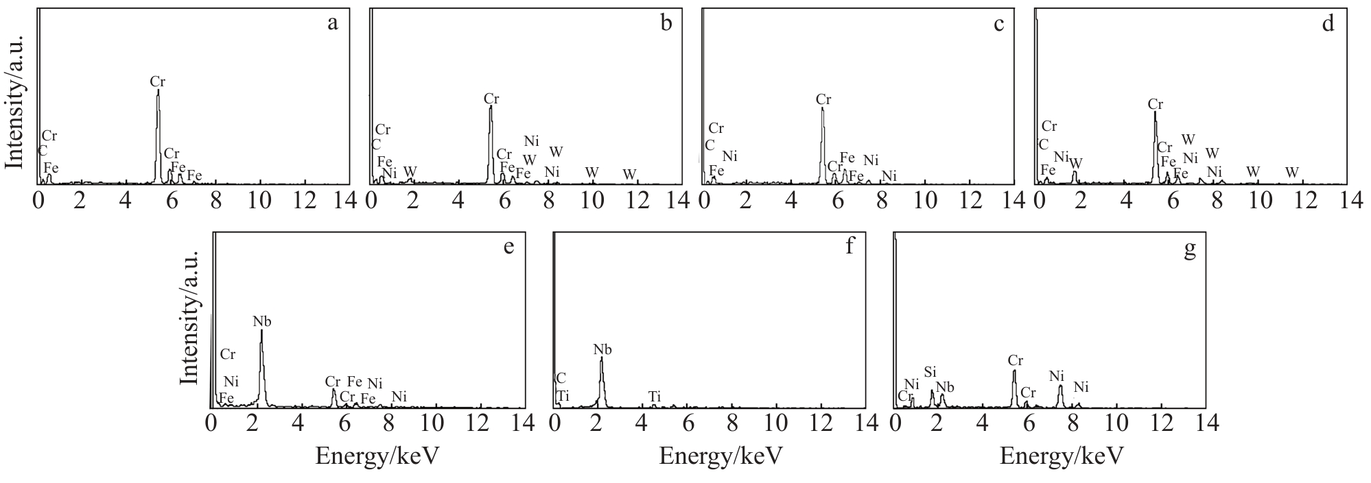 摘要:本工作采用激光熔覆技术在38CrMoAl表面制备中高熵合金涂层,研究了在CoCrNi系列合金中加入Al、Si、Fe、Nb等元素对合金涂层物相、组织和元素分布的影响,并对涂层的硬度、摩擦学和电化学性能进行分析表征。结果表明,CoCrNi合金是面心立方(fcc)晶体结构,Al、Fe的加入促使体心立方(bcc)相的形成;继续加入Nb、Si元素后七元合金涂层中形成了Laves/bcc共晶+富Nb的复合相,并且组织得到明显细化。CoCrNi系中高熵合金涂层综合性能均优于38CrMoAl基体。相较于CoCrNi和 AlCoCrFeNi合金涂层,AlSiCoCrFeNiNb涂层的硬度、耐磨性和耐蚀性能都有较大提升:表层硬度为713.3 HV0.1,是基体的3.24倍;磨损机制主要为轻微的磨粒磨损和黏着磨损,平均摩擦系数为0.52,磨损率为115.73×10-12 mm3/(N·m),比基体减少了64.4%;自腐蚀电位Ecorr=–0.3392 V,自腐蚀电流密度Icorr=0.472 μA·cm-2。