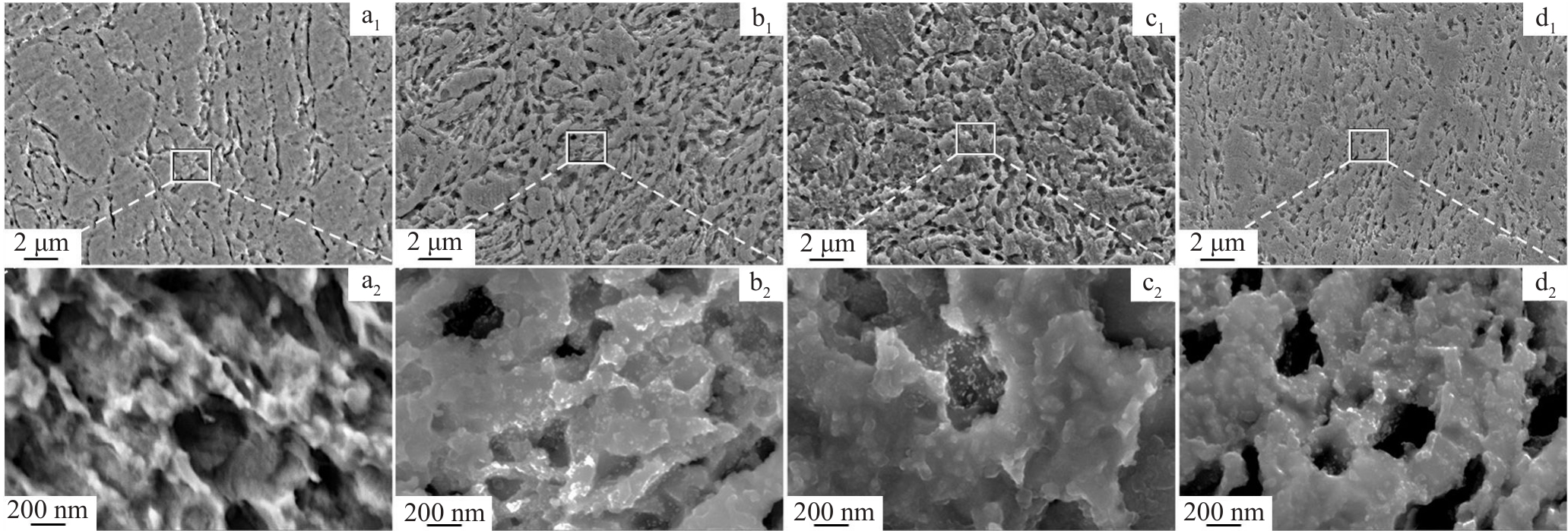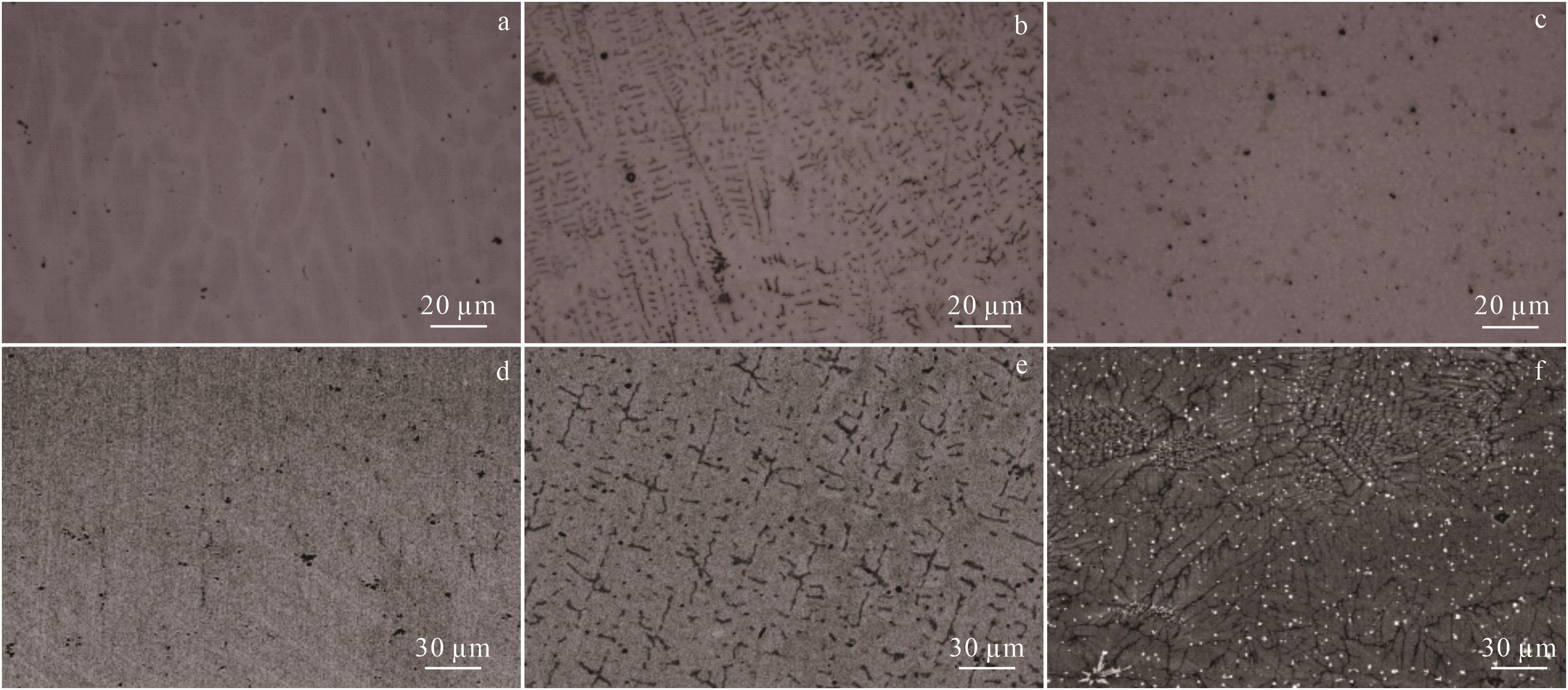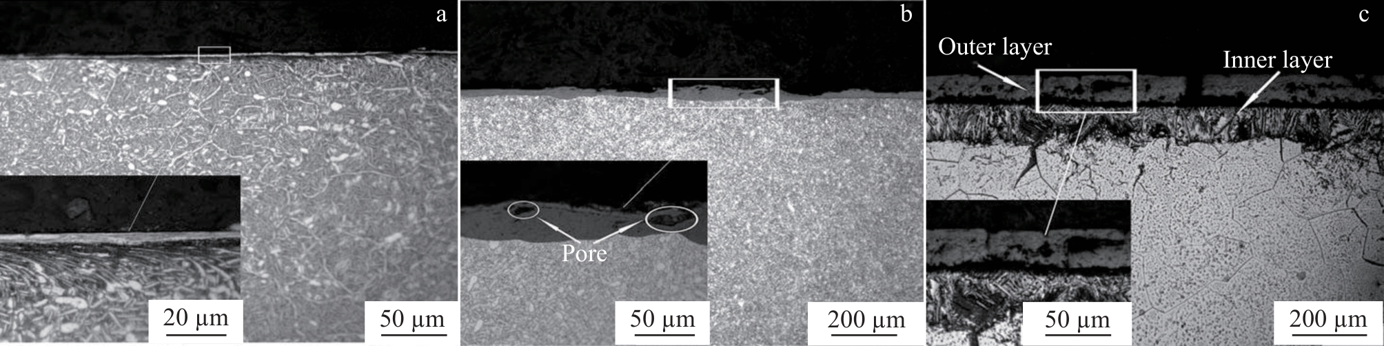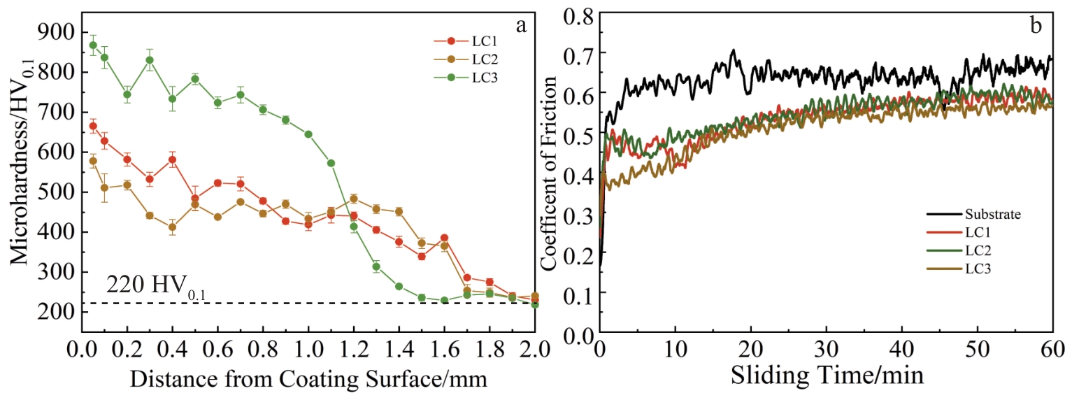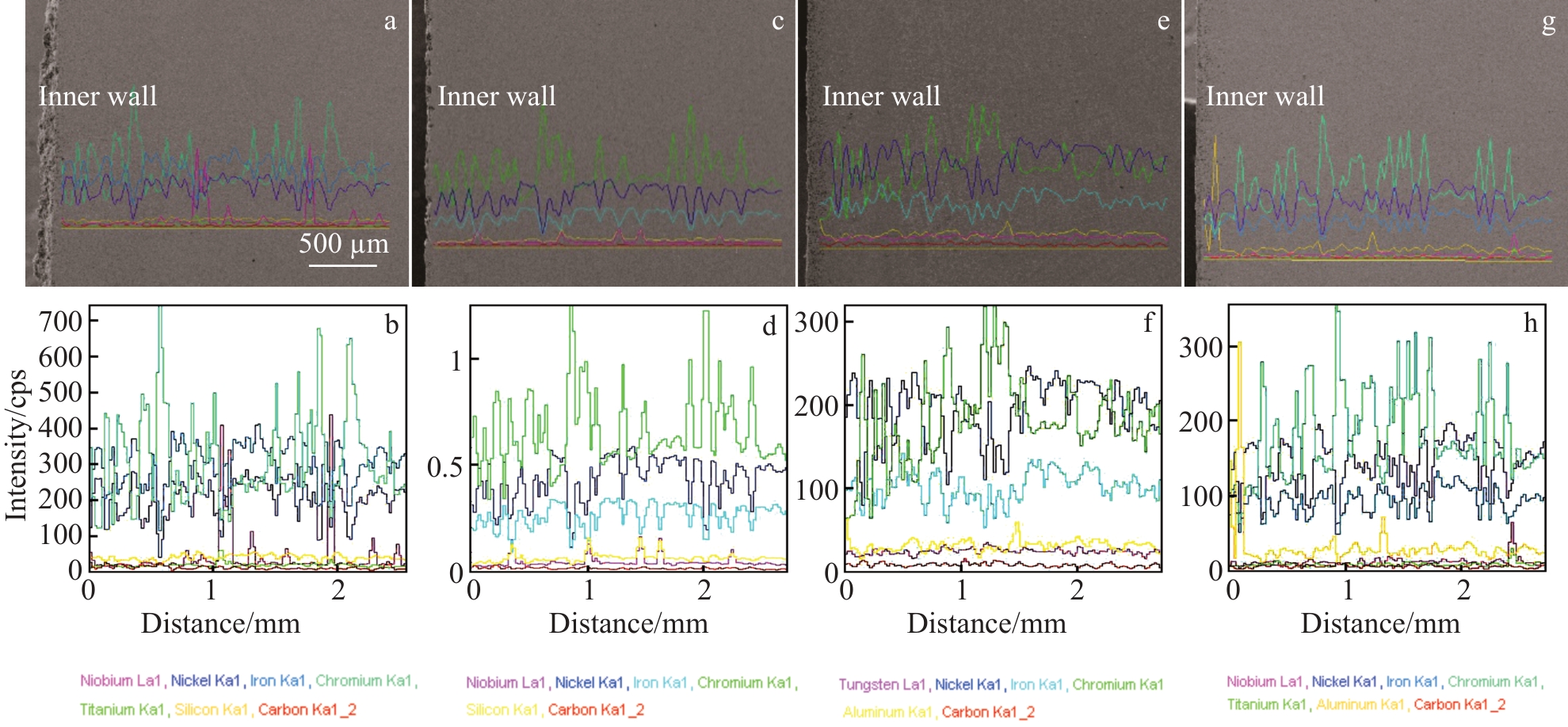 摘要:本工作采用激光熔覆技术在38CrMoAl表面制备中高熵合金涂层,研究了在CoCrNi系列合金中加入Al、Si、Fe、Nb等元素对合金涂层物相、组织和元素分布的影响,并对涂层的硬度、摩擦学和电化学性能进行分析表征。结果表明,CoCrNi合金是面心立方(fcc)晶体结构,Al、Fe的加入促使体心立方(bcc)相的形成;继续加入Nb、Si元素后七元合金涂层中形成了Laves/bcc共晶+富Nb的复合相,并且组织得到明显细化。CoCrNi系中高熵合金涂层综合性能均优于38CrMoAl基体。相较于CoCrNi和 AlCoCrFeNi合金涂层,AlSiCoCrFeNiNb涂层的硬度、耐磨性和耐蚀性能都有较大提升:表层硬度为713.3 HV0.1,是基体的3.24倍;磨损机制主要为轻微的磨粒磨损和黏着磨损,平均摩擦系数为0.52,磨损率为115.73×10-12 mm3/(N·m),比基体减少了64.4%;自腐蚀电位Ecorr=–0.3392 V,自腐蚀电流密度Icorr=0.472 μA·cm-2。