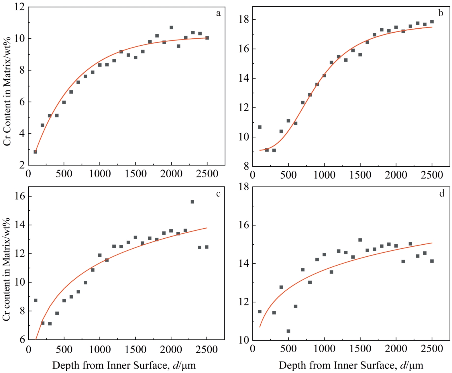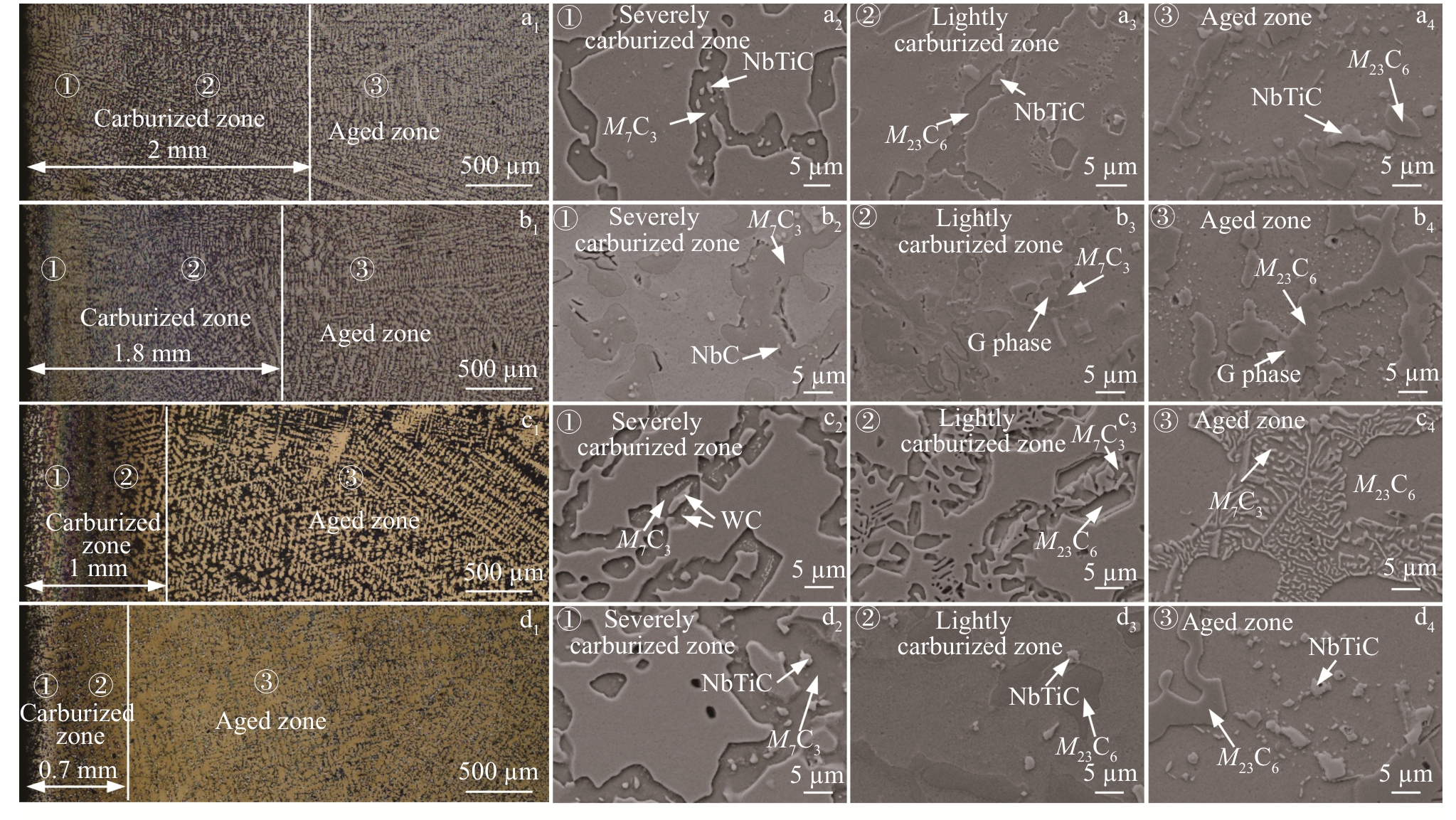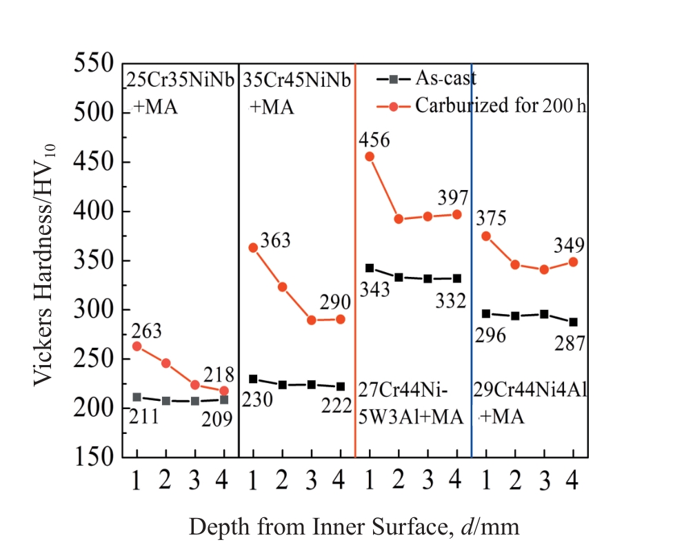 摘要:为了分析Fe-Cr-Ni合金裂解炉管的抗渗碳性能,采用粒径为1.5~3 mm的固体渗碳剂对2种传统合金炉管25Cr35NiNb+MA(微合金)、35Cr45NiNb+MA和2种具有延长清焦周期效果的加铝合金炉管27Cr44Ni5W3Al+MA和29Cr44Ni4Al+MA开展了1075 ℃条件下50~200 h的渗碳试验研究。采用直读光谱仪、扫描电镜、X射线衍射仪、维氏硬度计等对渗碳试验后炉管进行成分、组织、性能分析,研究了渗碳动力学及组织转变规律。结果表明:4种材料渗碳层厚度均随渗碳时间延长而增加,1075 ℃、200 h渗碳试验后炉管渗碳层厚度分别约为2.0、1.8、1.0和0.7 mm,平均渗碳速度分别约为0.01、0.009、0.005和0.0035 mm/h,2种加铝合金炉管的抗渗碳性能优于传统炉管。27Cr44Ni5W3Al+MA炉管时效区组织为奥氏体+块状M23C6+鱼骨状M7C3,碳化物中“M”含Cr、W等元素,渗碳区块状M23C6转变为块状M7C3和WC,鱼骨状M7C3粗化。29Cr44Ni4Al+MA炉管时效区组织为奥氏体+块状M23C6+块状NbTiC,碳化物中“M”主要为Cr元素,渗碳区块状M23C6转变为块状M7C3,NbTiC由块状转变为颗粒状。2种加铝合金炉管内壁形成了致密稳定Al2O3膜,相比于传统炉管内壁Cr2O3膜,能够更有效地阻挡碳原子进入基体,提高抗渗碳性能。