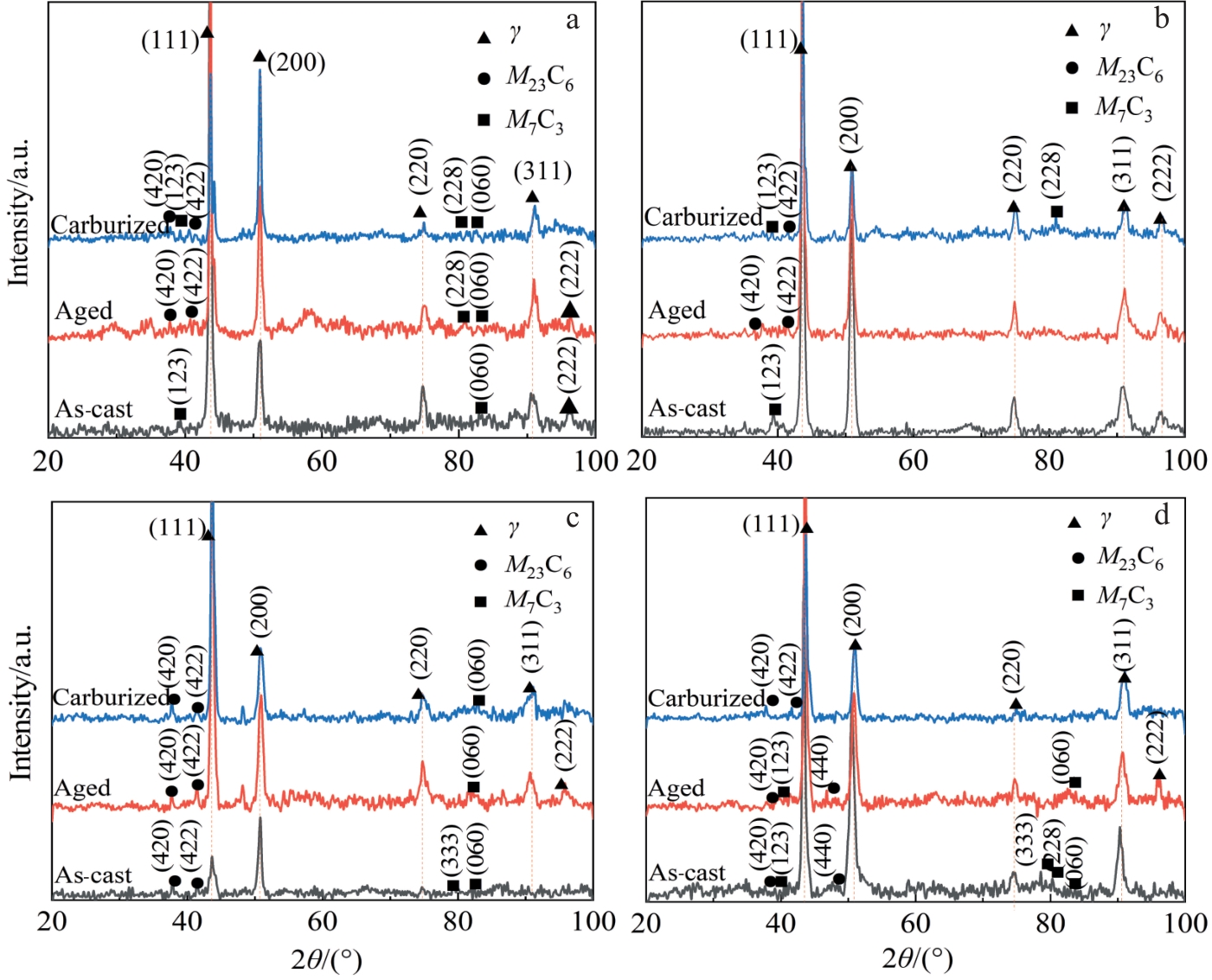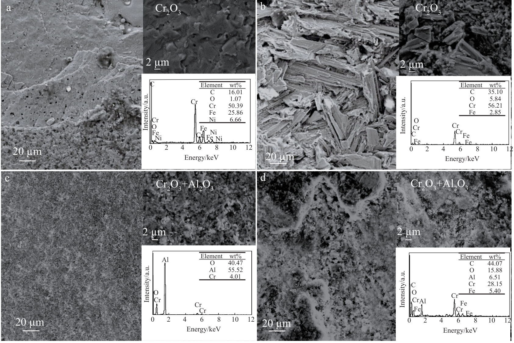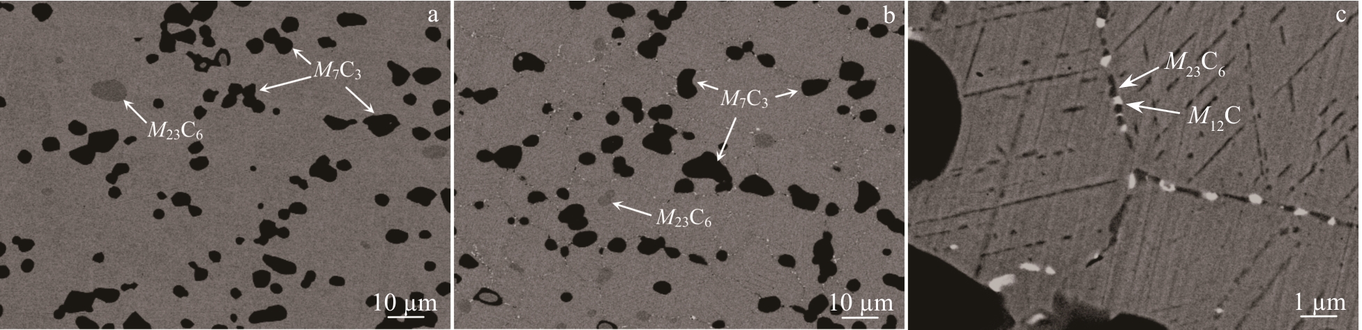 摘要:为了分析Fe-Cr-Ni合金裂解炉管的抗渗碳性能,采用粒径为1.5~3 mm的固体渗碳剂对2种传统合金炉管25Cr35NiNb+MA(微合金)、35Cr45NiNb+MA和2种具有延长清焦周期效果的加铝合金炉管27Cr44Ni5W3Al+MA和29Cr44Ni4Al+MA开展了1075 ℃条件下50~200 h的渗碳试验研究。采用直读光谱仪、扫描电镜、X射线衍射仪、维氏硬度计等对渗碳试验后炉管进行成分、组织、性能分析,研究了渗碳动力学及组织转变规律。结果表明:4种材料渗碳层厚度均随渗碳时间延长而增加,1075 ℃、200 h渗碳试验后炉管渗碳层厚度分别约为2.0、1.8、1.0和0.7 mm,平均渗碳速度分别约为0.01、0.009、0.005和0.0035 mm/h,2种加铝合金炉管的抗渗碳性能优于传统炉管。27Cr44Ni5W3Al+MA炉管时效区组织为奥氏体+块状M23C6+鱼骨状M7C3,碳化物中“M”含Cr、W等元素,渗碳区块状M23C6转变为块状M7C3和WC,鱼骨状M7C3粗化。29Cr44Ni4Al+MA炉管时效区组织为奥氏体+块状M23C6+块状NbTiC,碳化物中“M”主要为Cr元素,渗碳区块状M23C6转变为块状M7C3,NbTiC由块状转变为颗粒状。2种加铝合金炉管内壁形成了致密稳定Al2O3膜,相比于传统炉管内壁Cr2O3膜,能够更有效地阻挡碳原子进入基体,提高抗渗碳性能。