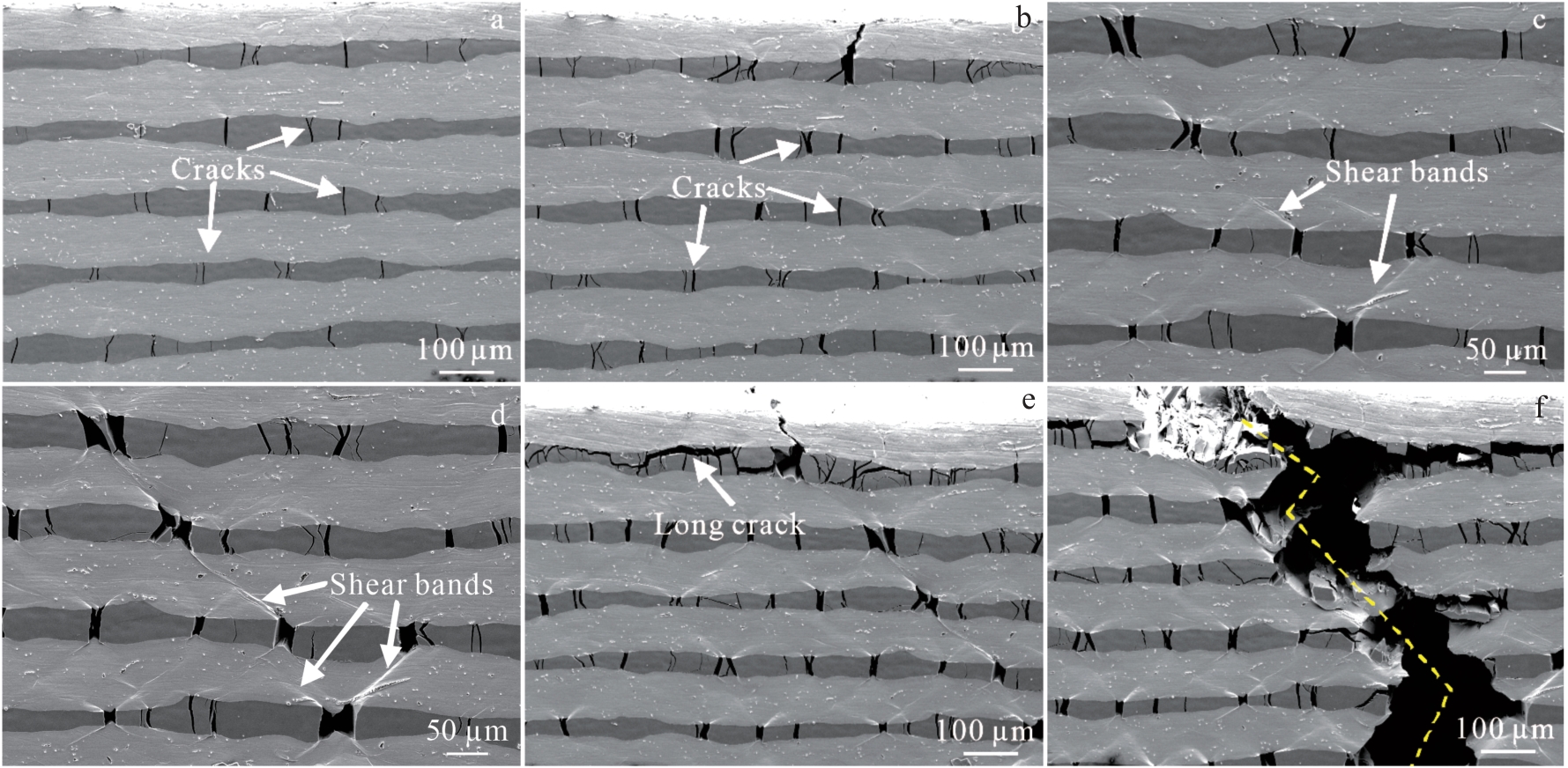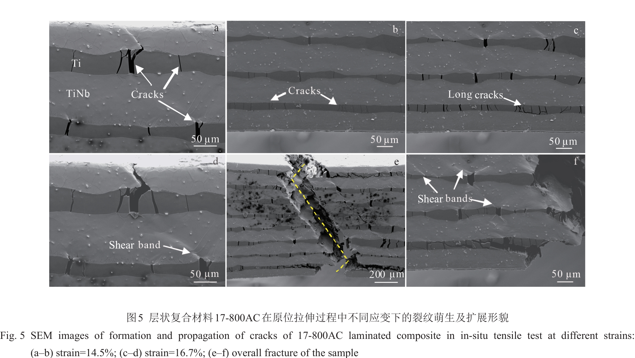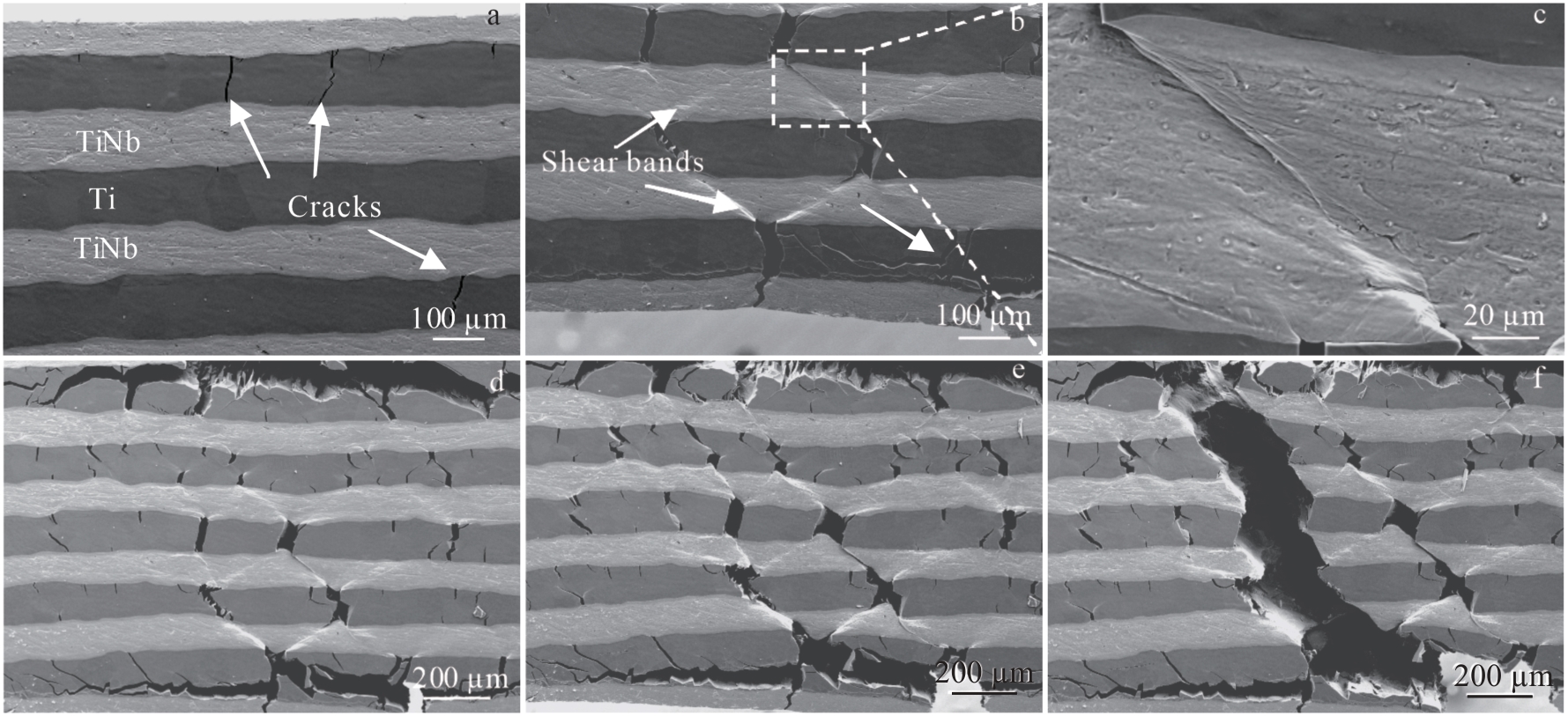 摘要:通过放电等离子烧结与热轧相结合的工艺制备了具有扩散层的层状Ti/TiNb复合材料,采用基于SEM的原位拉伸试验分析了不同状态复合材料的裂纹萌生与扩展行为,研究了Ti组元的厚度以及扩散层的组织状态对复合材料断裂行为的影响。结果表明,通过减小Ti组元的厚度,能够有效控制其内形成的贯穿裂纹的长度,进而延缓相邻TiNb层内剪切带的扩展;扩散层的组织状态对于复合材料的断裂行为有着显著影响,相比于具有“硬”扩散层的复合材料,具有“软”扩散层的复合材料在拉伸断裂前形成了更多的裂纹和剪切带,同时整体断裂后呈现出更加曲折的裂纹扩展路径。
