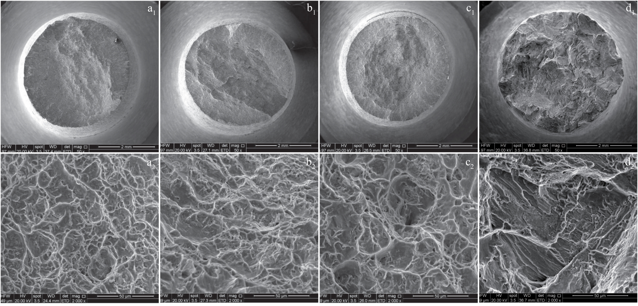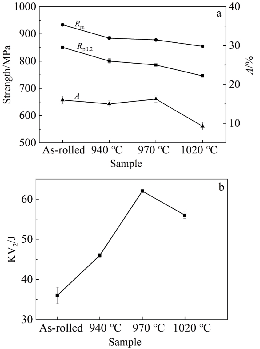 摘要:采用锻坯斜轧穿孔+热轧工艺获得Φ450 mm×20 mm大口径Ti6321合金无缝管材,研究了不同退火温度对Ti6321合金管材组织演变和力学性能的影响。结果表明:轧制态管材组织主要是由α相和转变β相构成,940 ℃退火后得到等轴组织,970 ℃退火后得到双态组织,1020 ℃退火后得到魏氏组织;随着退火温度的升高,管材的室温屈服强度和抗拉强度呈逐渐降低的趋势,管材的塑性在相变点以下变化不大,在相变点以上急剧降低;而冲击韧性呈先升高后降低趋势。综合分析认为,所制备的大口径Ti6321合金无缝管材适宜的退火温度为970 ℃左右,此时管材具备最佳冲击性能,冲击功为62 J。此外,管材经970 ℃退火后屈服强度、抗拉强度和伸长率分别为786 MPa、878 MPa和16.25%。