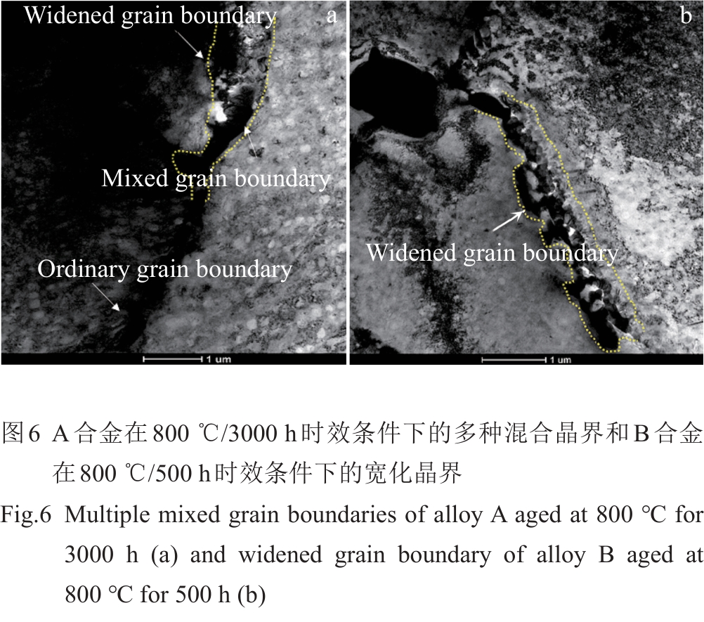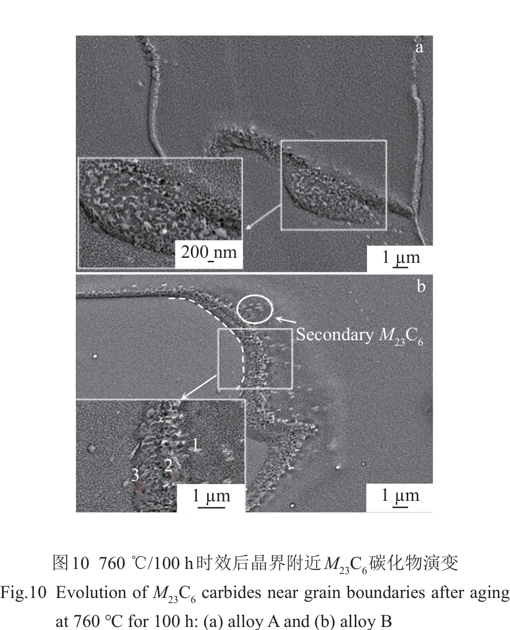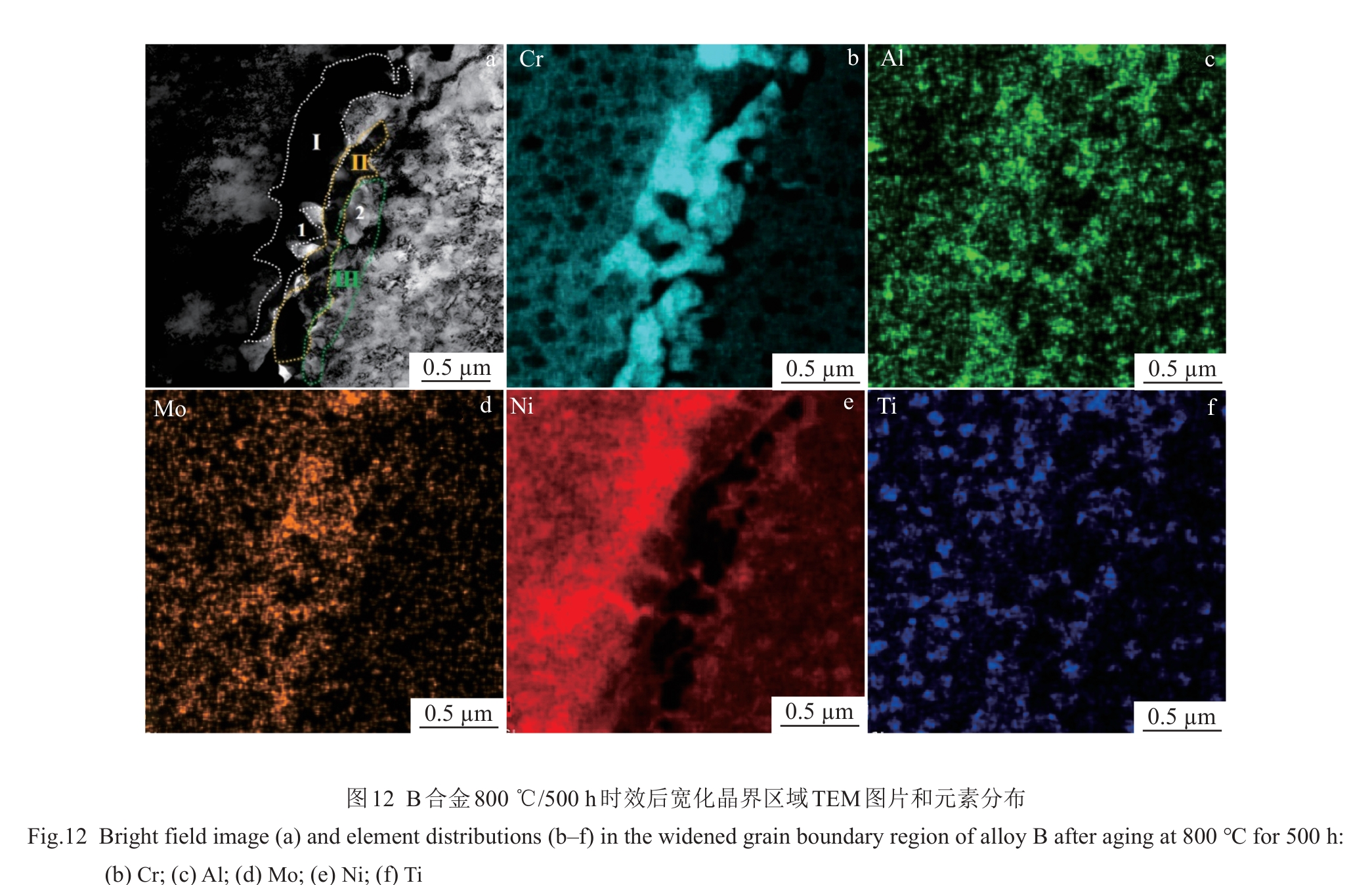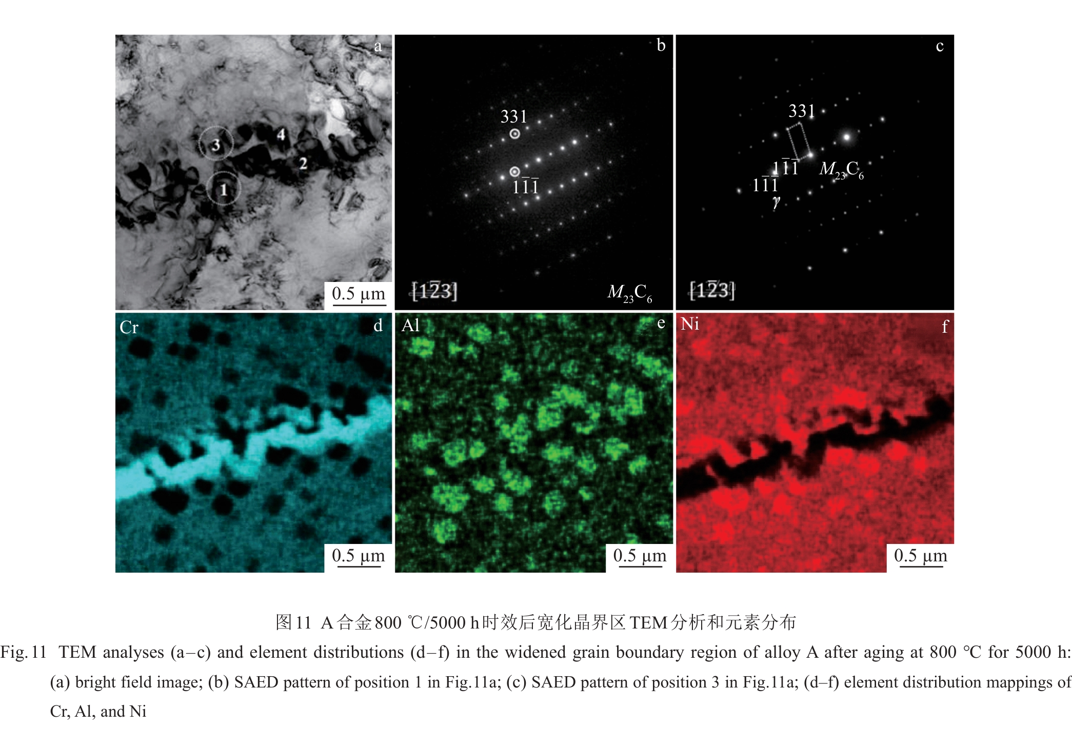 摘要:本研究以2种高参数先进超超临界电站过热器及再热器管材备选材料(合金A、合金B)为研究对象,系统分析了2种镍基高温合金在长期时效过程中的局部晶界宽化现象、晶界宽化动力学及晶界宽化机理。结果表明,2种合金高温长时时效过程宽化晶界区域内主要析出相为M23C6碳化物和晶界γ′相;2种合金宽化晶界随时效时间的演变遵循JMAK方程。长时时效过程2种合金晶界宽化分为3个阶段:阶段一,晶界附近M23C6碳化物回溶,导致晶界M23C6碳化物快速粗化,促使晶界发生迁移;阶段二,在晶界迁移后会析出新的M23C6碳化物,使得晶界区域M23C6碳化物呈多层排列,晶界宽度增加;阶段三,当碳化物粗化速率减慢,在M23C6/γ界面处会析出γ′相,晶界短路扩散,使得γ′相长大,晶界宽度进一步增加。
