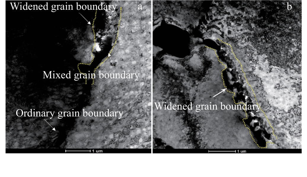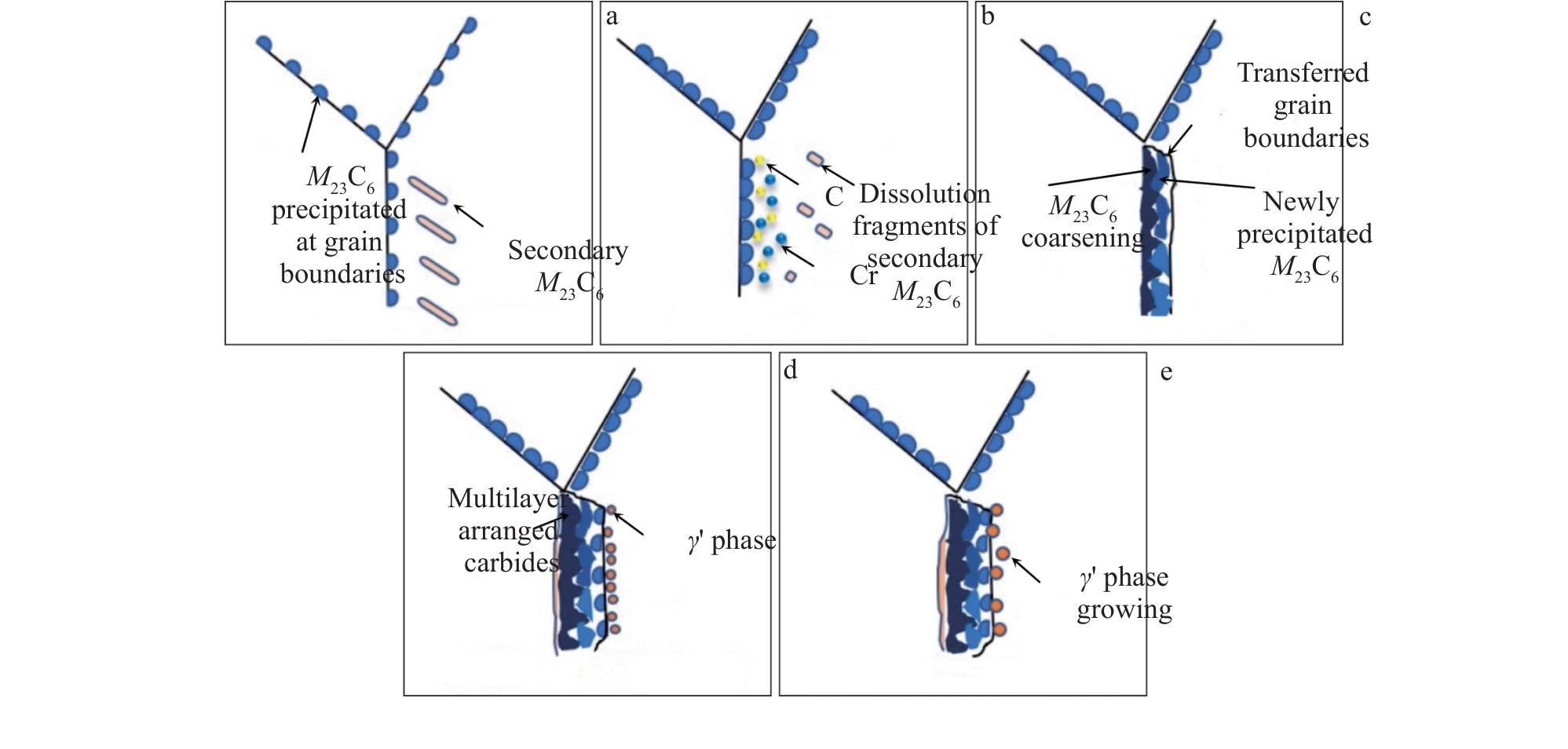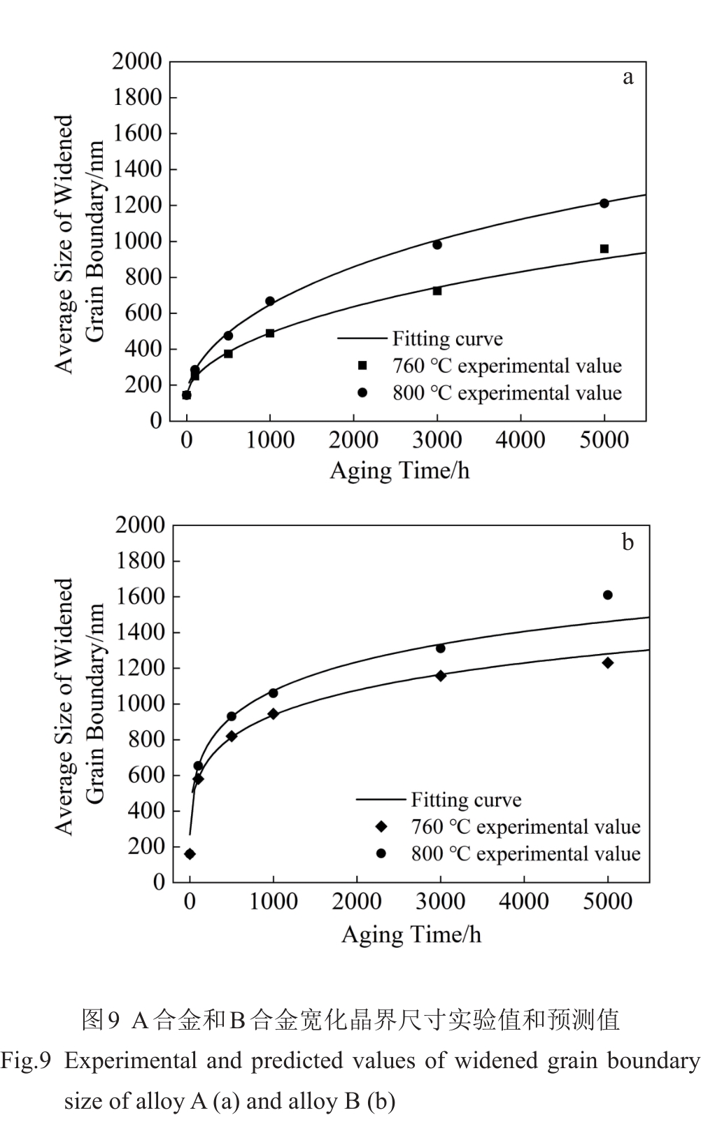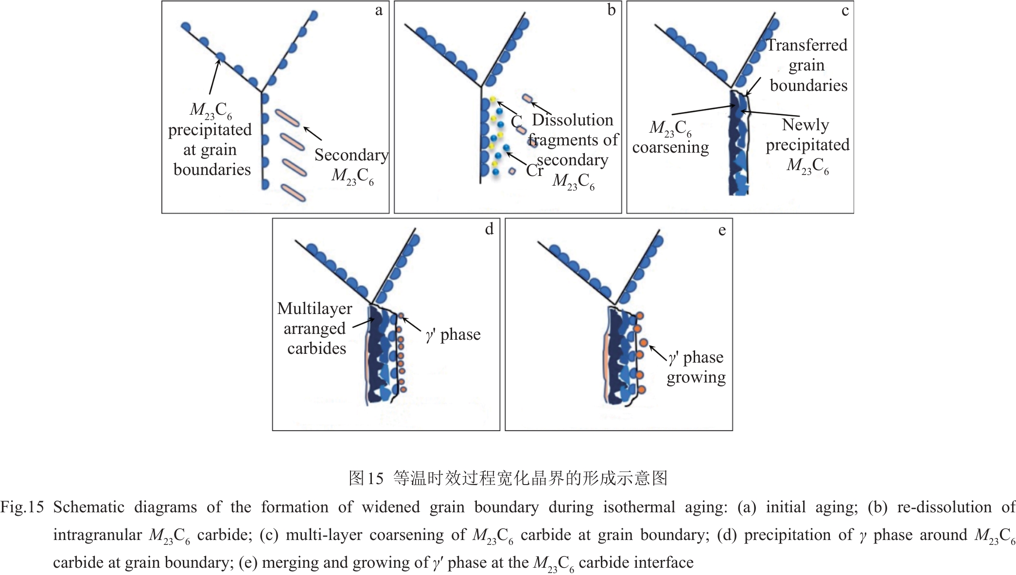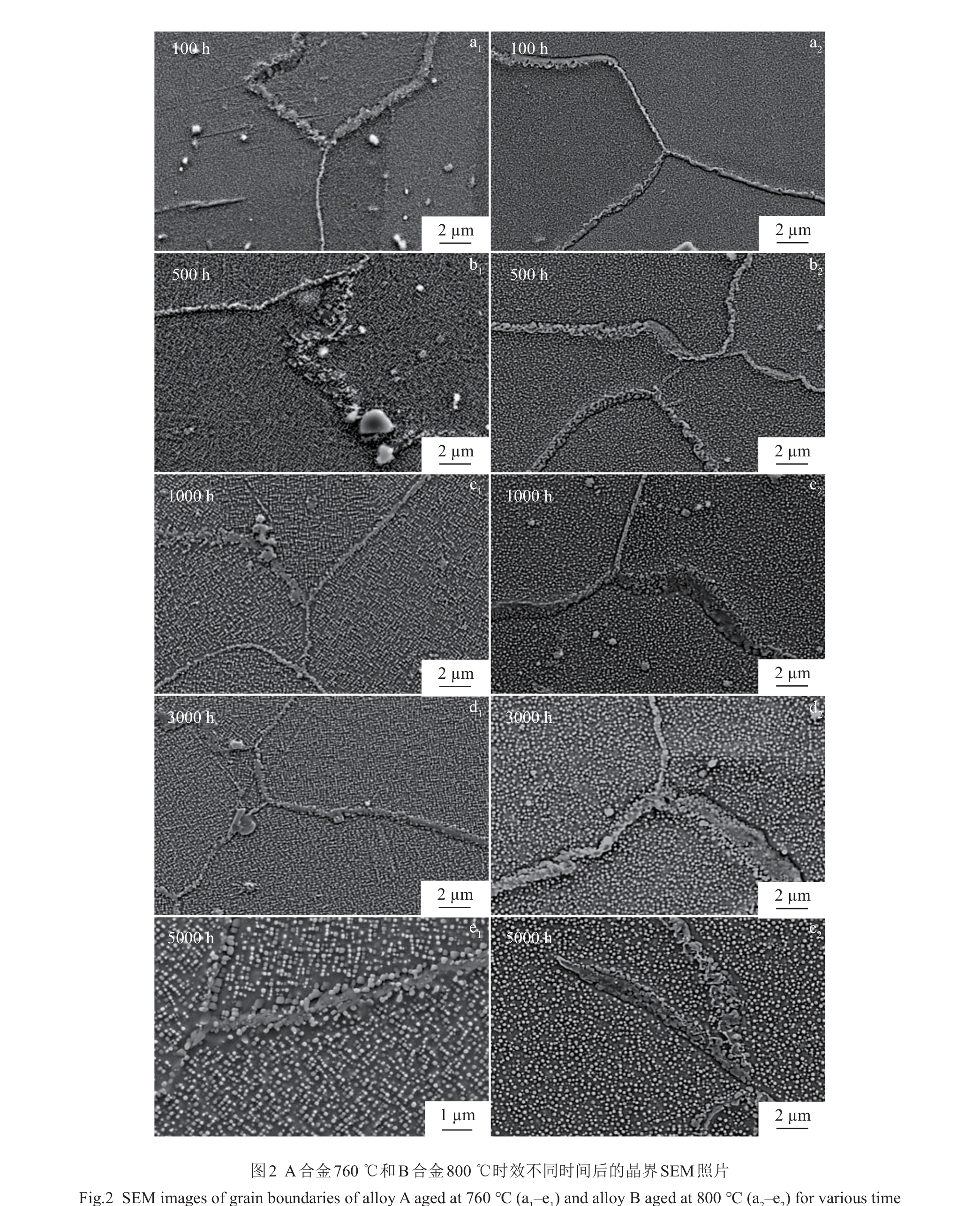 摘要:本研究以2种高参数先进超超临界电站过热器及再热器管材备选材料(合金A、合金B)为研究对象,系统分析了2种镍基高温合金在长期时效过程中的局部晶界宽化现象、晶界宽化动力学及晶界宽化机理。结果表明,2种合金高温长时时效过程宽化晶界区域内主要析出相为M23C6碳化物和晶界γ′相;2种合金宽化晶界随时效时间的演变遵循JMAK方程。长时时效过程2种合金晶界宽化分为3个阶段:阶段一,晶界附近M23C6碳化物回溶,导致晶界M23C6碳化物快速粗化,促使晶界发生迁移;阶段二,在晶界迁移后会析出新的M23C6碳化物,使得晶界区域M23C6碳化物呈多层排列,晶界宽度增加;阶段三,当碳化物粗化速率减慢,在M23C6/γ界面处会析出γ′相,晶界短路扩散,使得γ′相长大,晶界宽度进一步增加。