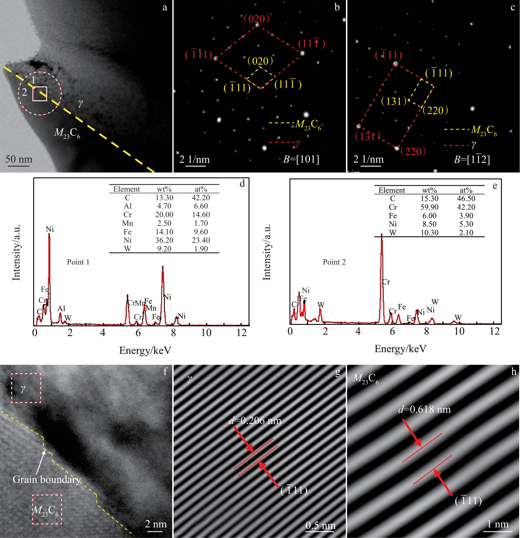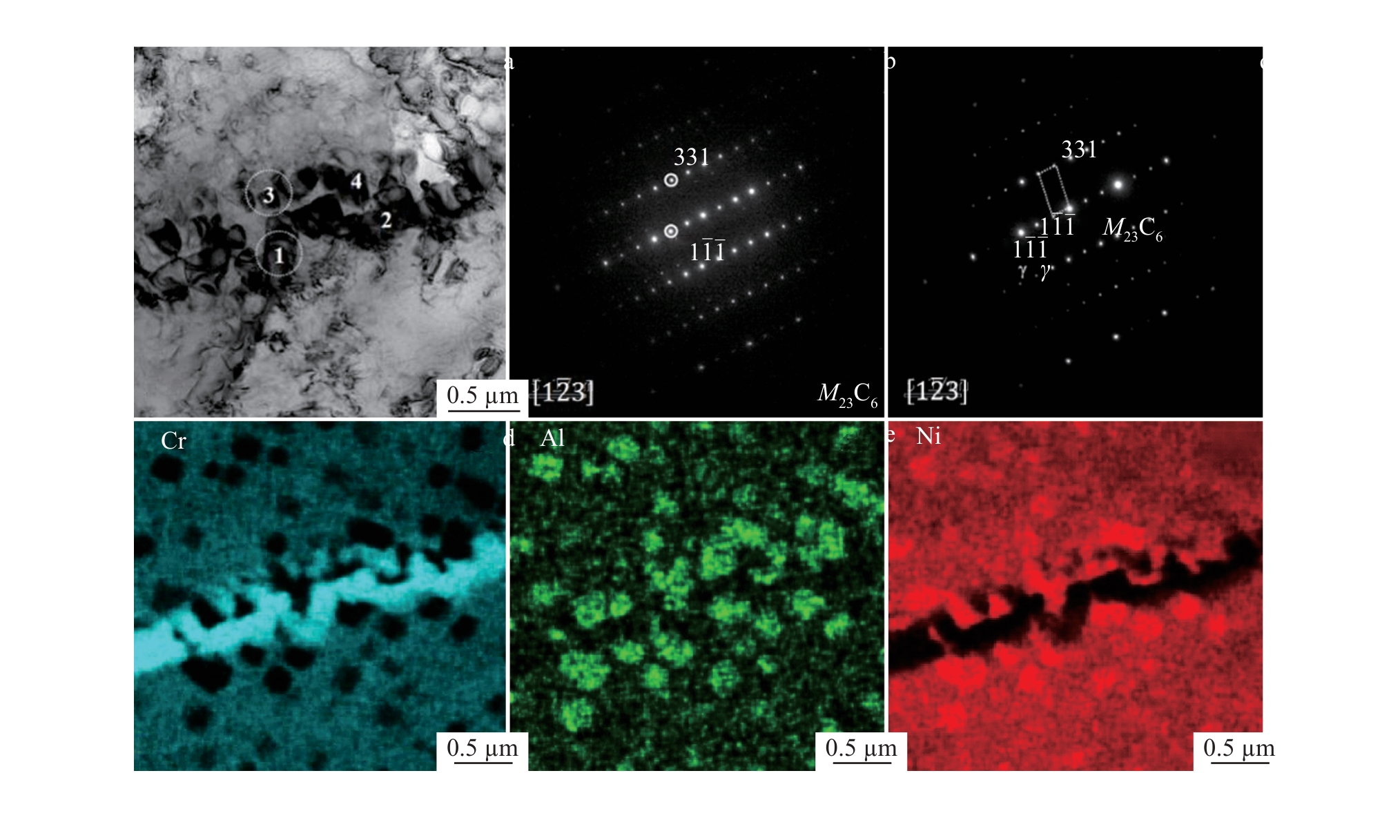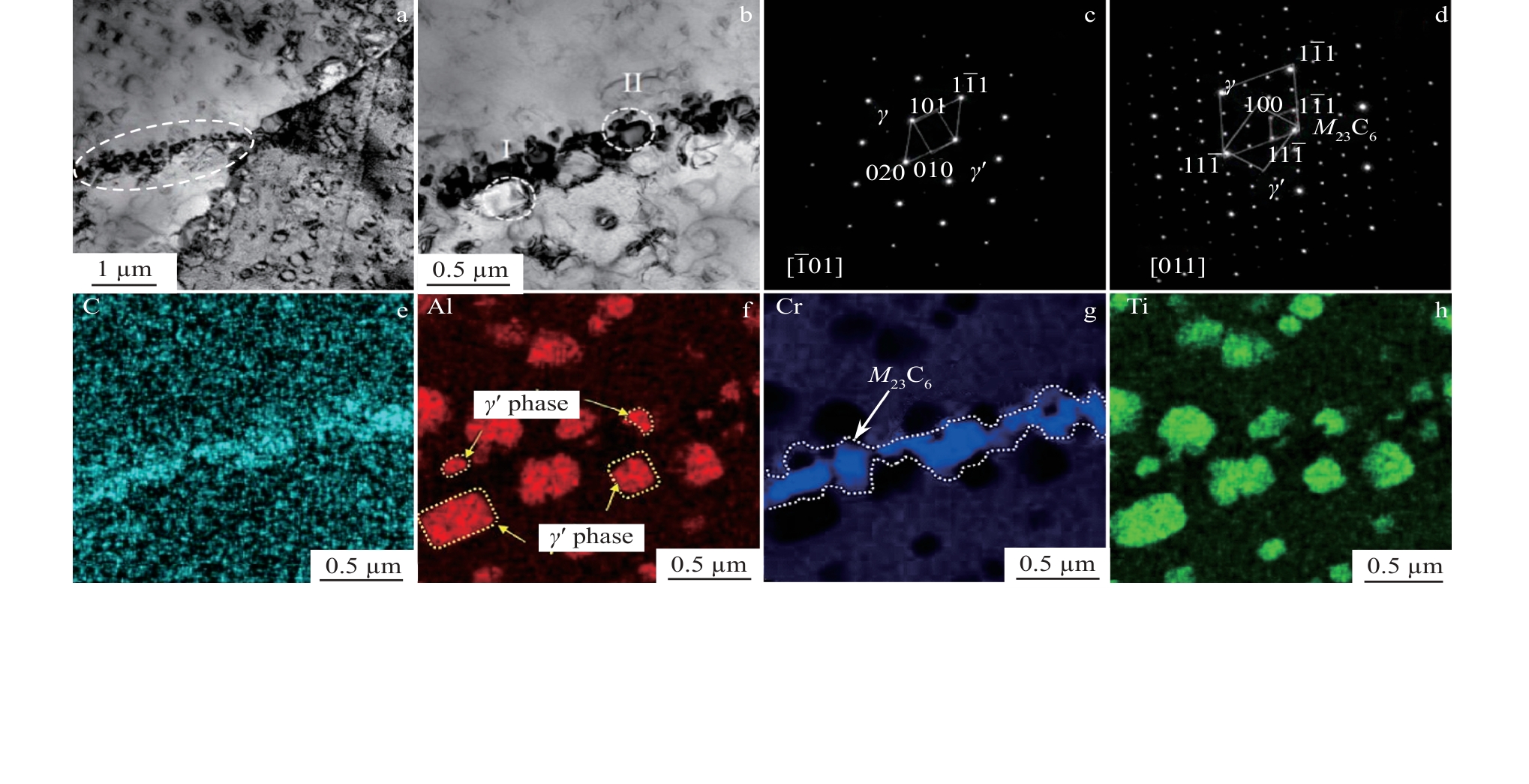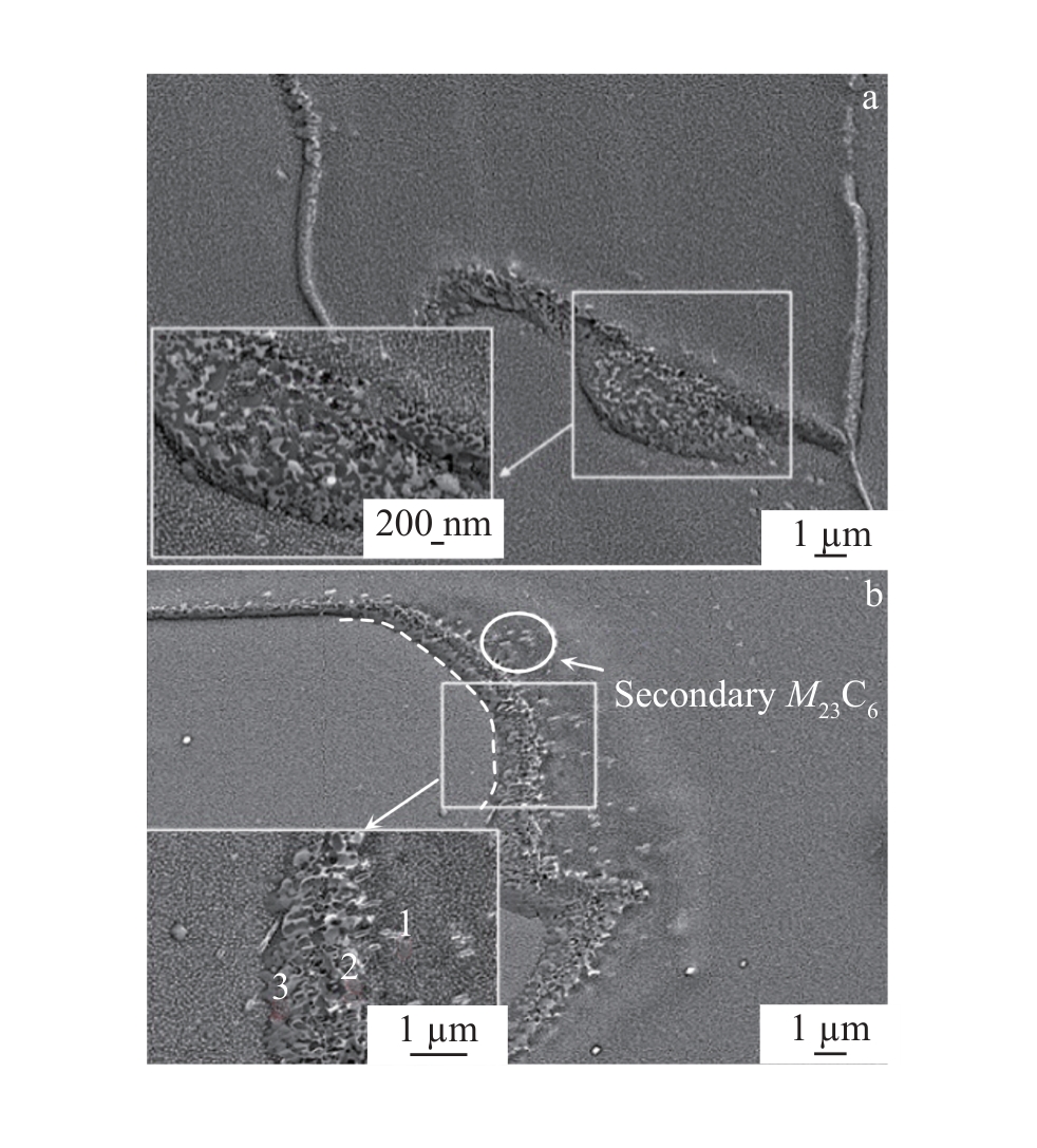 摘要:本研究以2种高参数先进超超临界电站过热器及再热器管材备选材料(合金A、合金B)为研究对象,系统分析了2种镍基高温合金在长期时效过程中的局部晶界宽化现象、晶界宽化动力学及晶界宽化机理。结果表明,2种合金高温长时时效过程宽化晶界区域内主要析出相为M23C6碳化物和晶界γ′相;2种合金宽化晶界随时效时间的演变遵循JMAK方程。长时时效过程2种合金晶界宽化分为3个阶段:阶段一,晶界附近M23C6碳化物回溶,导致晶界M23C6碳化物快速粗化,促使晶界发生迁移;阶段二,在晶界迁移后会析出新的M23C6碳化物,使得晶界区域M23C6碳化物呈多层排列,晶界宽度增加;阶段三,当碳化物粗化速率减慢,在M23C6/γ界面处会析出γ′相,晶界短路扩散,使得γ′相长大,晶界宽度进一步增加。