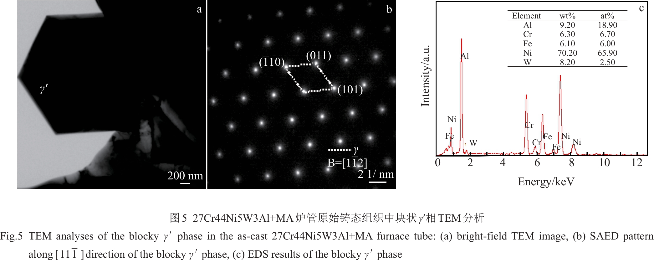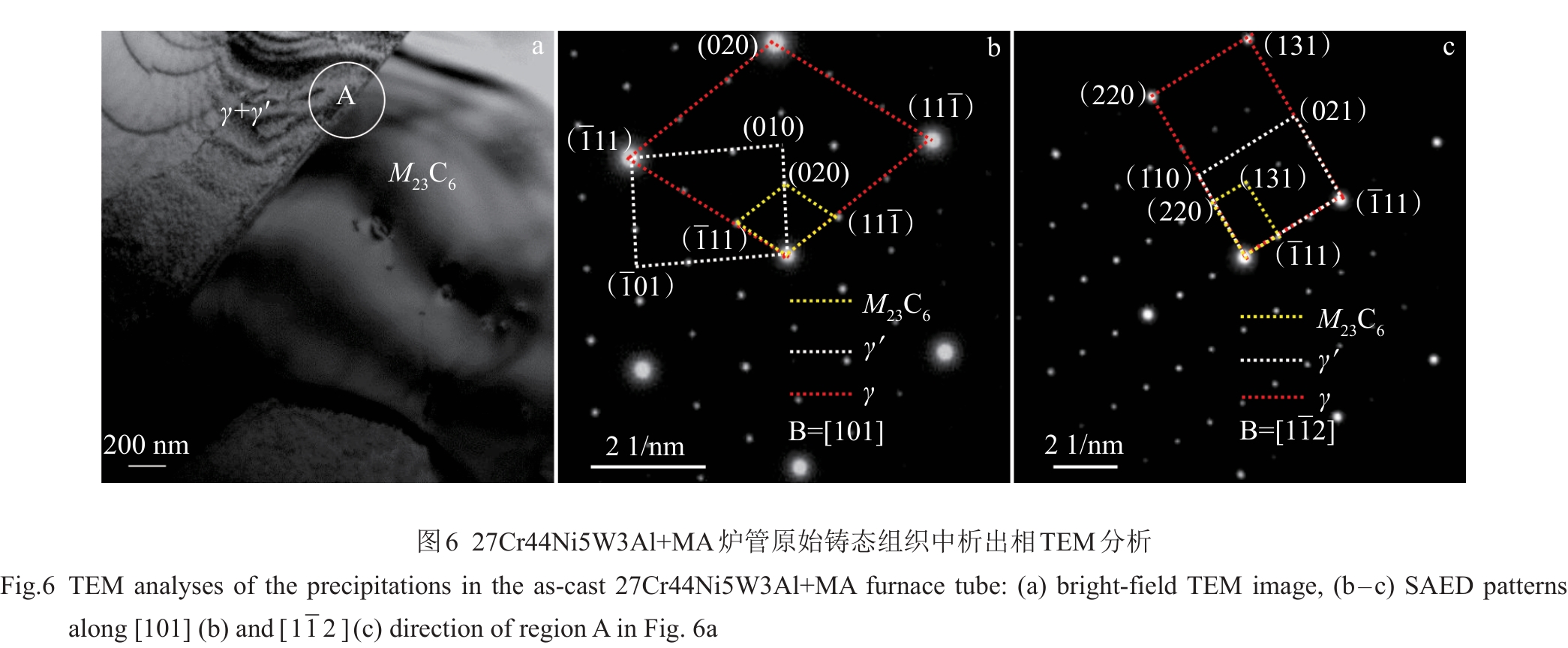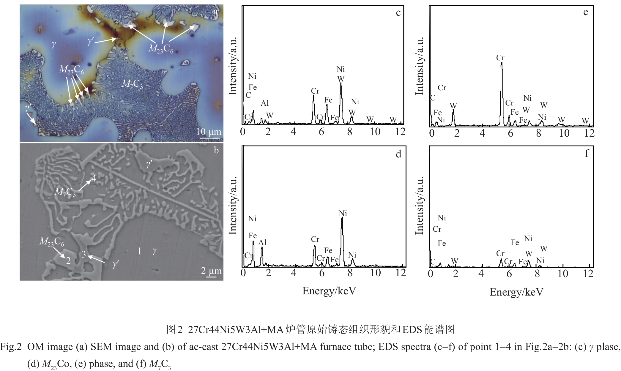摘要:为了探明离心铸造27Cr44Ni5W3Al+MA(微合金)乙烯裂解炉管的原始铸态组织,采用XRD、OM、SEM及TEM等对原始铸态炉管进行了相组成分析及显微组织表征。结果表明:炉管原始铸态组织主要为奥氏体基体(γ相)和晶界鱼骨状复相碳化物,其中复相碳化物内部为片层状M7C3,边缘为块状M23C6。此外,还观察到2种形态的Ni3Al(γ′相),分别为在M23C6与基体交界处附近弥散分布的颗粒状及与M23C6相邻的块状。γ相与M23C6及颗粒状γ′相之间均存在立方-立方的位向关系