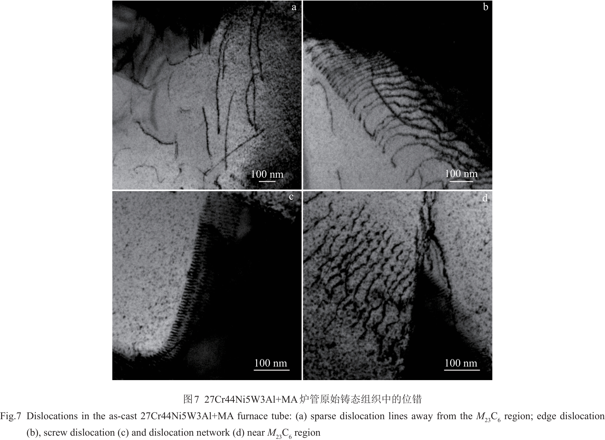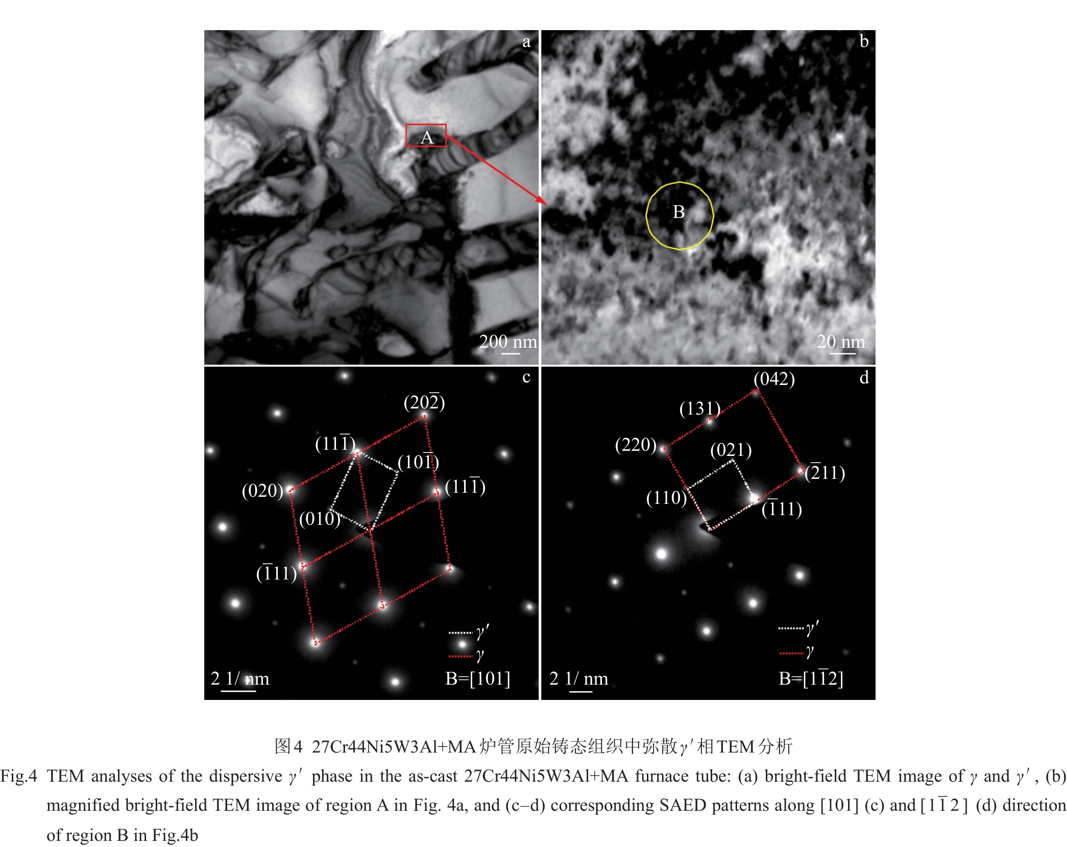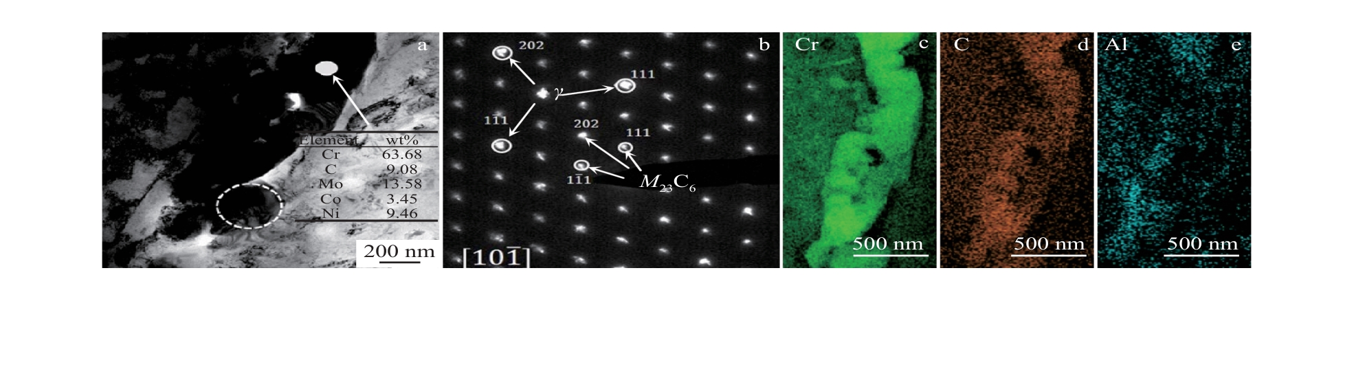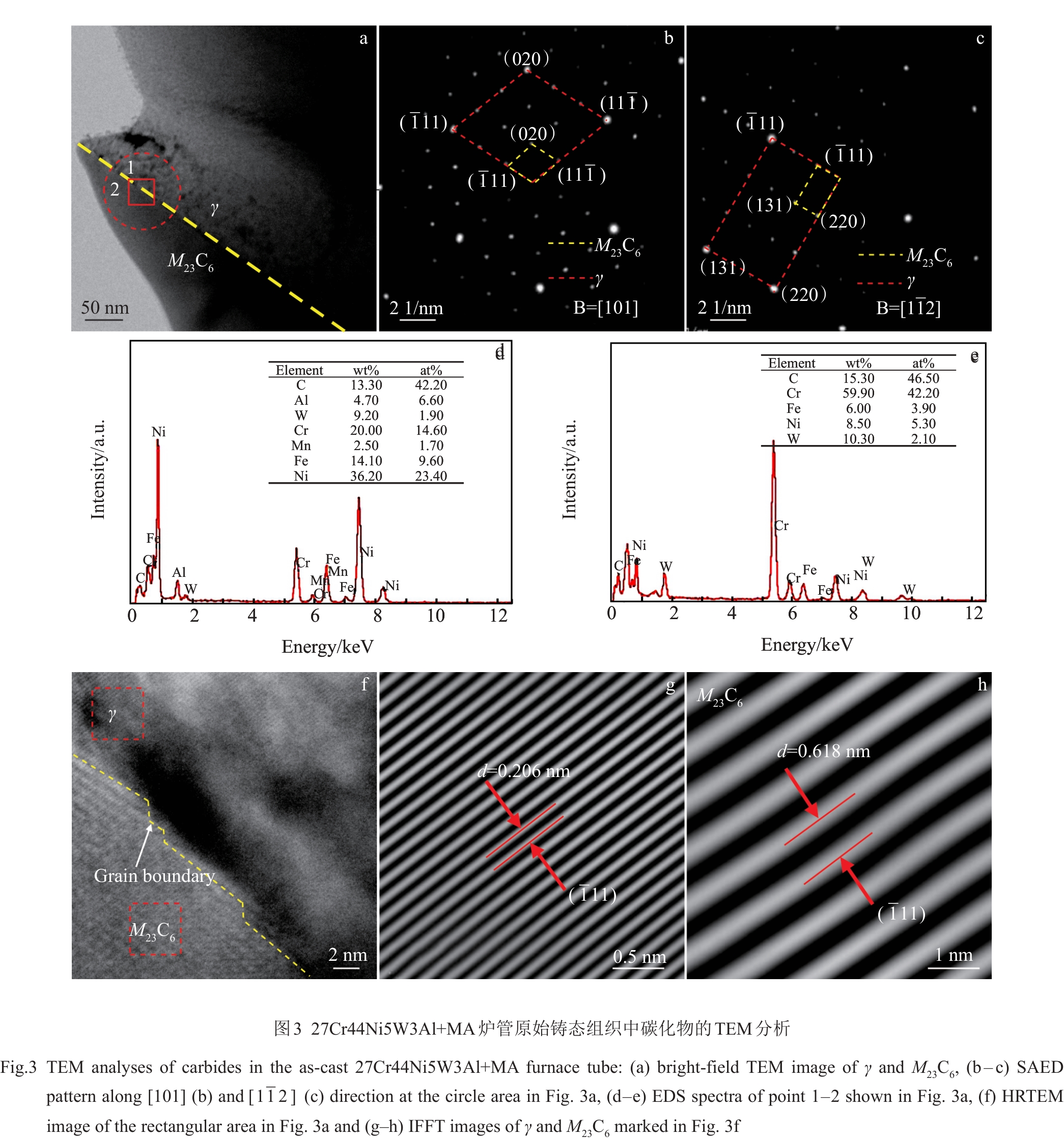 摘要:为了探明离心铸造27Cr44Ni5W3Al+MA(微合金)乙烯裂解炉管的原始铸态组织,采用XRD、OM、SEM及TEM等对原始铸态炉管进行了相组成分析及显微组织表征。结果表明:炉管原始铸态组织主要为奥氏体基体(γ相)和晶界鱼骨状复相碳化物,其中复相碳化物内部为片层状M7C3,边缘为块状M23C6。此外,还观察到2种形态的Ni3Al(γ′相),分别为在M23C6与基体交界处附近弥散分布的颗粒状及与M23C6相邻的块状。γ相与M23C6及颗粒状γ′相之间均存在立方-立方的位向关系