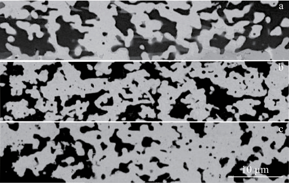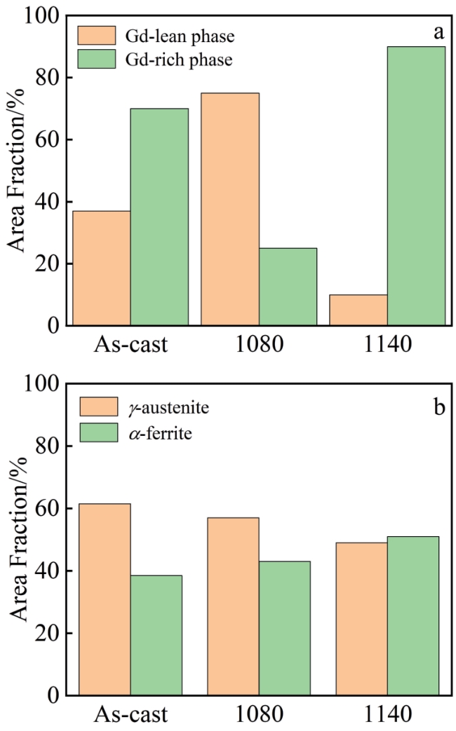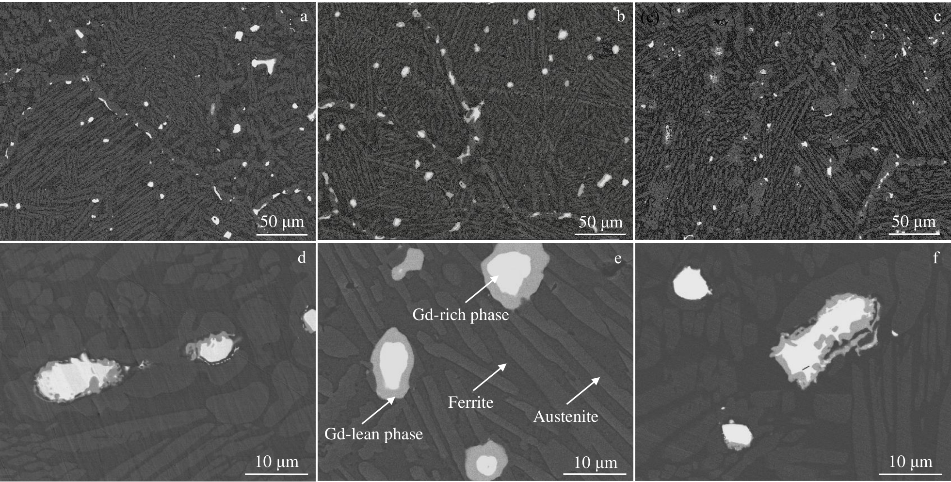摘要:研究了含1wt% Gd中子吸收双相不锈钢在不同温度时效后的微观结构与腐蚀行为。结果表明,材料中含Gd第二相的体积比以1080 ℃为转折点,先增后减。在1080 ℃时效处理的样品中,主要以第二相为双相M-Gd化合物(M=Fe,Cr,Ni),其核心为M3Gd相,外层为M12Gd相。在1140 ℃时效处理后,M3Gd为主要第二相。同时,研究了这两种样品在NaCl、HCl及H3BO3溶液中的腐蚀行为。1140 ℃处理后的样品具有相对较低的腐蚀速率。在NaCl和HCl溶液中,M3Gd较M12Gd具有较高的电化学活性;而在H3BO3溶液中,M3Gd则较为稳定。