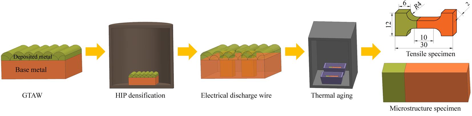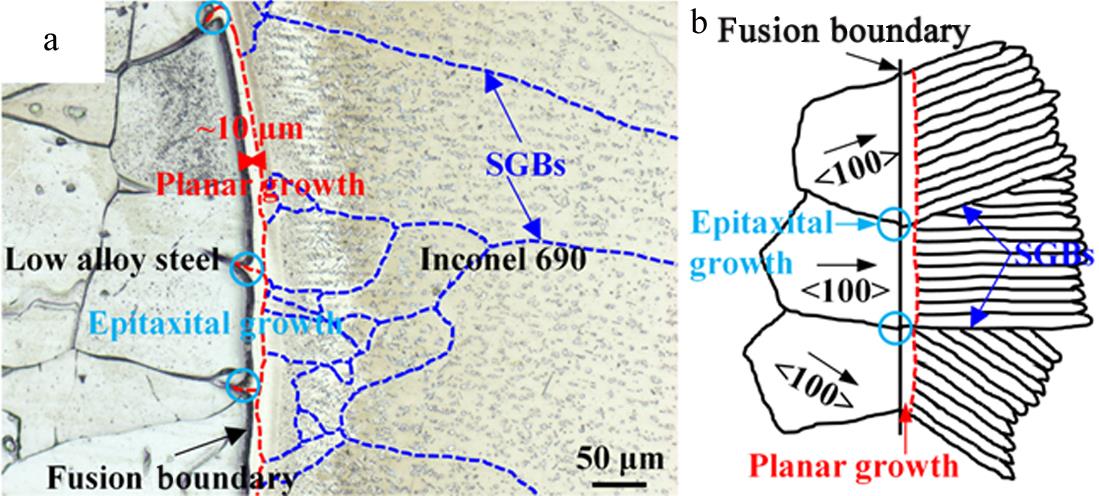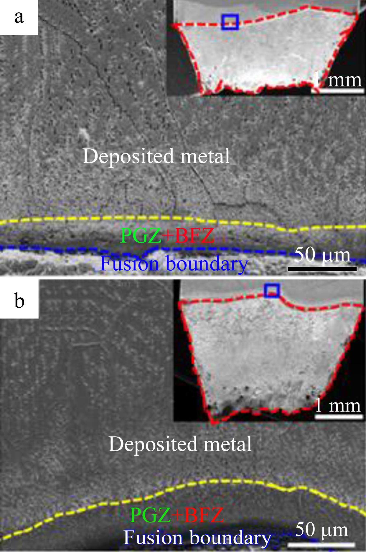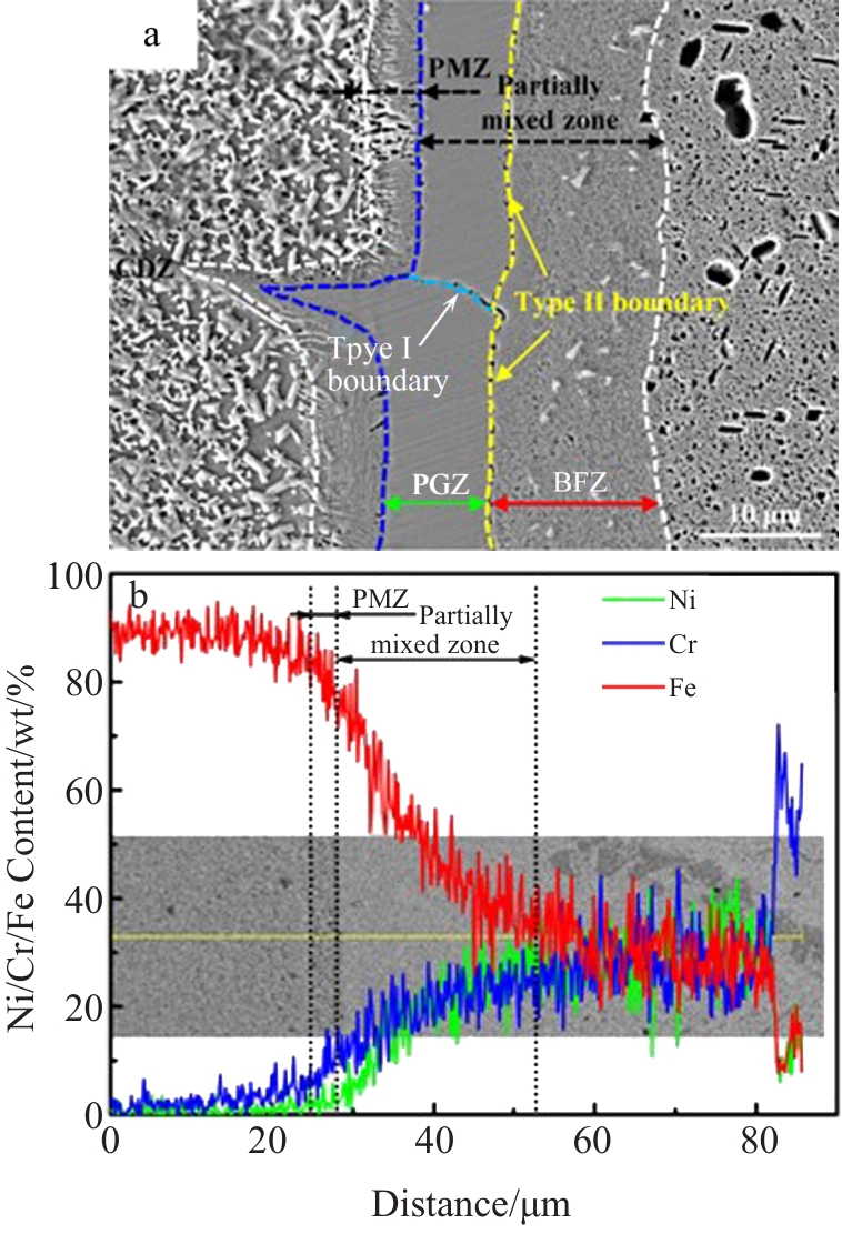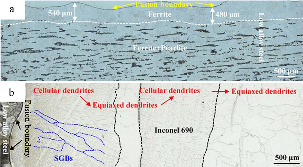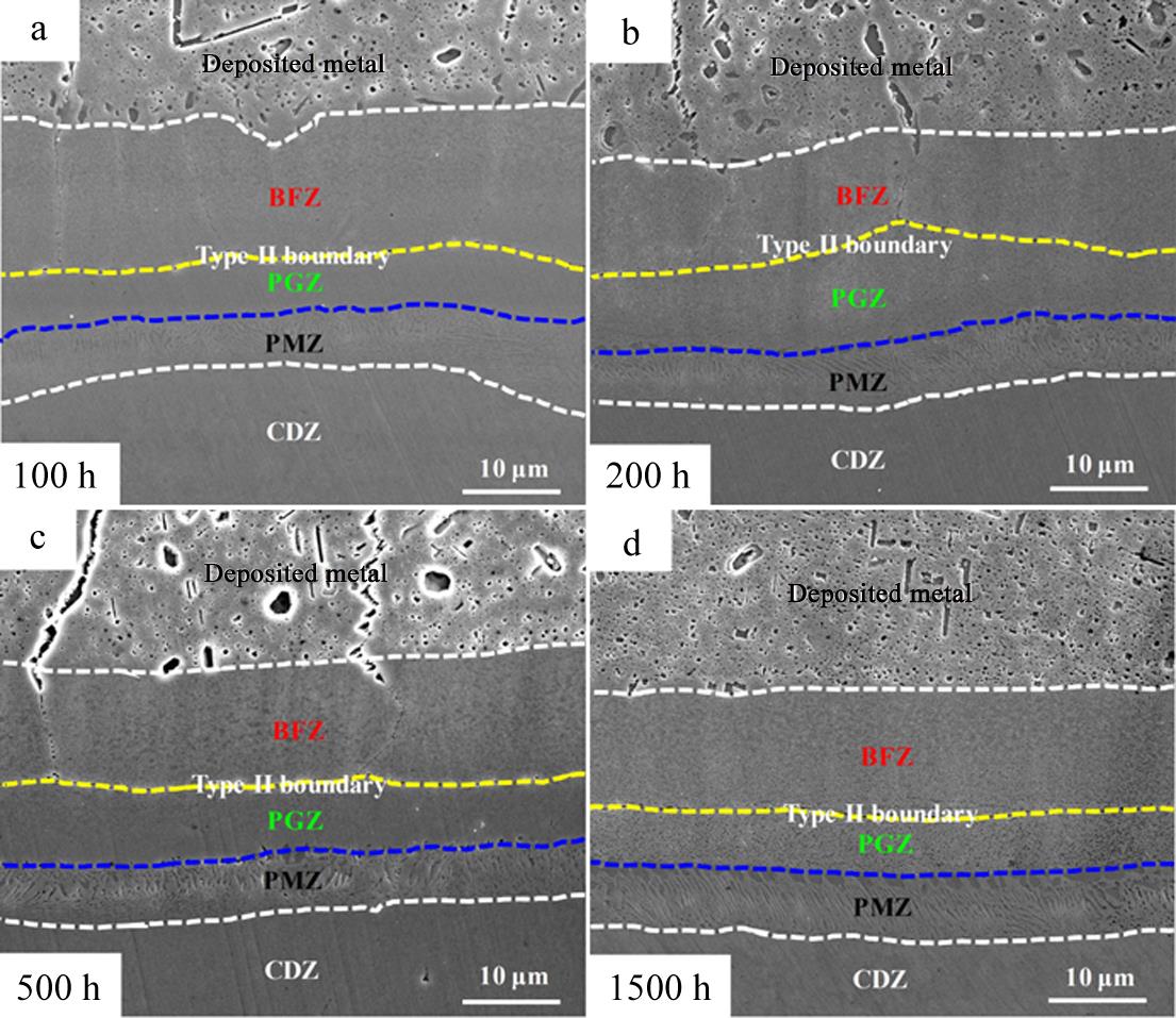 摘要:在600 ℃时效处理过程中,对热等静压致密化处理的低合金钢上堆焊Inconel 690界面微观结构、显微硬度和拉伸性能进行了研究。结果表明,从基体到堆焊层,界面区域可以分为4个区:贫碳区(CDZ)、局部熔化区(PMZ)、平面生长区(PGZ)和棕色特征区(BFZ)。这些区域的尺寸在时效过程中没有显著变化。然而,I型碳化物在PMZ中明显增大,而在PGZ中出现明显沉淀。它们长大和出现的主要原因是时效过程中连续的碳迁移。界面最高显微硬度出现在PGZ和BFZ区域,这与该区域中碳的堆积和沉淀有关。由于这2种材料之间较高的强度不匹配性,拉伸失效发生在基体侧。由于CDZ仅由铁素体组成,强度较低,断裂通常发生在CDZ和基体的界面处。在经过1500 h的时效处理后,抗拉伸强度仅降低了50 MPa,并且界面区域保持高强度且无明显变形。