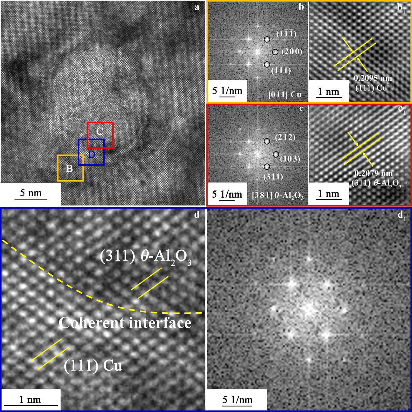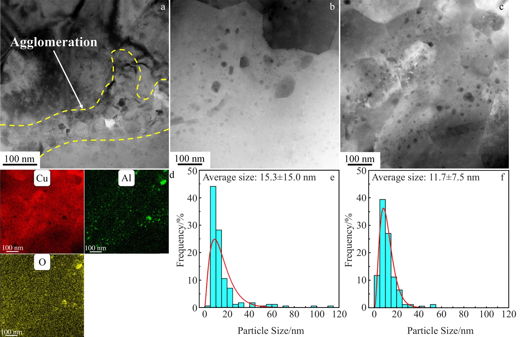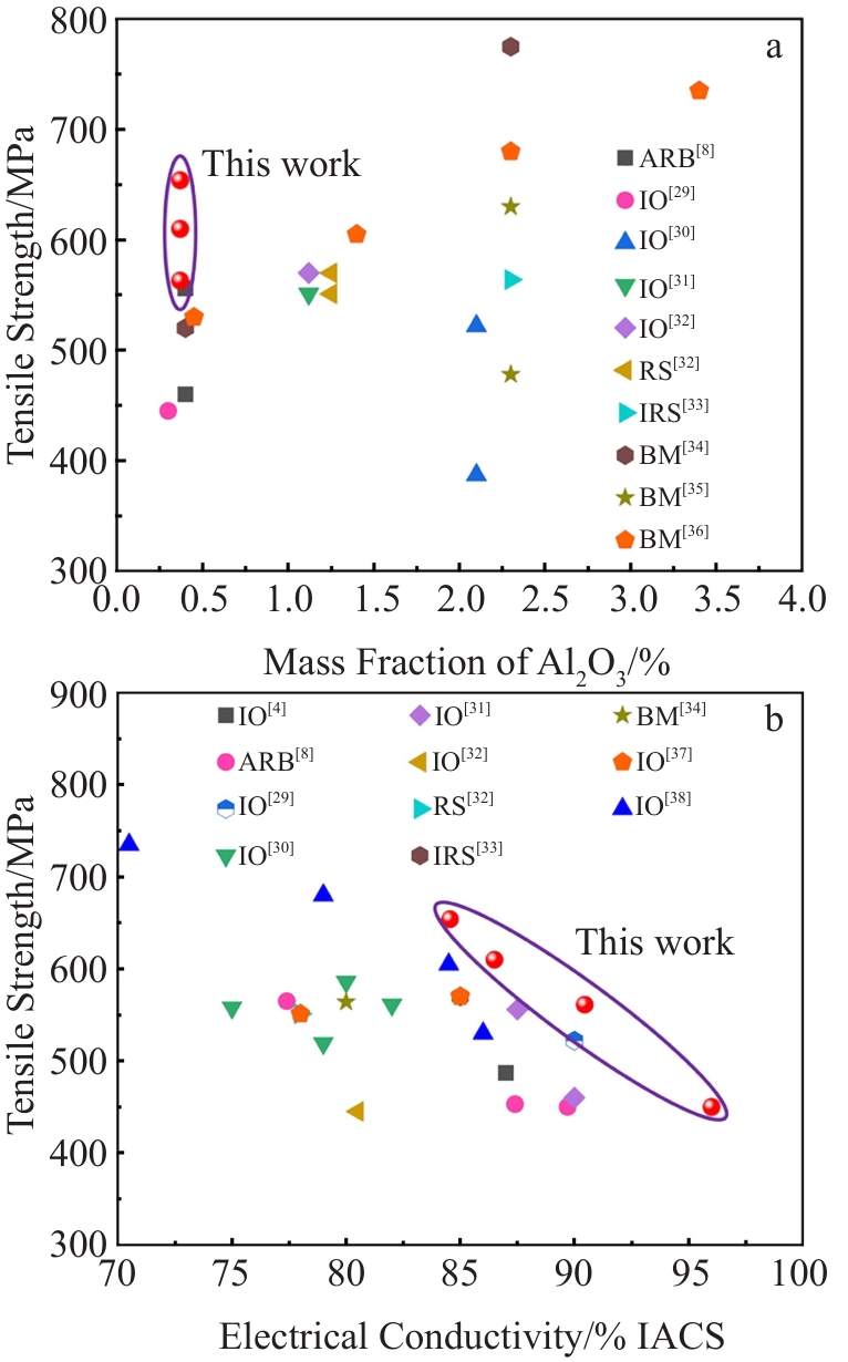 摘要:高强度Cu/Al2O3复合材料与其低强度相比时通常展现出明显恶化的导电性。基于一种化学和机械合金化策略,制备了低含量增强体超细复合粉末并构建超细铜粉负载原位自生Al2O3纳米颗粒组合结构。在相对较低的烧结温度(550 ℃)固结后,引入高体积分数超细晶到Cu/Al2O3复合材料中,产生大量平均尺寸为11.7±7.5 nm的原位自生Al2O3纳米颗粒,其均匀分布在铜晶粒内部。结果表明,复合材料表现出优异的高强度(654±1 MPa)与高导电(84.5±0.1% IACS)组合,这主要归因于超细晶、位错和原位自生Al2O3纳米颗粒的协同强化效果。这种以低含量增强体超细复合粉末为前驱体随后低温高压烧结的方法可应用于高性能氧化物弥散强化合金的大规模工业生产。